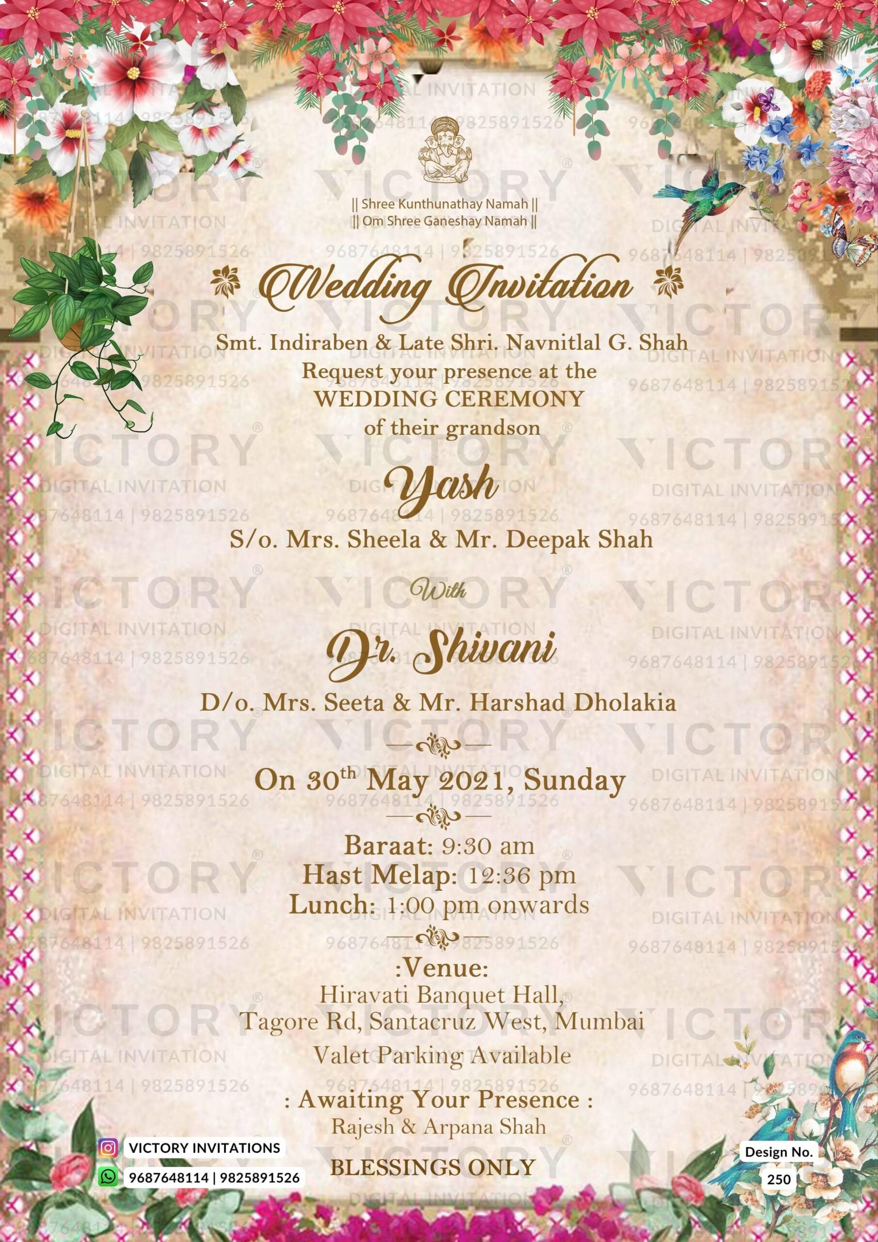 Traditional and royal couple caricature invitation card for wedding ceremony of hindu maharashtrian marathi family in english language with Floral Vintage theme design 250