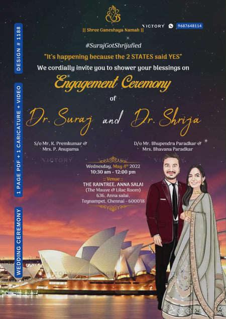 traditional couple caricature invitation card for Engagement ceremony in Englsih language with Sydney Opera House theme design 1188