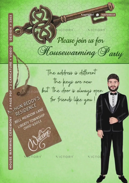 Traditional couple caricature invitation card for House Warming ceremony in English language with key, leaves as floral theme design 3363