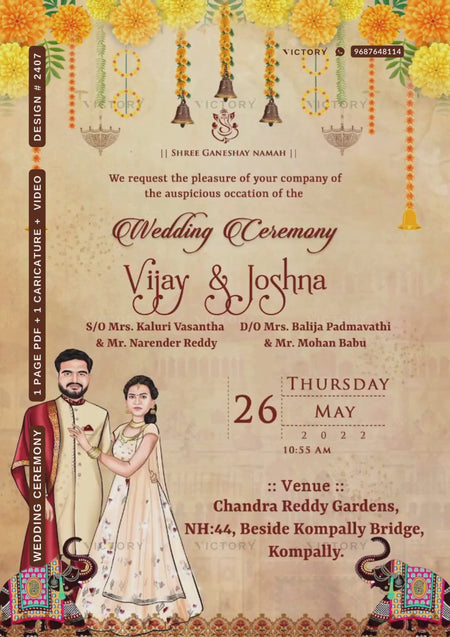 The marigold vintage Theme of the Hindu South Indian Traditional couple caricature digital invitation card for a wedding ceremony in beige background color. This e-invite card is perfectly suitable for the Telugu family and it's available in the English language. It includes elements such as marigold flowers, leaves, bells, elephants, umbrellas, and Ganesh icon.