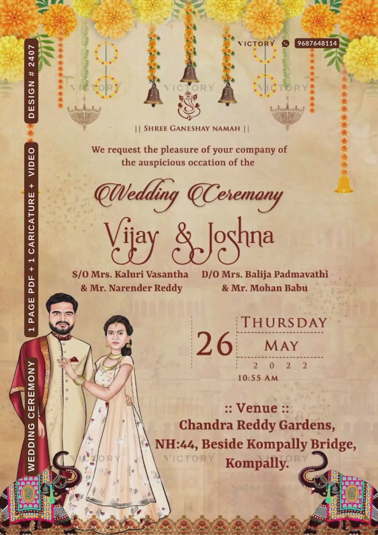 Traditional couple caricature invitation card for the wedding ceremony of Hindu south indian telugu family in english language with marigold vintage theme design 2407
