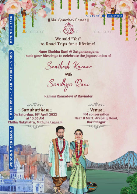 The temple and two-state Theme of the Hindu South Indian Traditional couple caricature digital invitation card for a wedding ceremony in pastel pink and green background color. This e-invite card is perfectly suitable for Telugu families and it's available in English language. It includes elements such as roses, leaves, bells, temples, bridges, and Ganesh icons.