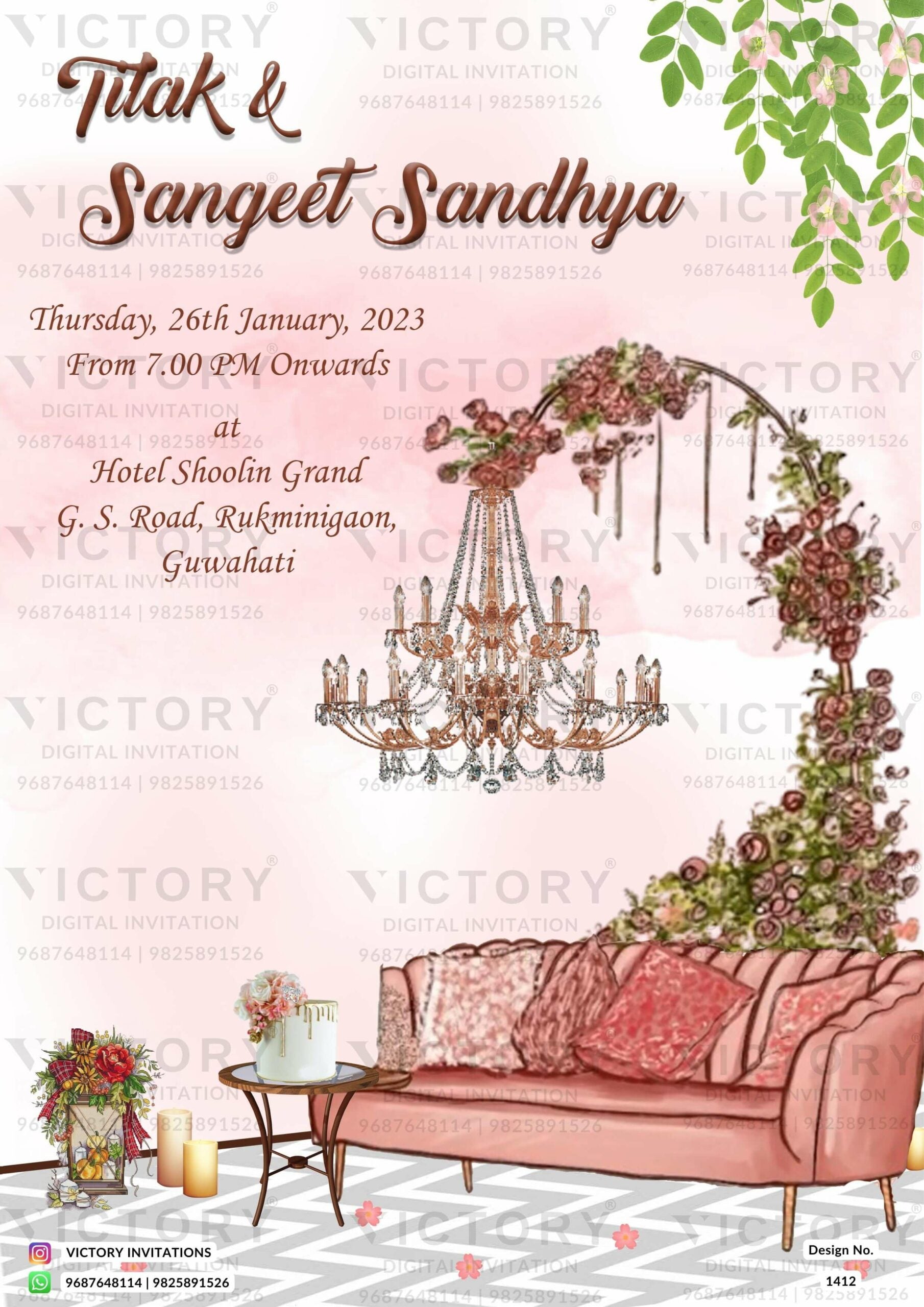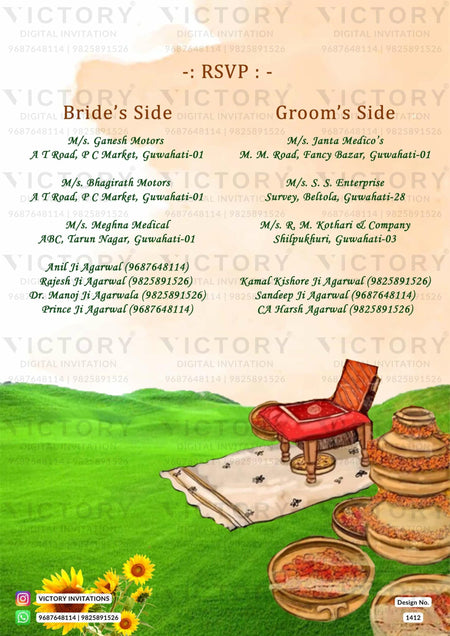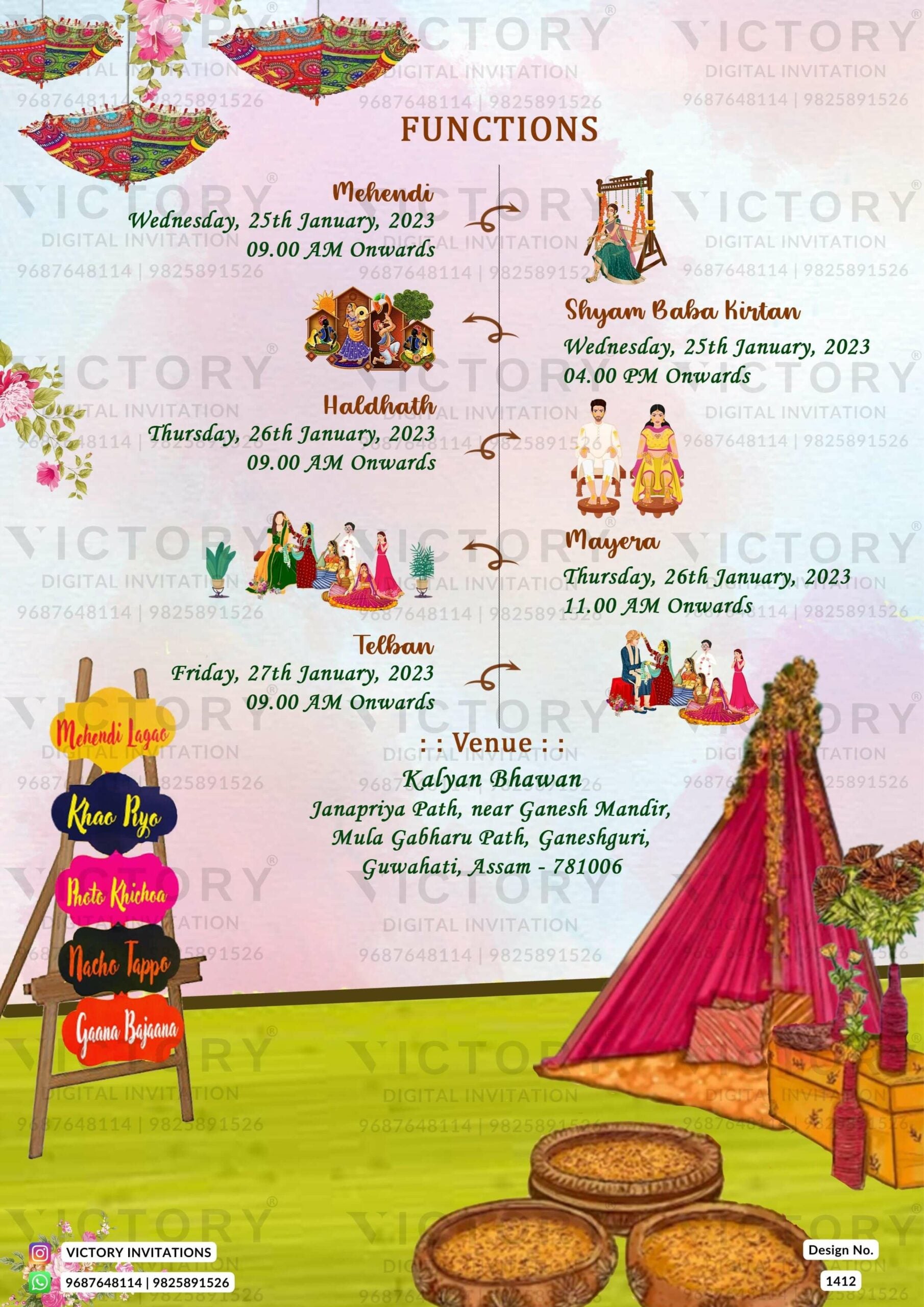 Traditional couple caricature invitation card for wedding ceremony of Assamese family in english language with royal theme design 1412