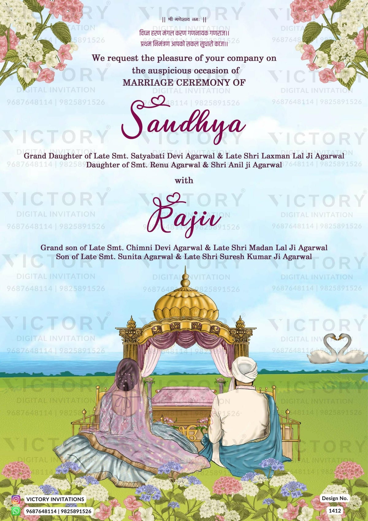 The royal Theme of the Hindu maharashtrian Traditional couple caricature digital invitation card for wedding ceremony in pink, sky blue background color. This e-invite card is perfectly suitable for Assamese family and it's available in English language. It includes elements such as marigold flowers, pillar, diya, bells.