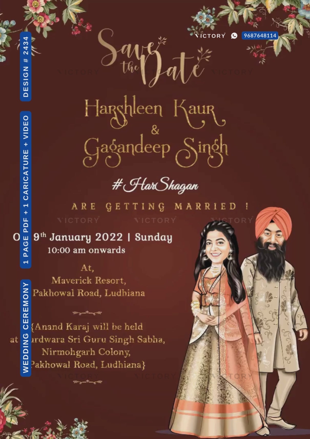 Traditional couple caricature invitation card for wedding ceremony of hindu punjabi sikh family in english language with Floral theme design 2434