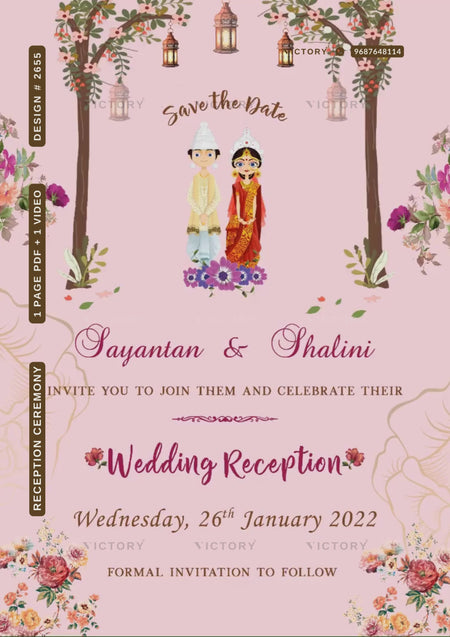 The minimalistic Theme of the Hindu digital invitation card for a wedding ceremony is in light pink background color. This e-invite card is perfectly suitable for the bengali family and it's available in English language. It includes elements such as a Bengali couple doodle, a golden flower design, red flowers, purple flowers, a lantern, tree.