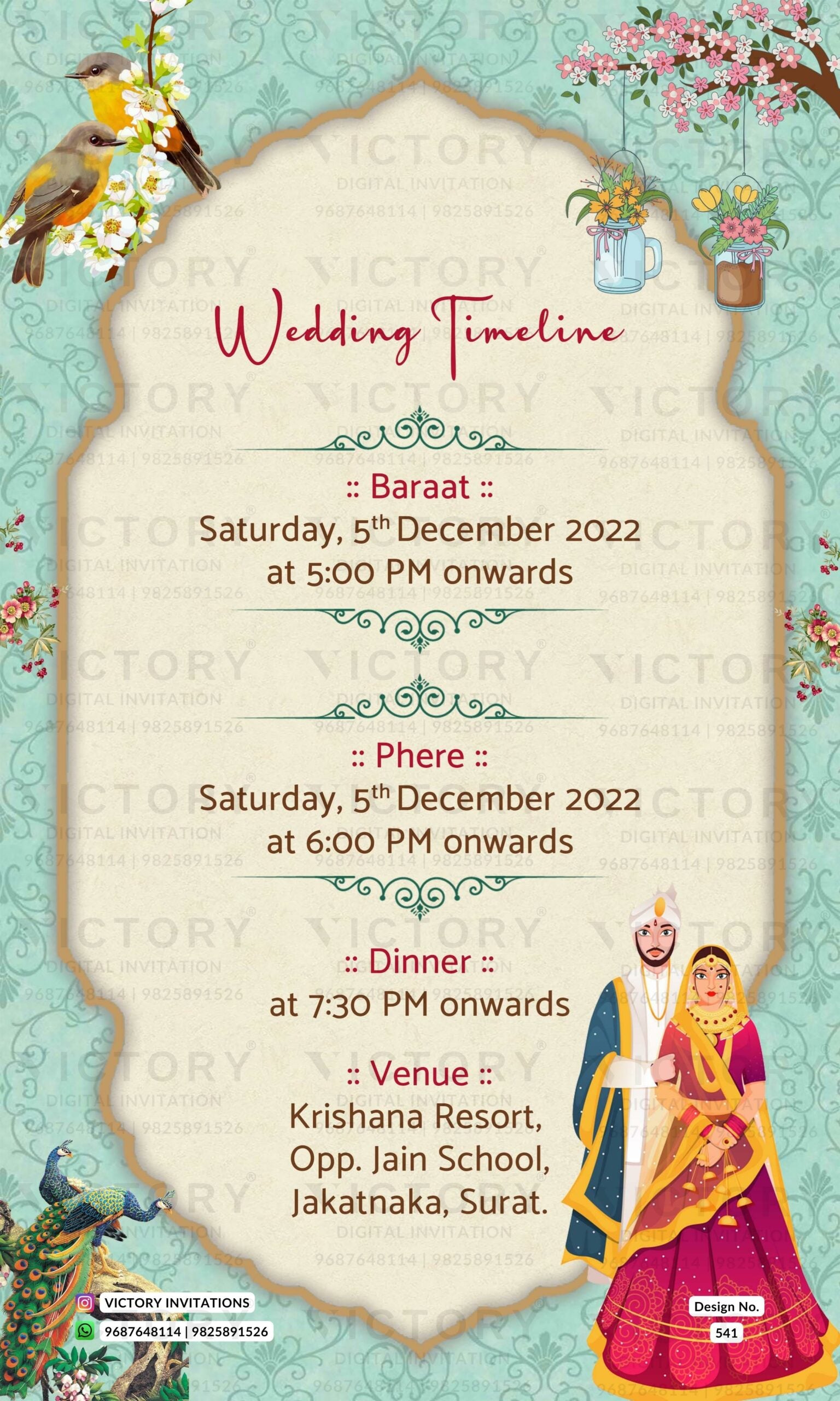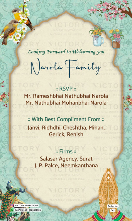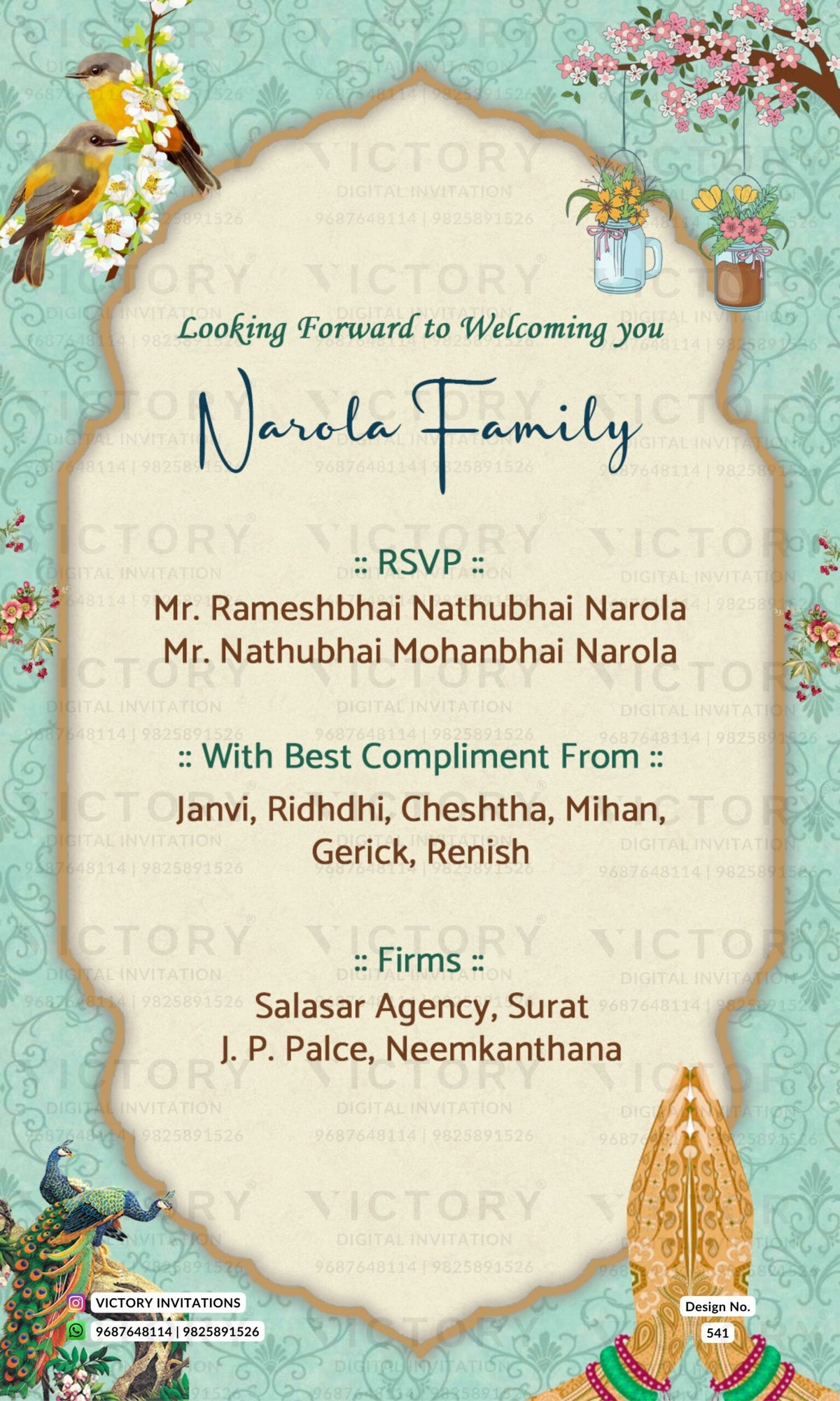 The traditional Theme of the Hindu Gujarati digital invitation card for a wedding ceremony is in cream, blue background color. This e-invite card is perfectly suitable for the kathiyawadi family and it's available in the English language. It includes elements such as birds, lanterns, pink flowers, elephants, an arch, a Ganesha logo, a vintage peacock, a lotus, a haldi couple doodle, a sangeet couple doodle, a wedding couple doodle, a namaste icon.