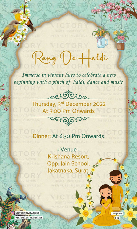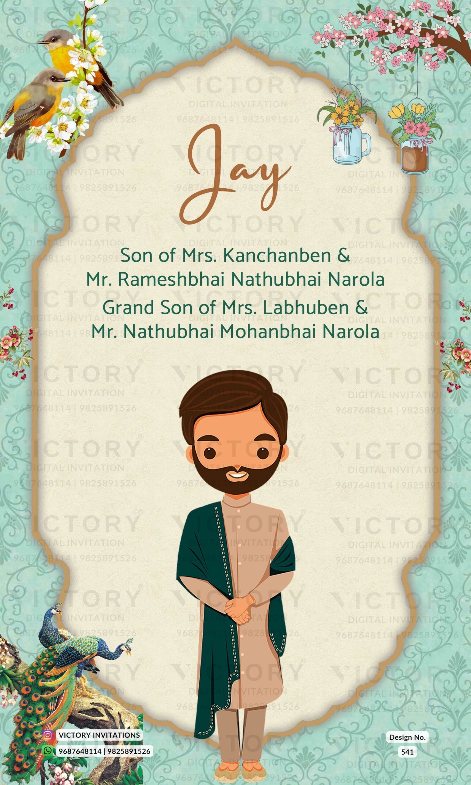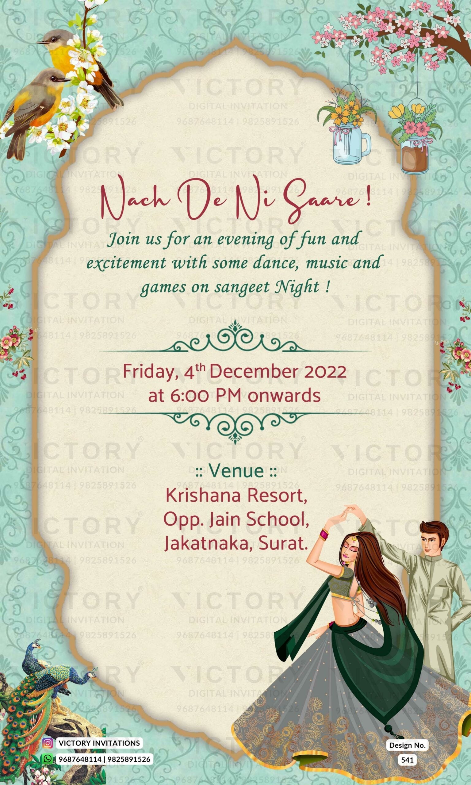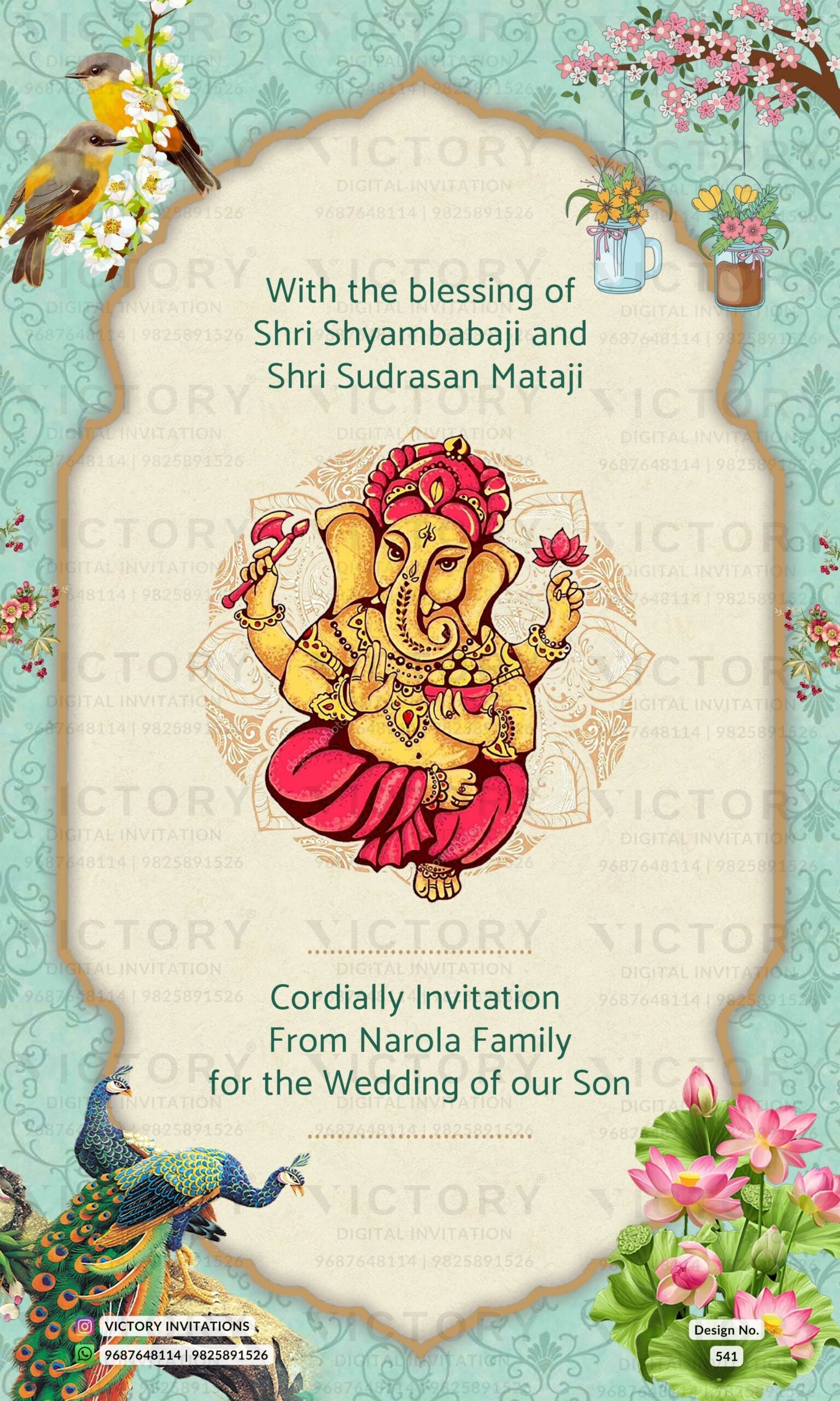 The traditional Theme of the Hindu Gujarati digital invitation card for a wedding ceremony is in cream, blue background color. This e-invite card is perfectly suitable for the kathiyawadi family and it's available in the English language. It includes elements such as birds, lanterns, pink flowers, elephants, an arch, a Ganesha logo, a vintage peacock, a lotus, a haldi couple doodle, a sangeet couple doodle, a wedding couple doodle, a namaste icon.