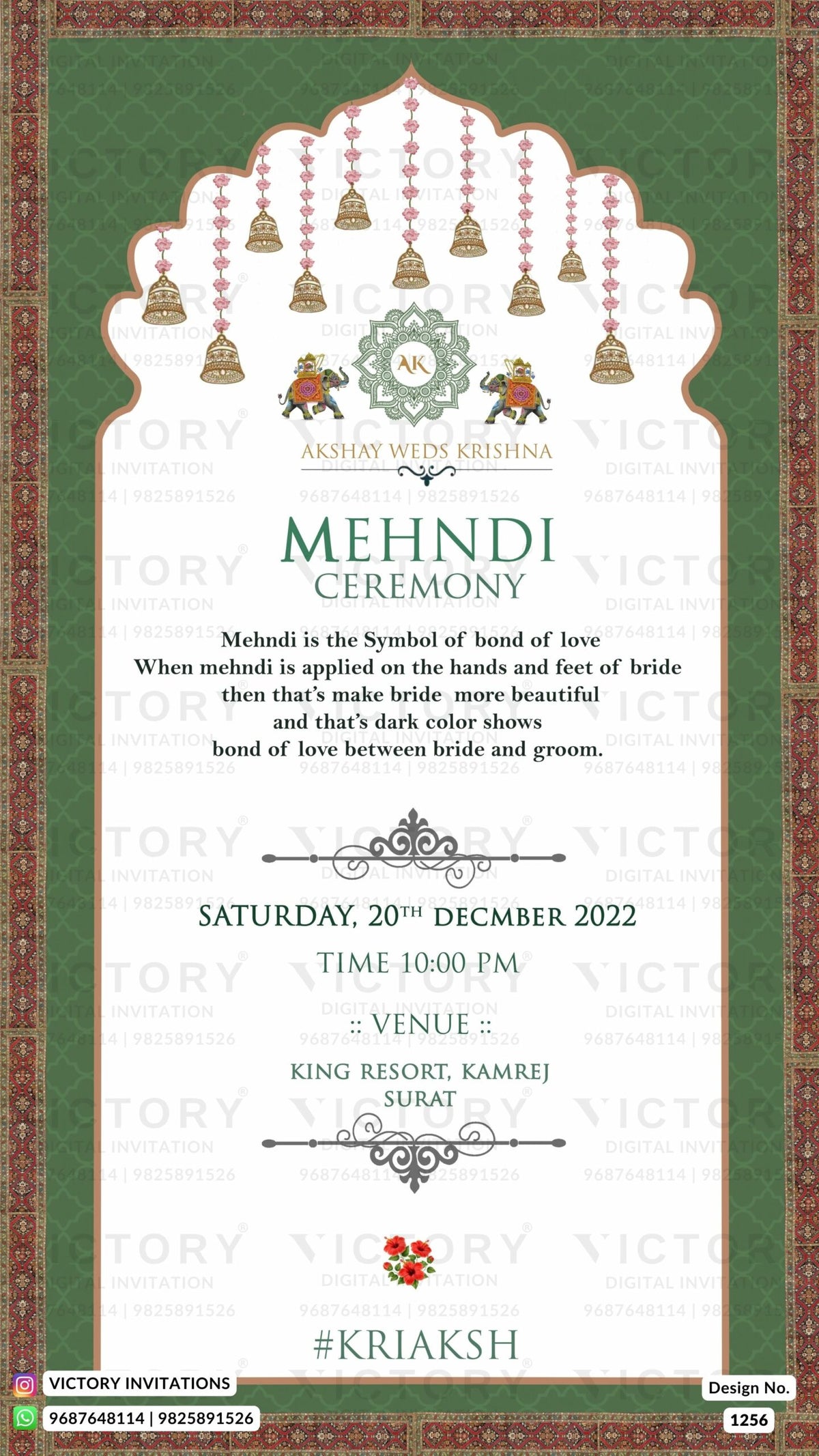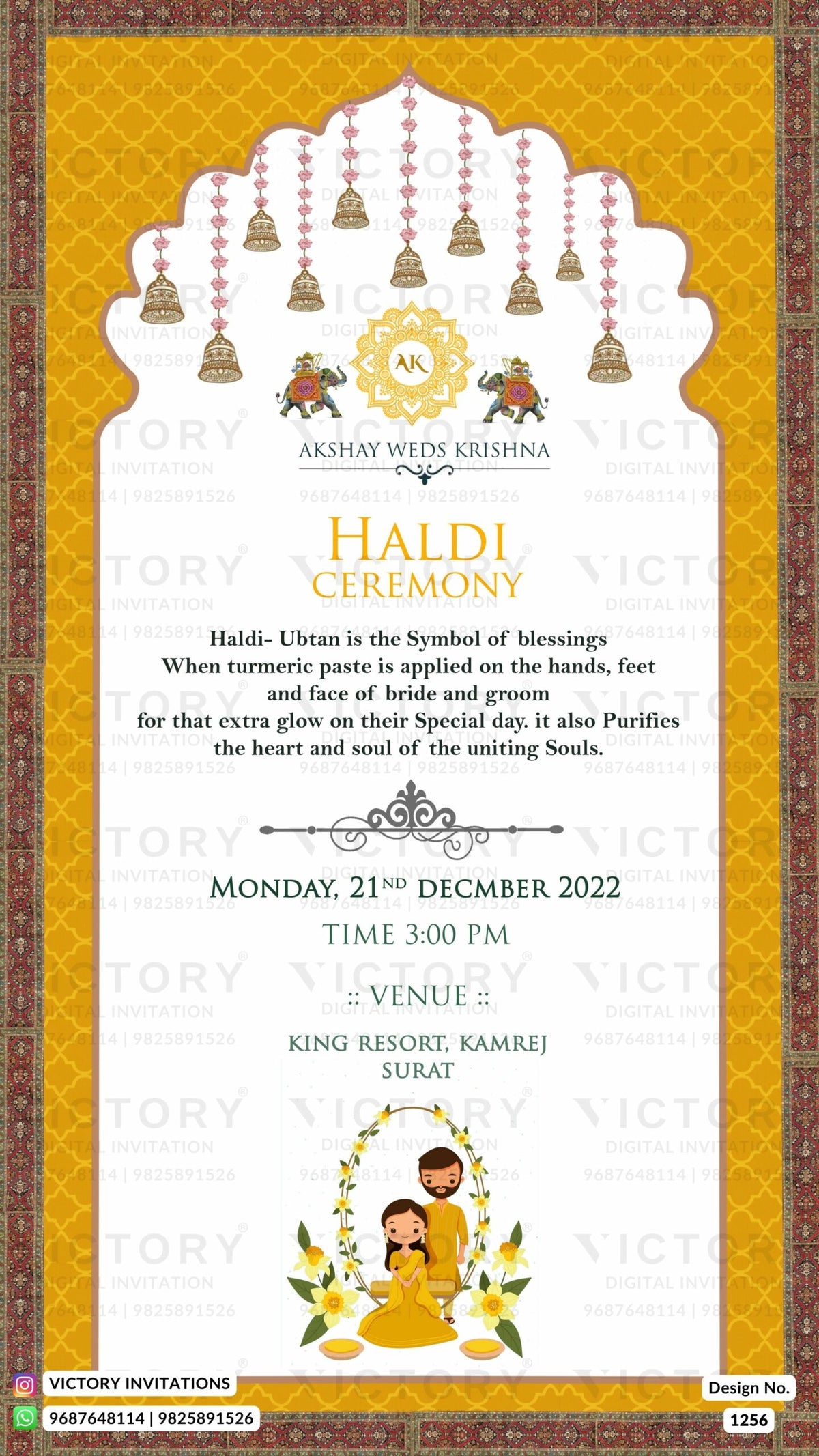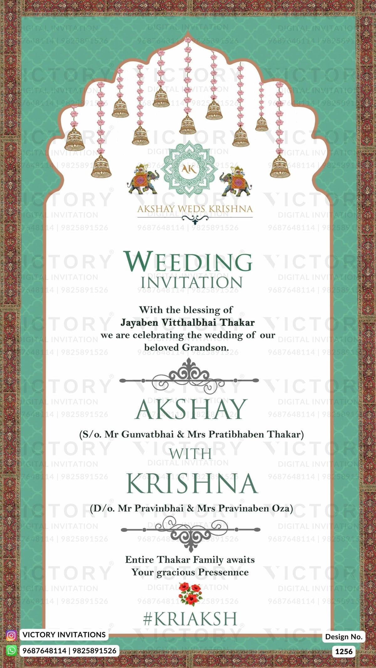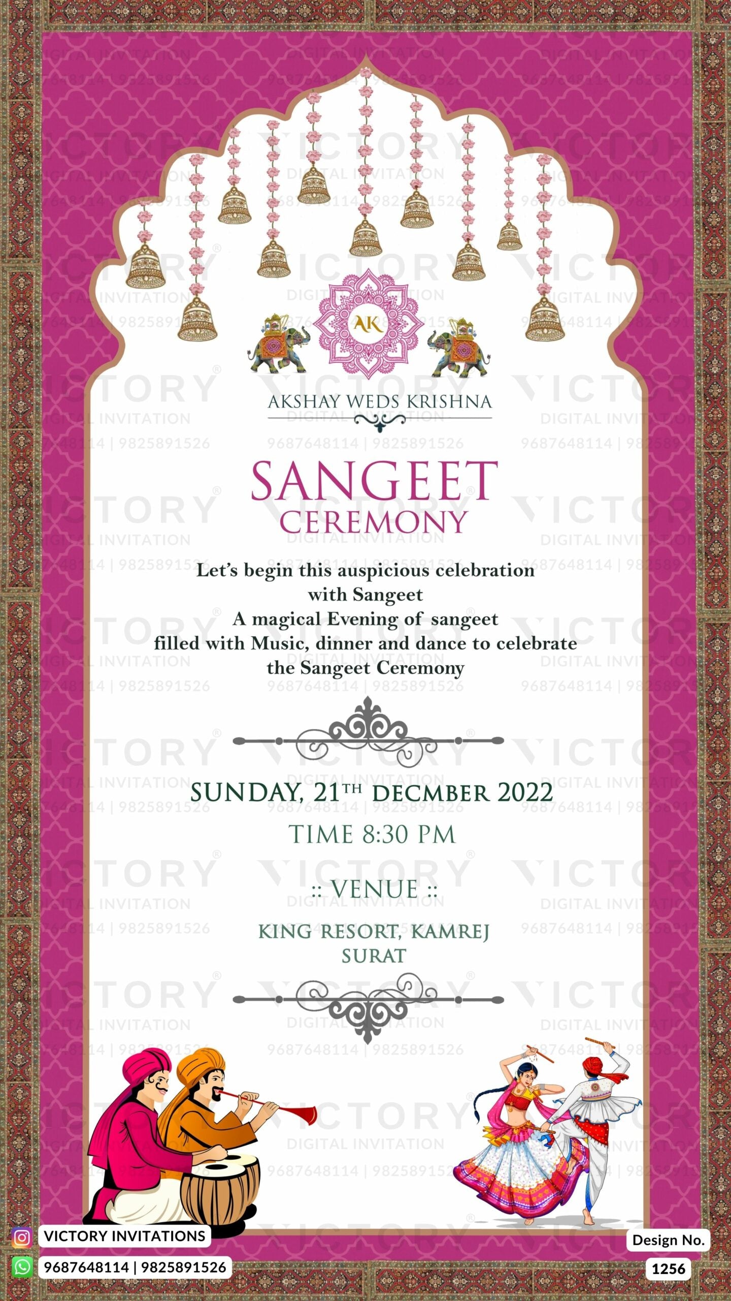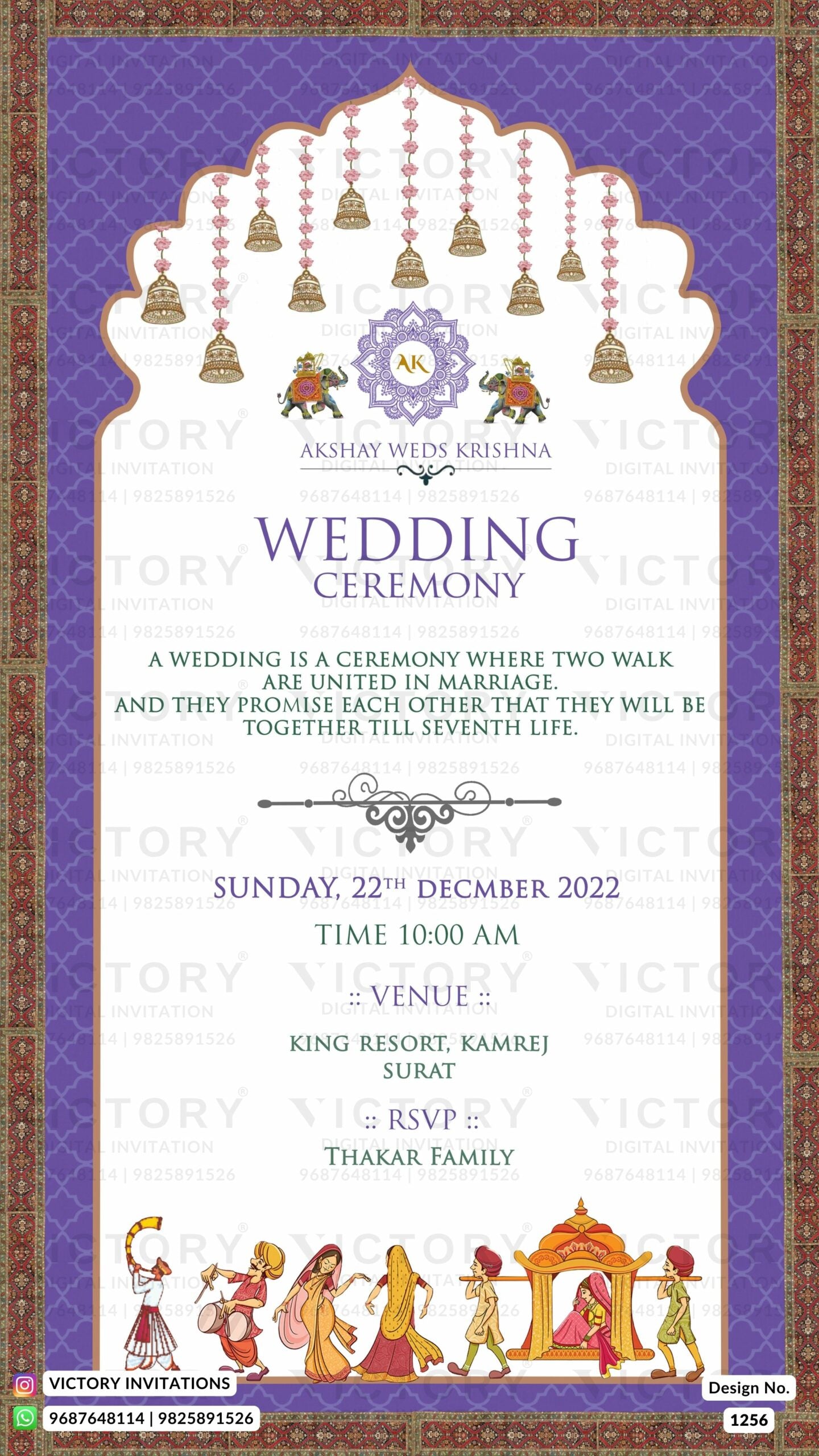 The arch Theme of the Hindu Gujarati digital invitation card for a wedding ceremony in brown, green, yellow, pink, and purple background color. This e-invite card is perfectly suitable for the leuva family and it's available in English language. It includes elements such as bells, pink flowers, a Mughal painting, elephants, a vintage border, a couple logo, red flowers, a haldi couple doodle, sangeet couple doodle.