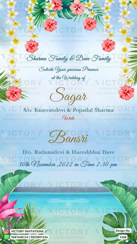 Wedding ceremony invitation card of hindu gujarati patel family in English language with beach and floral theme design 1368