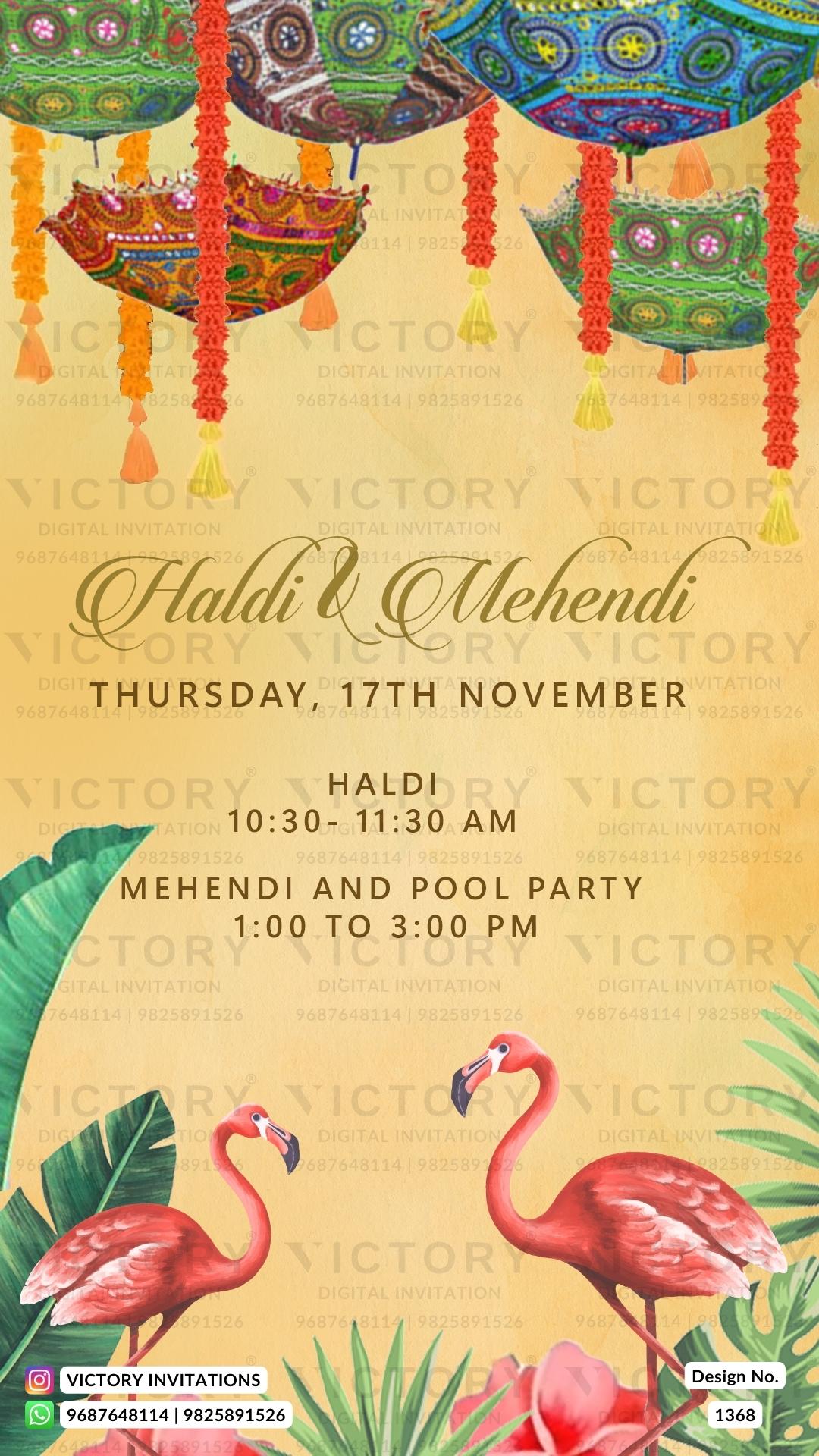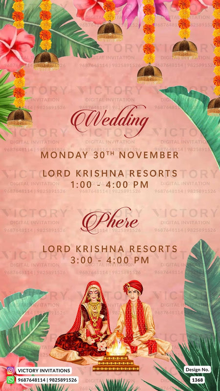 The beach and floral Theme of the Hindu Gujarati digital invitation card for a wedding ceremony in sky blue, yellow, brown, and pink background color. This e-invite card is perfectly suitable for the patel family and it's available in English language. It includes elements such as red flowers, pink flowers, white flowers, banana leaves, couple logo, beach, umbrella, marigold garland, bells, flamingo, string lights, golden glitter, and wedding couple doodle.