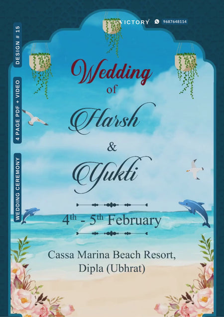 The beach Theme of the Hindu Gujarati digital invitation card for a wedding ceremony in sky blue background color. This e-invite card is perfectly suitable for the Patel family and it's available in English language. It includes elements such as dolphins, birds, a beach, an arch, and pink flowers.