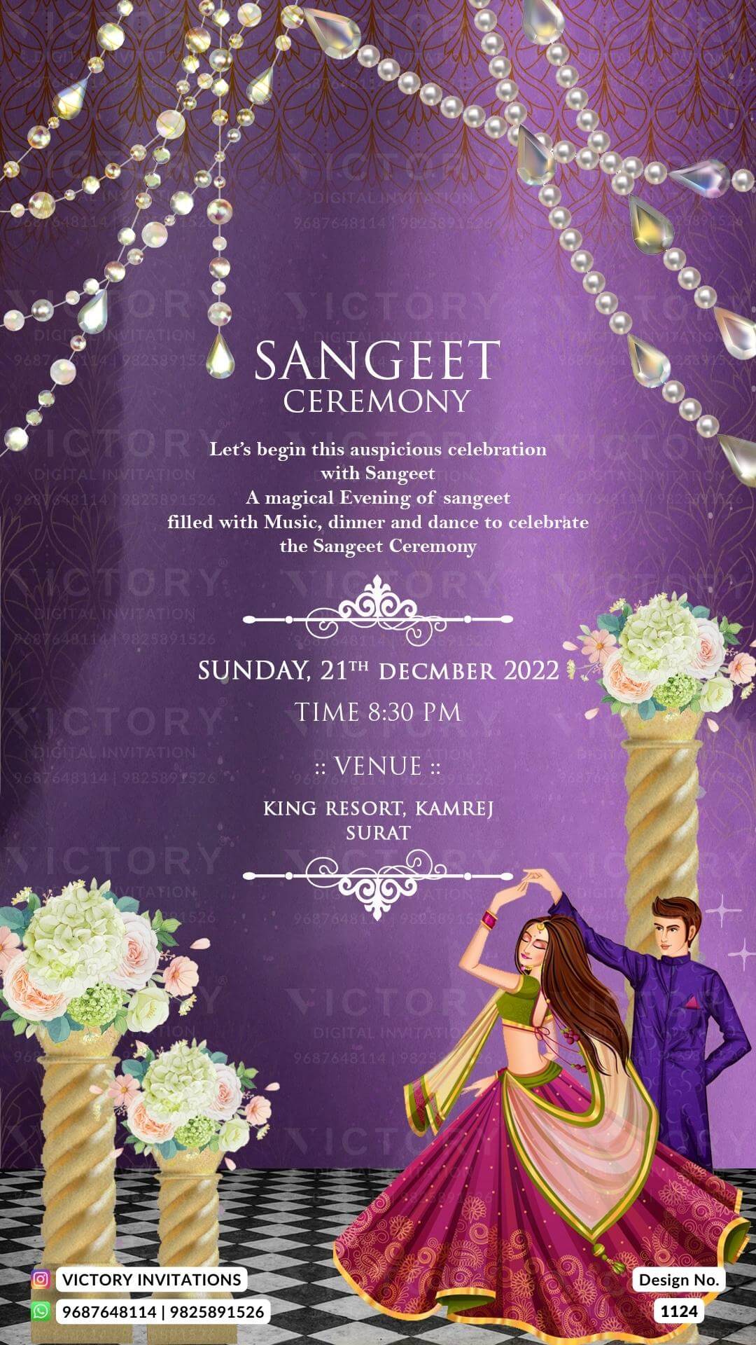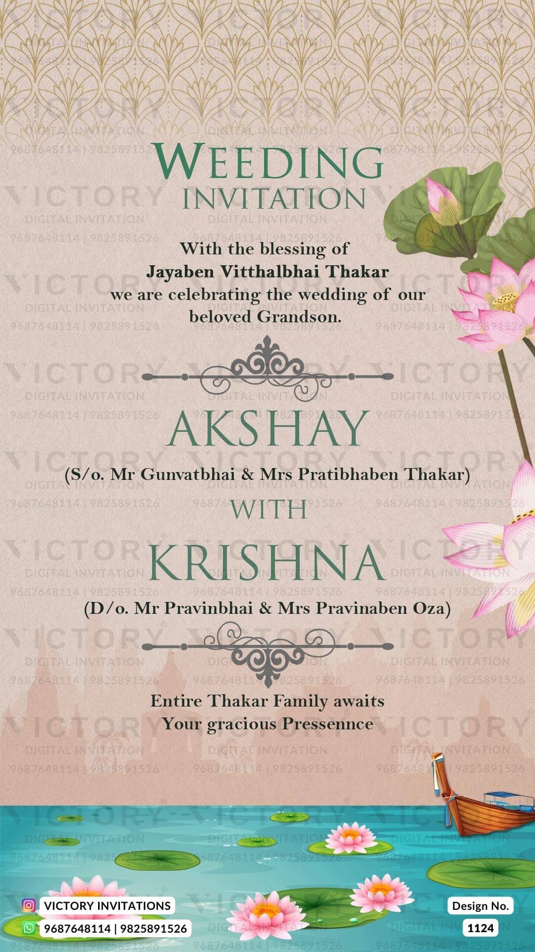 The floral Theme of the Hindu Gujarati digital invitation card for a wedding ceremony in maroon, brown, blue, yellow, purple, and dark blue background color. This e-invite card is perfectly suitable for the patel family and it's available in English language. It includes elements such as couple logo, pink flowers, lotus, water, boat, golden pattern, green curtains, pink curtains, white flowers, orange flowers, green leaves, marigold garland, green tulips, haldi couple doodle, lighting, sangeet couple doodle, yellow pillars, bells, dancing ball, cocktail glass.