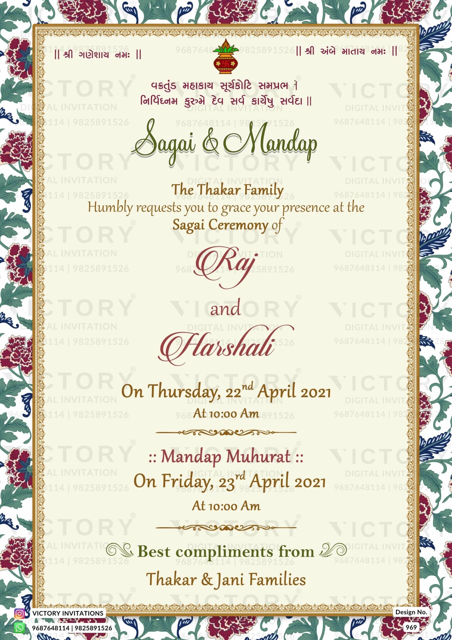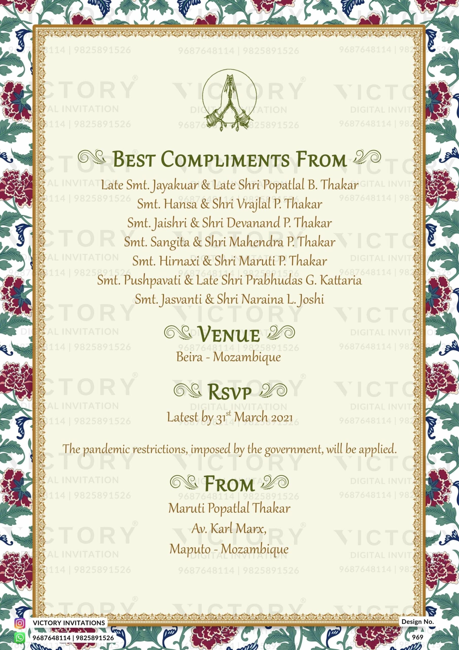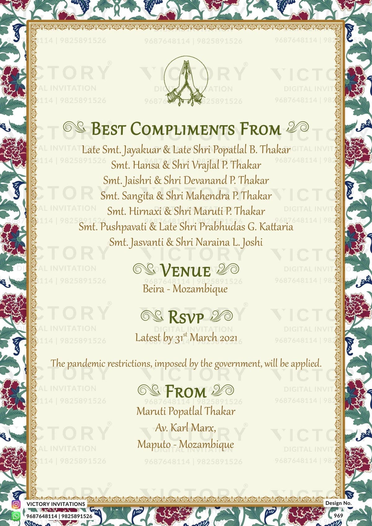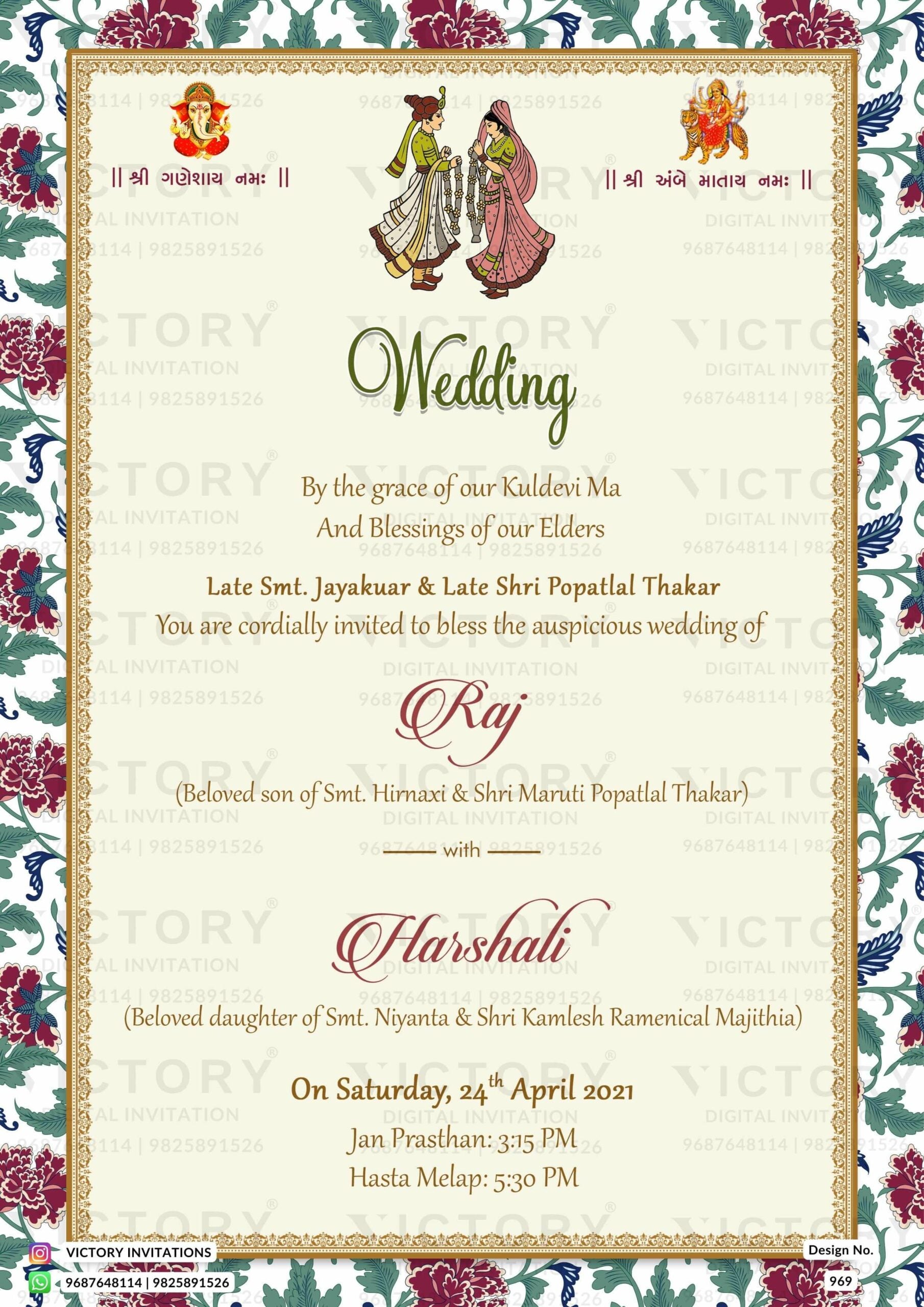 The vintage Theme of the Hindu Gujarati digital invitation card for a wedding ceremony in light yellow background color. This e-invite card is perfectly suitable for the Patel family and it's available in the English language. It includes elements such as red flowers, blue leaves, green leaves, the Ganesha logo, Kalash, ambe mata logo, couple doodle, frame, and namaste icon.
