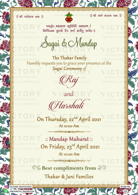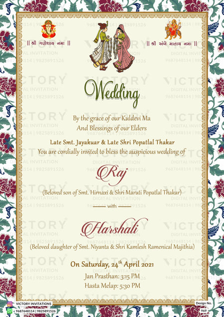 Wedding ceremony invitation card of hindu gujarati patel family in English language with vintage theme design 969