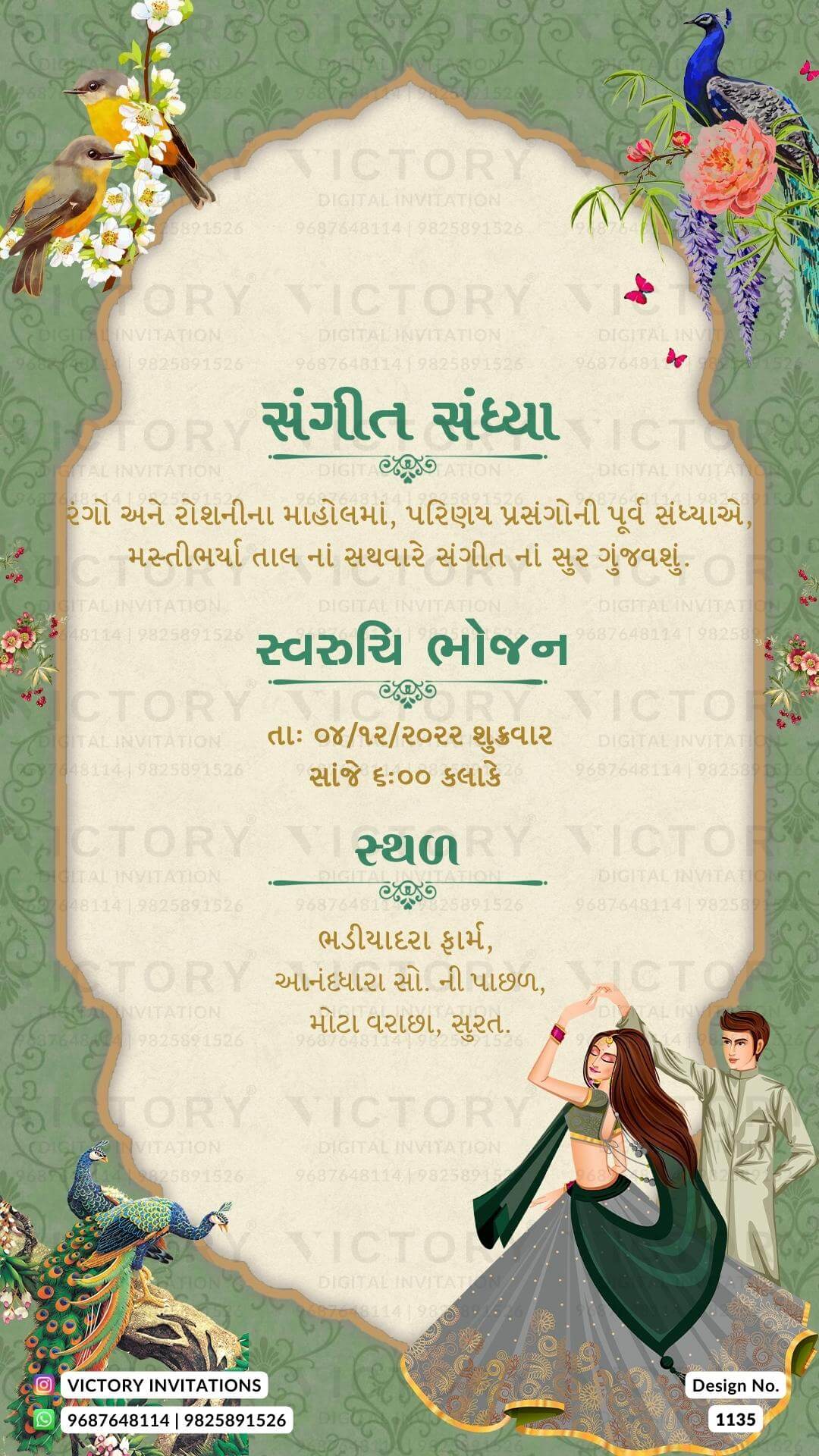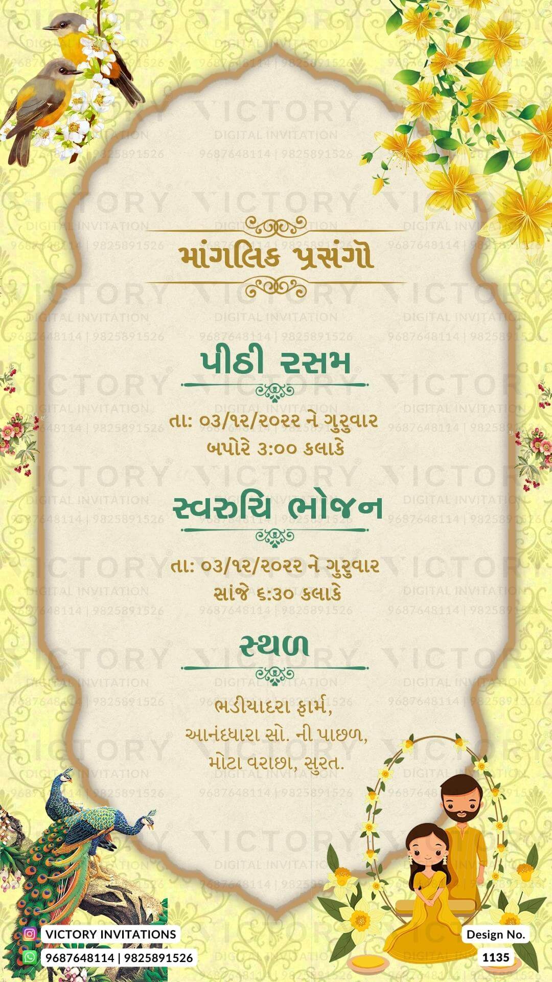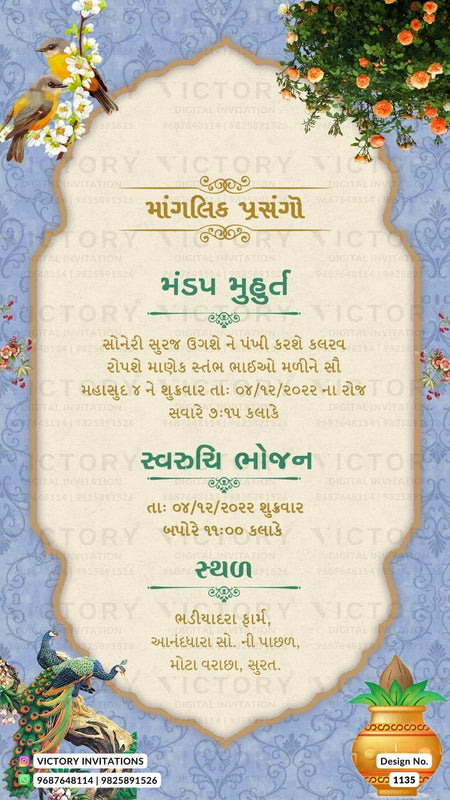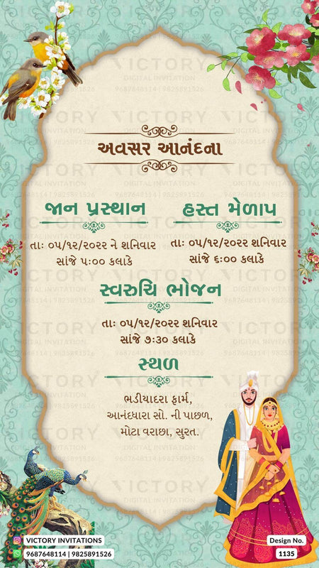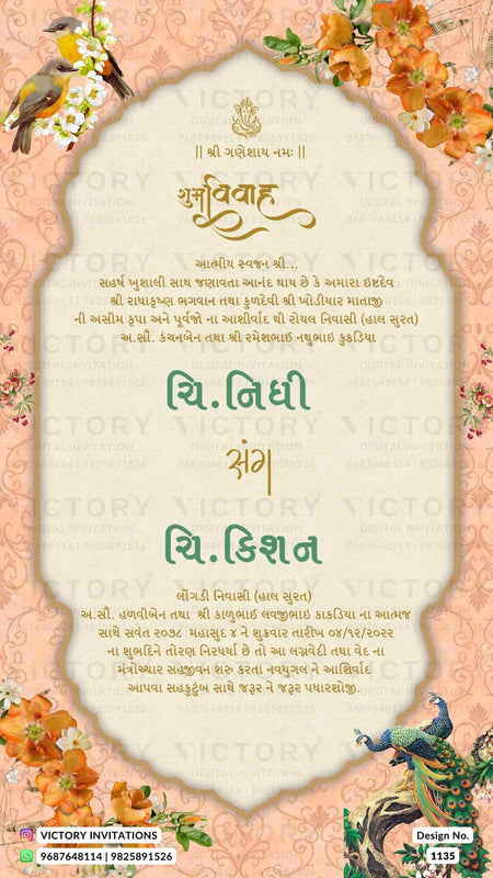 The Arch Theme of the Hindu Gujarati digital invitation card for a wedding ceremony in pink, orange, yellow, blue, and green background color. This e-invite card is perfectly suitable for the Patel family and it's available in Gujarati language. It includes elements such as birds, white flowers, a lantern, the Ganesha logo, elephants, an arch frame, orange flowers, a peacock, yellow flowers, a haldi couple doodle, a Kalash, a sangeet couple doodle, red flowers, wedding couple doodle, lotus.