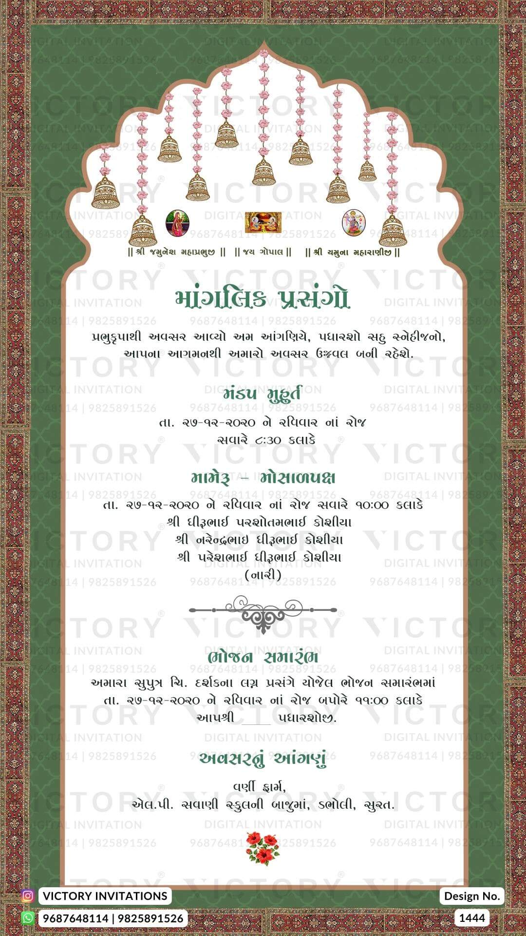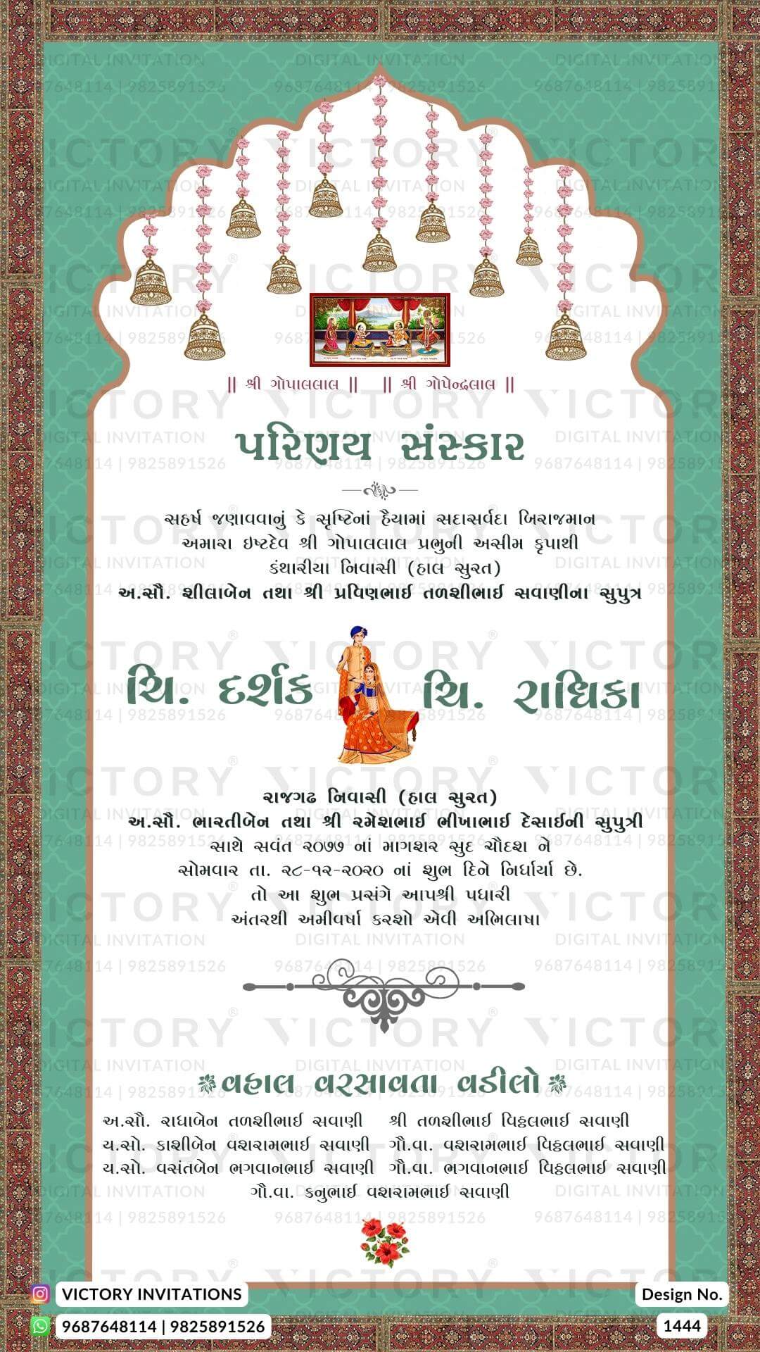 Wedding ceremony invitation card of hindu gujarati patel family in Gujarati language with Arch theme design 1444