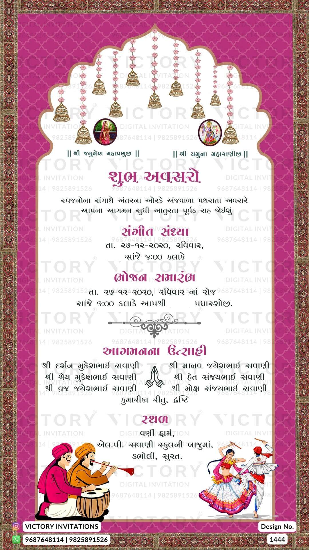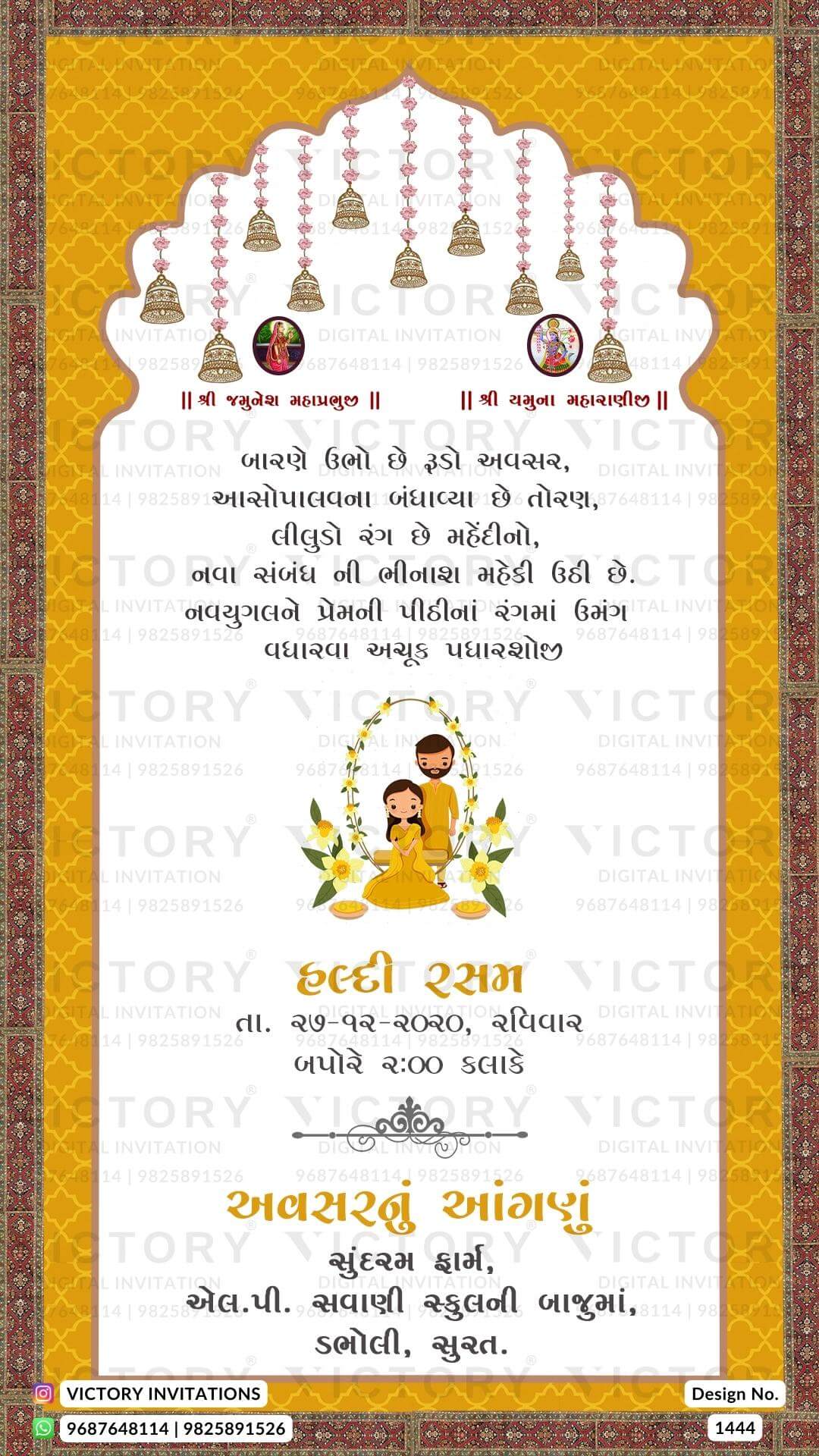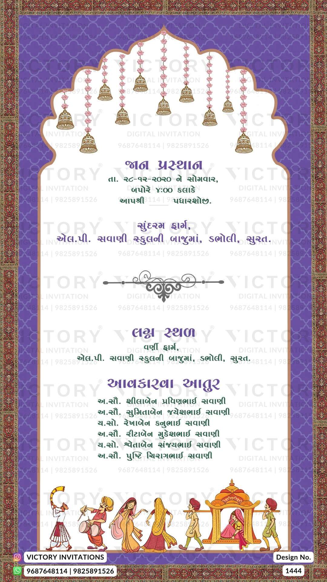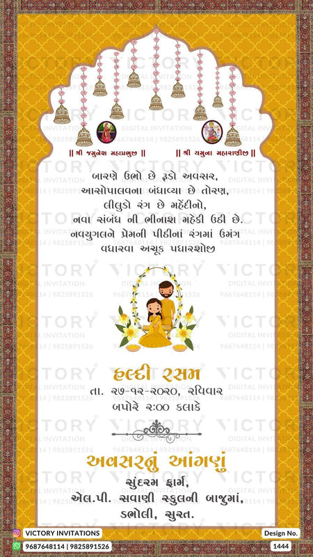 The Arch Theme of the Hindu Gujarati digital invitation card for a wedding ceremony in red, cyan, green, yellow, pink, and purple background color. This e-invite card is perfectly suitable for the Patel family and it's available in the Gujarati language. It includes elements such as a vintage border, bells, a Ganesha logo, elephants, red flowers, a wedding couple doodle, a haldi couple doodle, sangeet couple doodle.