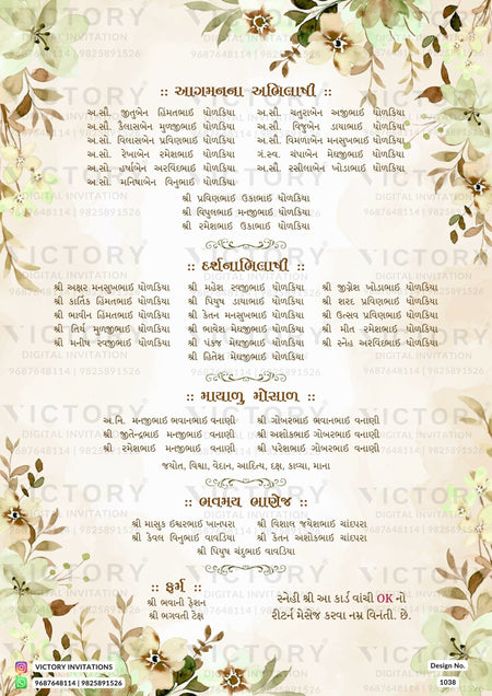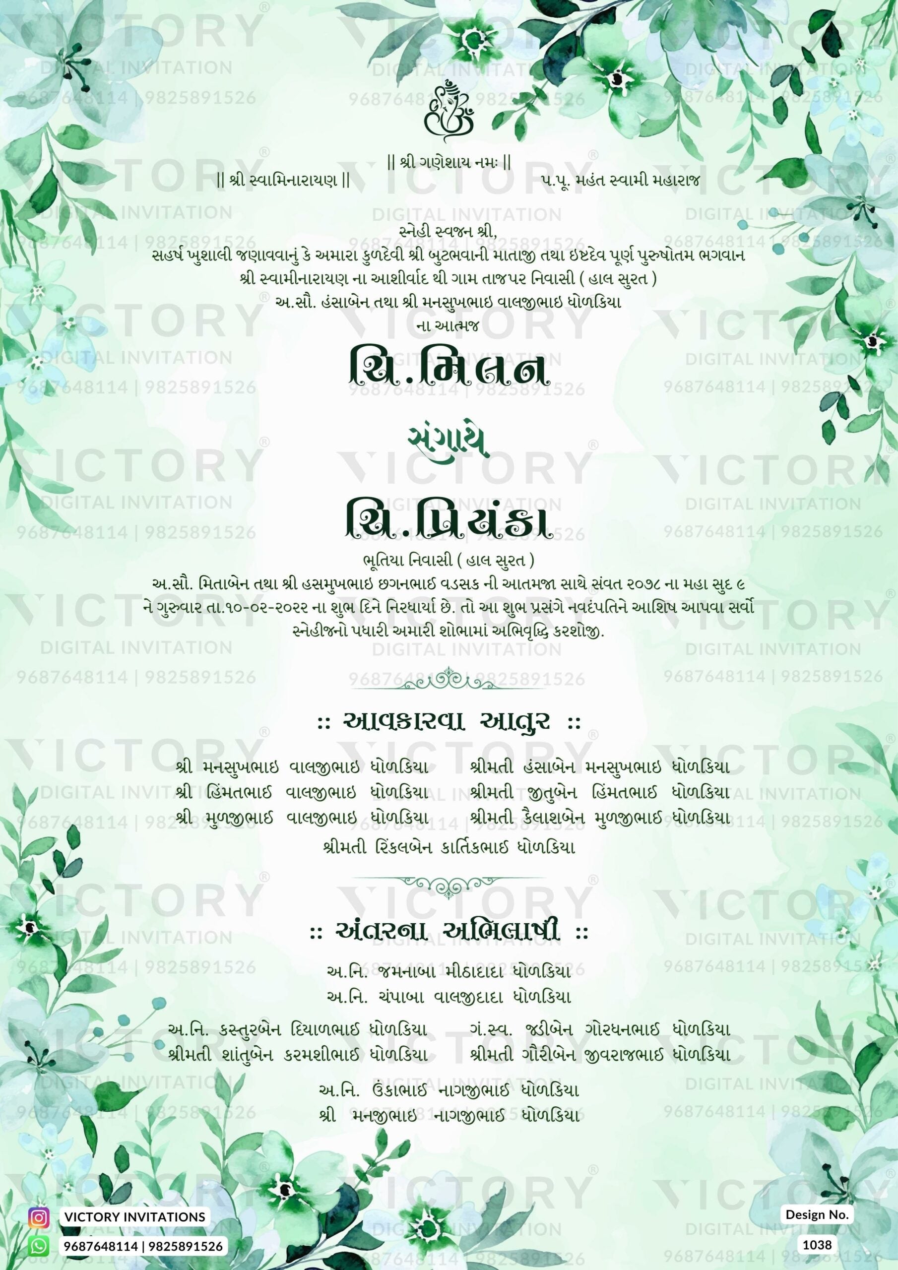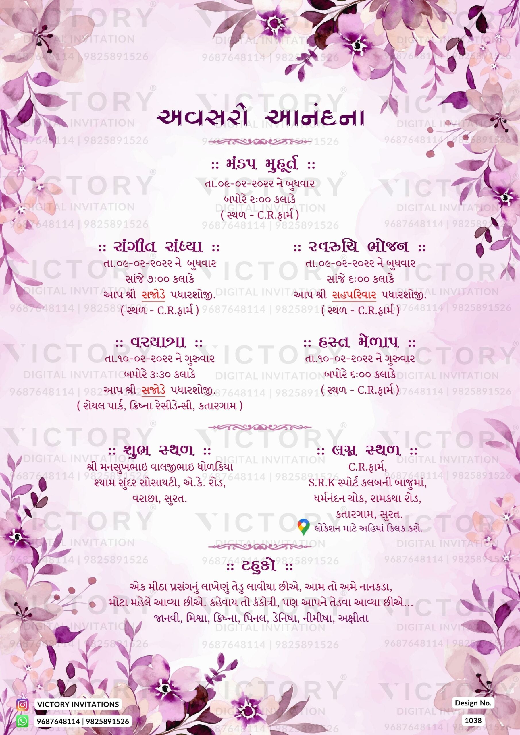 Wedding ceremony invitation card of hindu gujarati patel family in Gujarati language with couple photo floral theme design 1038