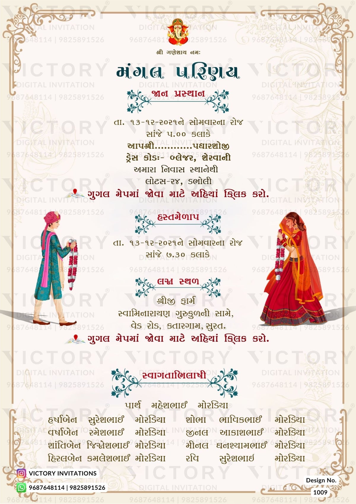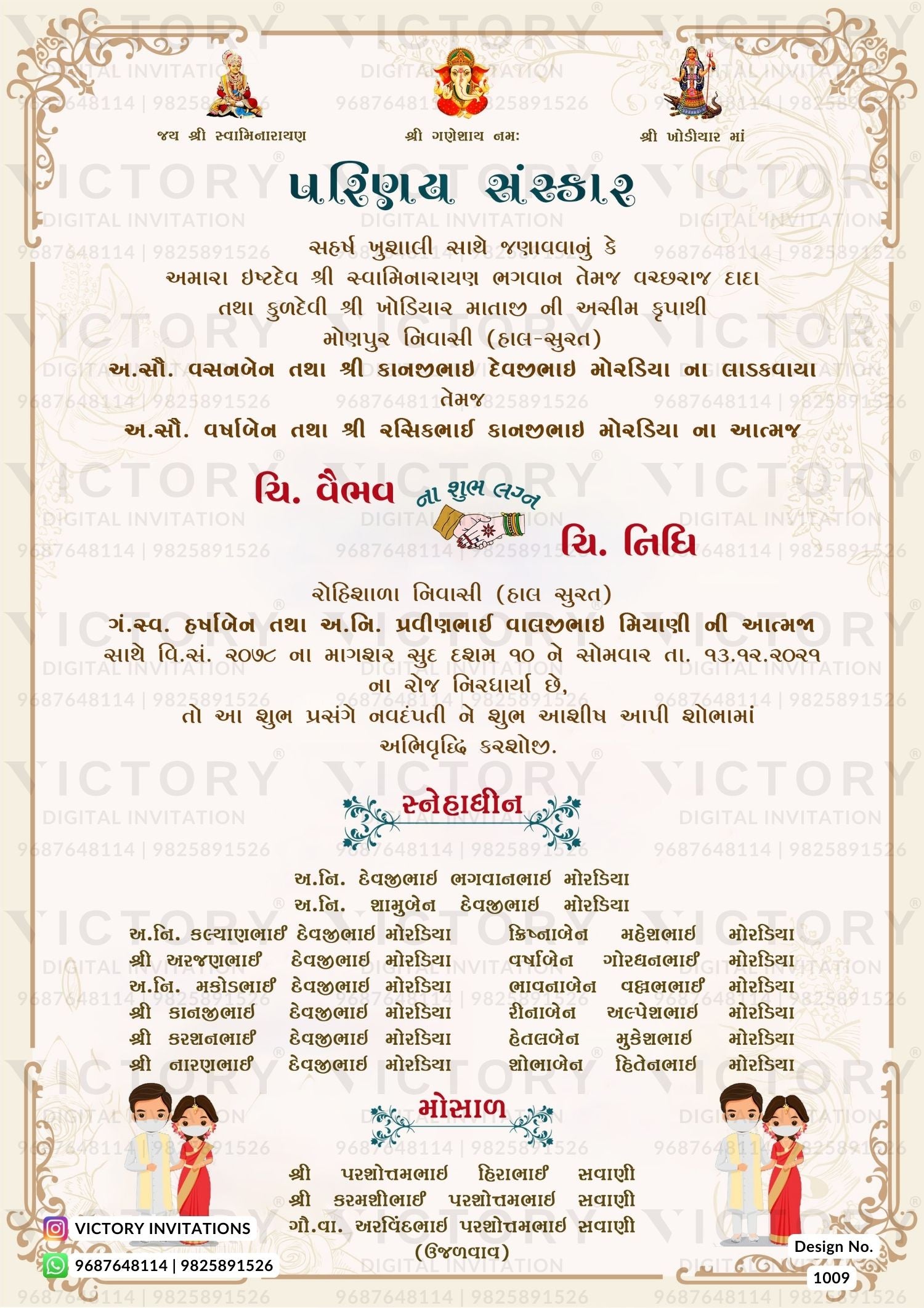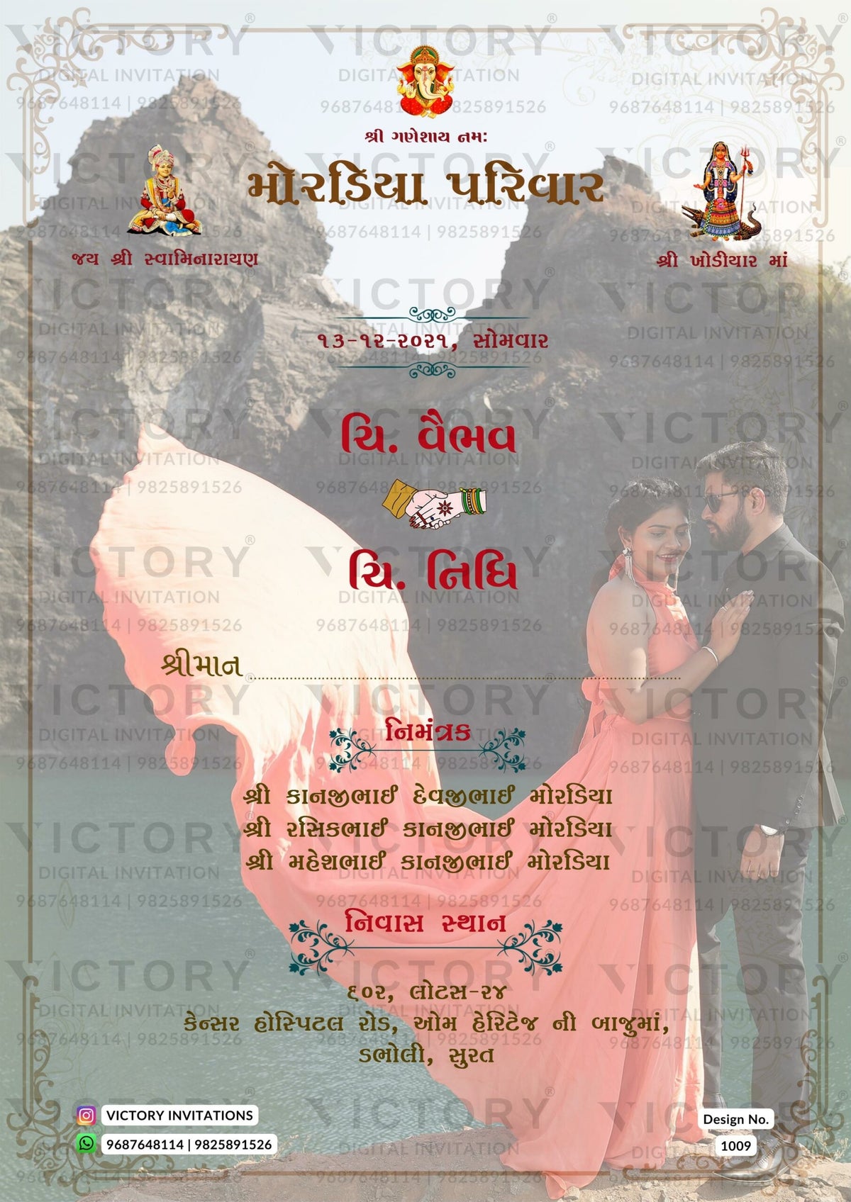 Wedding ceremony invitation card of hindu gujarati patel family in Gujarati language with couple photo theme design 1009