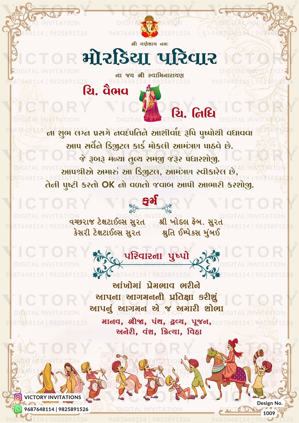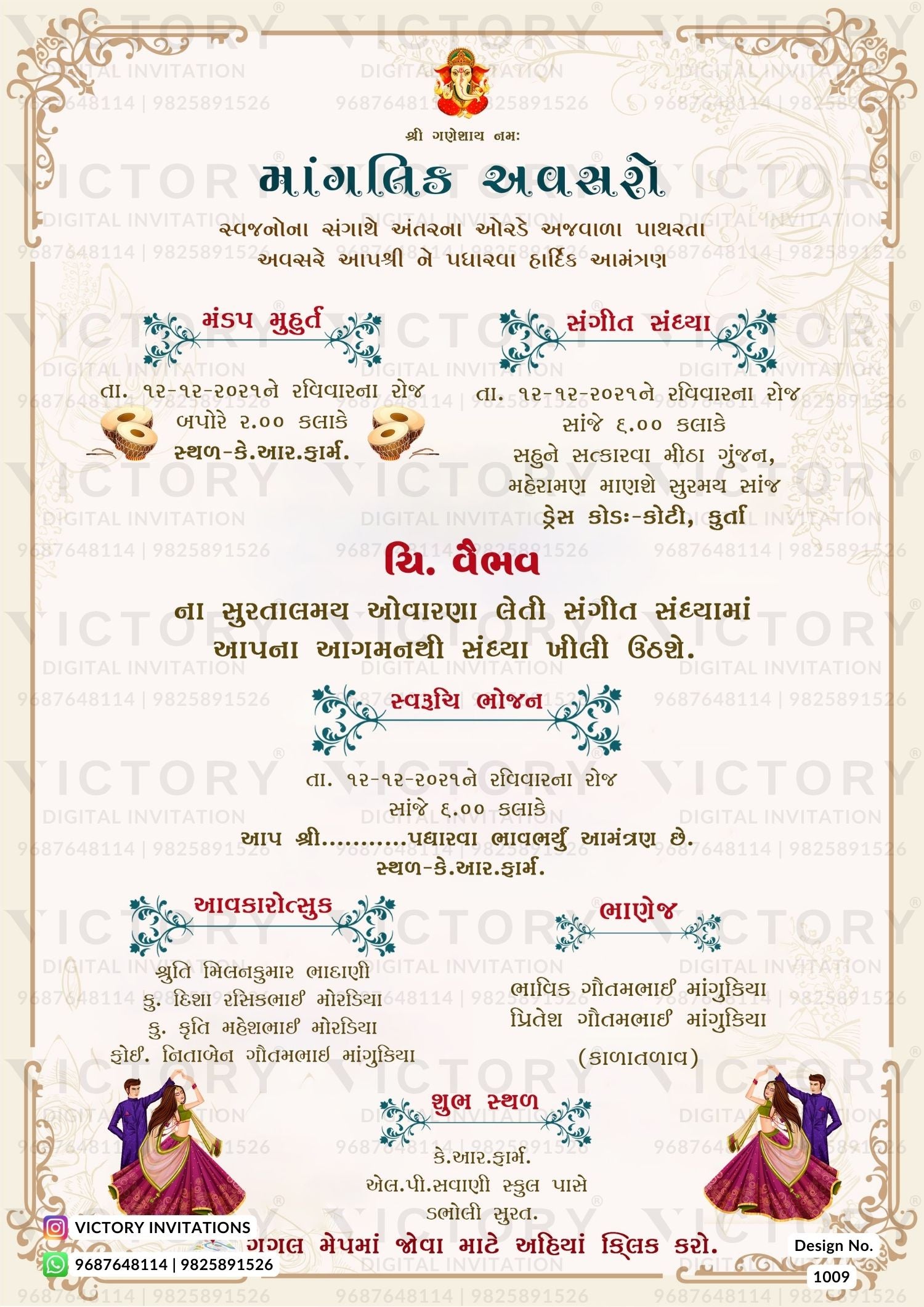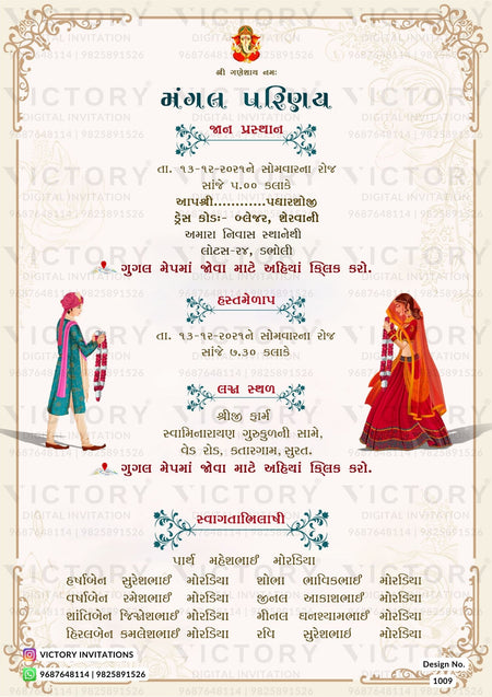 Wedding ceremony invitation card of hindu gujarati patel family in Gujarati language with couple photo theme design 1009