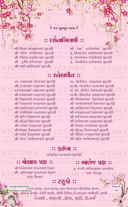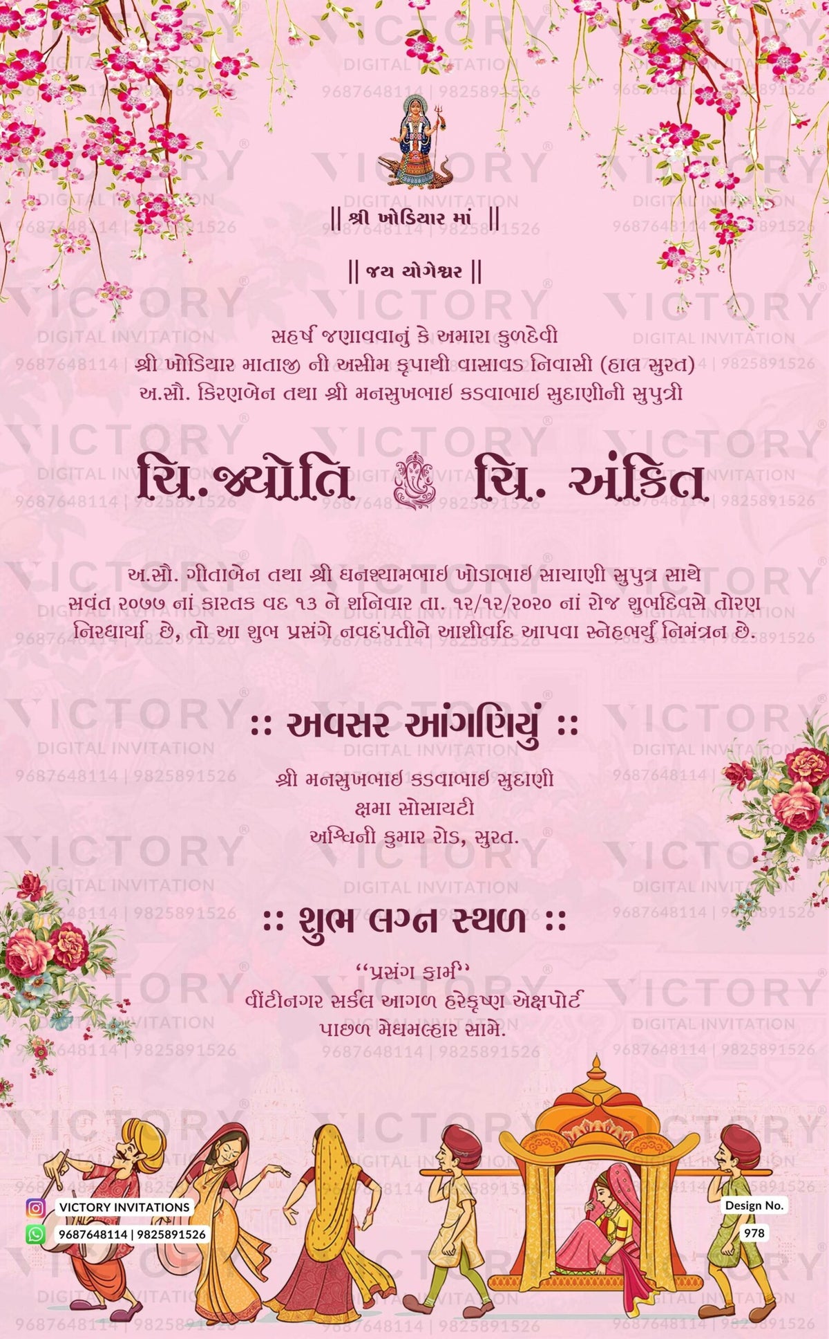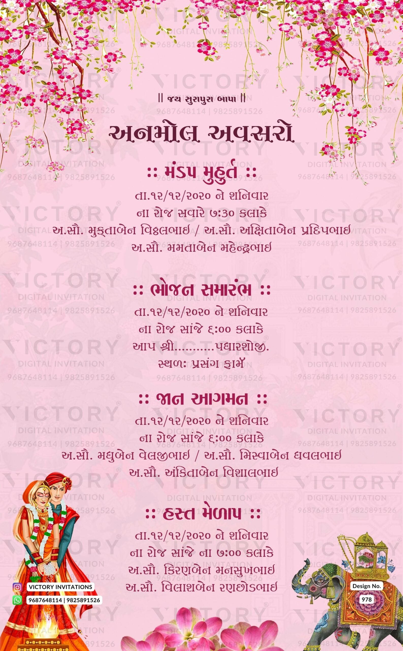 The couple photo Theme of the Hindu Gujarati digital invitation card for a wedding ceremony in pink background color. This e-invite card is perfectly suitable for the patel family and it's available in Gujarati language. It includes elements such as the Ganesha logo, pink flowers, a couple photo, green leaves, a wedding couple doodle, elephants, and red flowers.