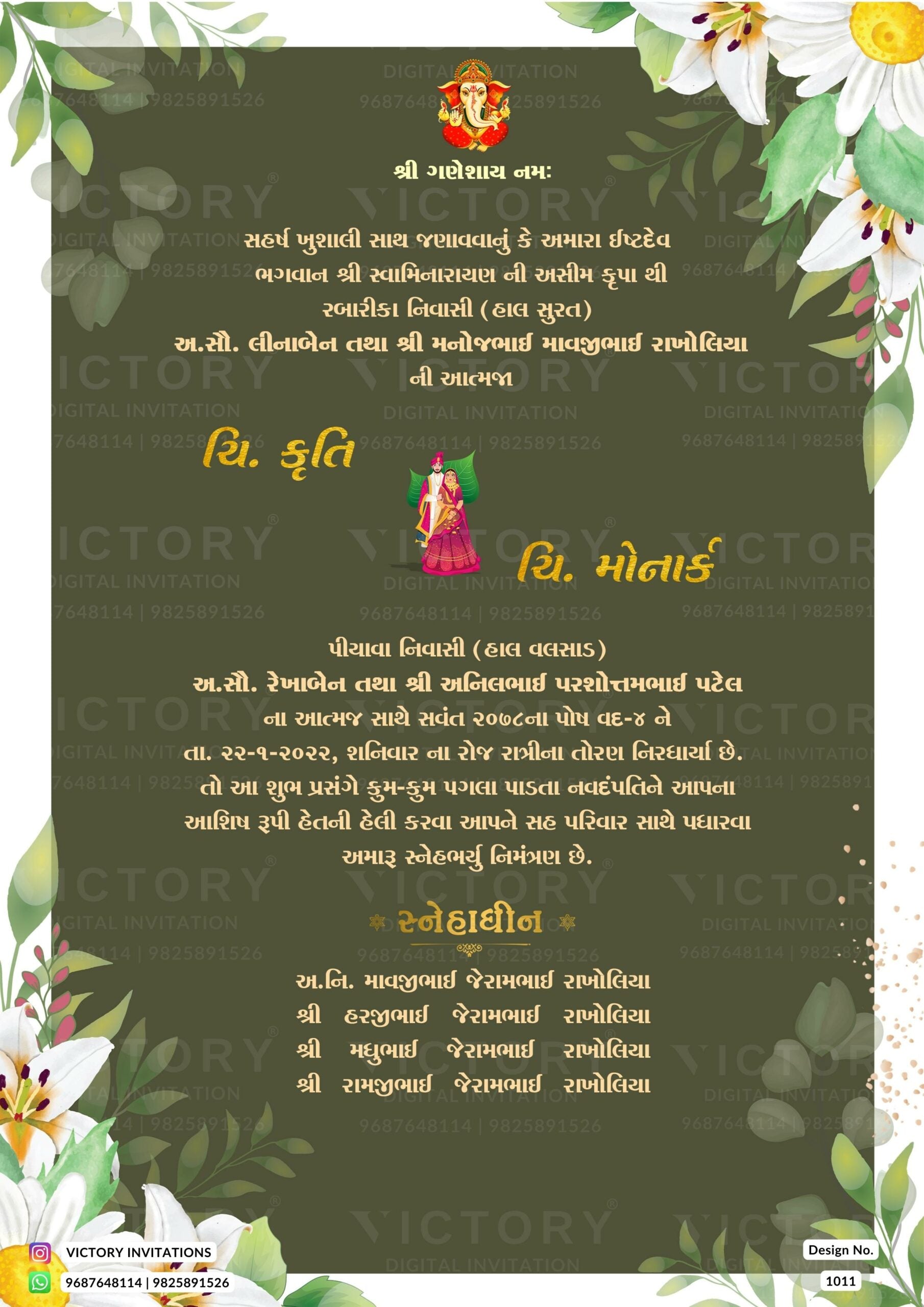 Wedding ceremony invitation card of hindu gujarati patel family in Gujarati language with floral theme design 1011