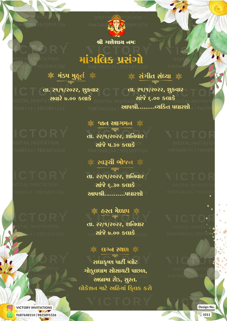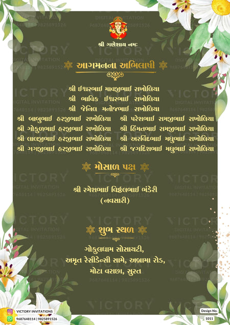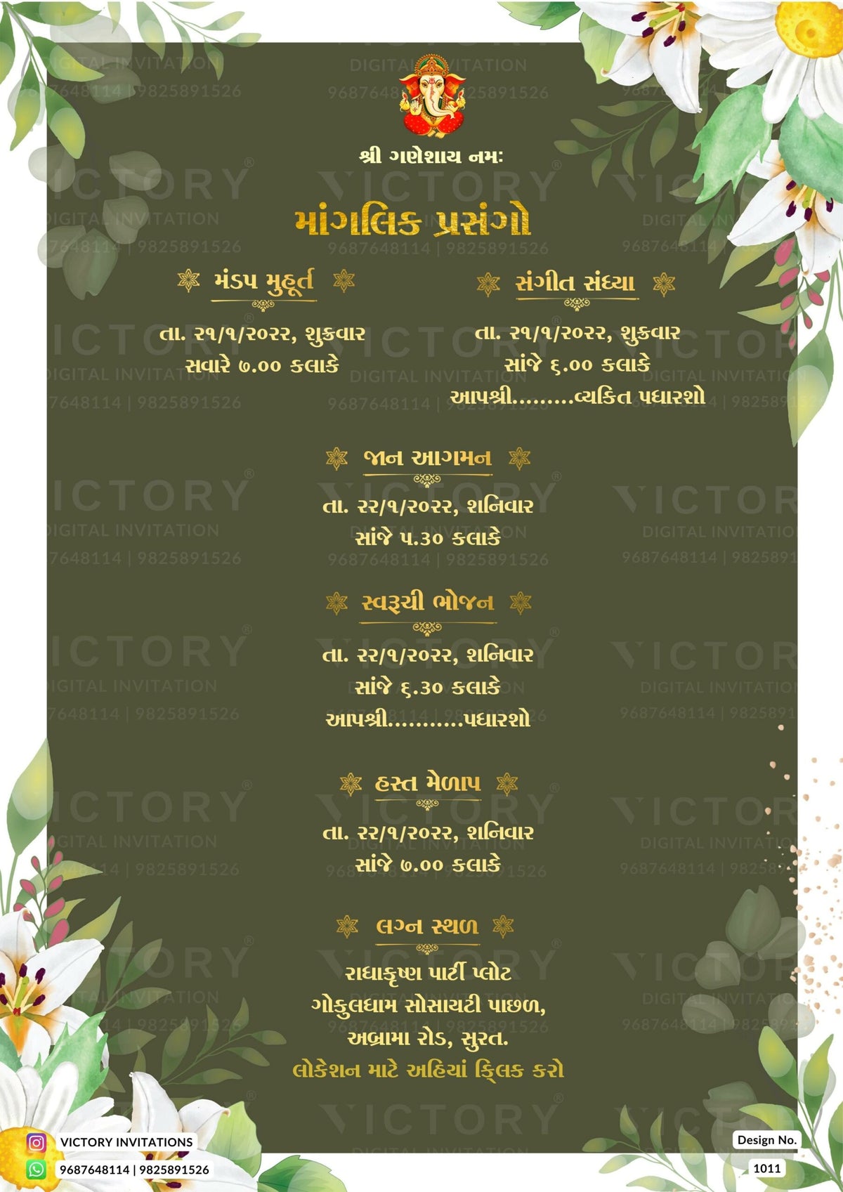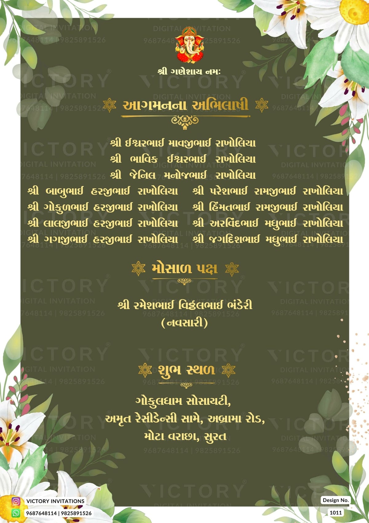 The floral Theme of the Hindu Gujarati digital invitation card for a wedding ceremony in green, and white background color. This e-invite card is perfectly suitable for the patel family and it's available in Gujarati language. It includes elements such as the Ganesha logo, green leaves, white flowers, glitter, and a wedding couple doodle.