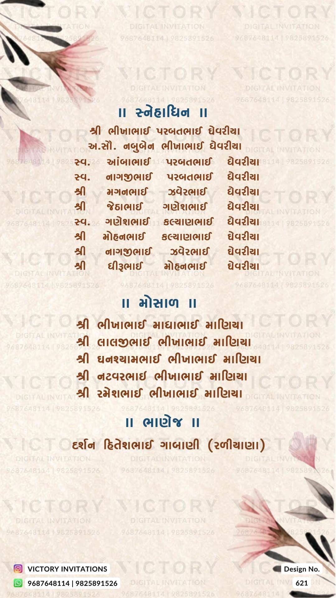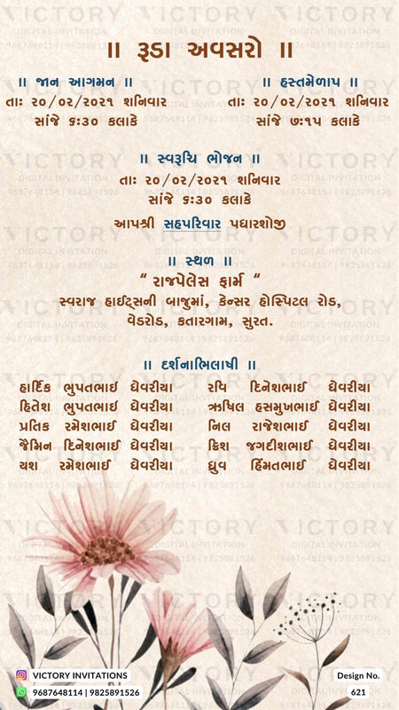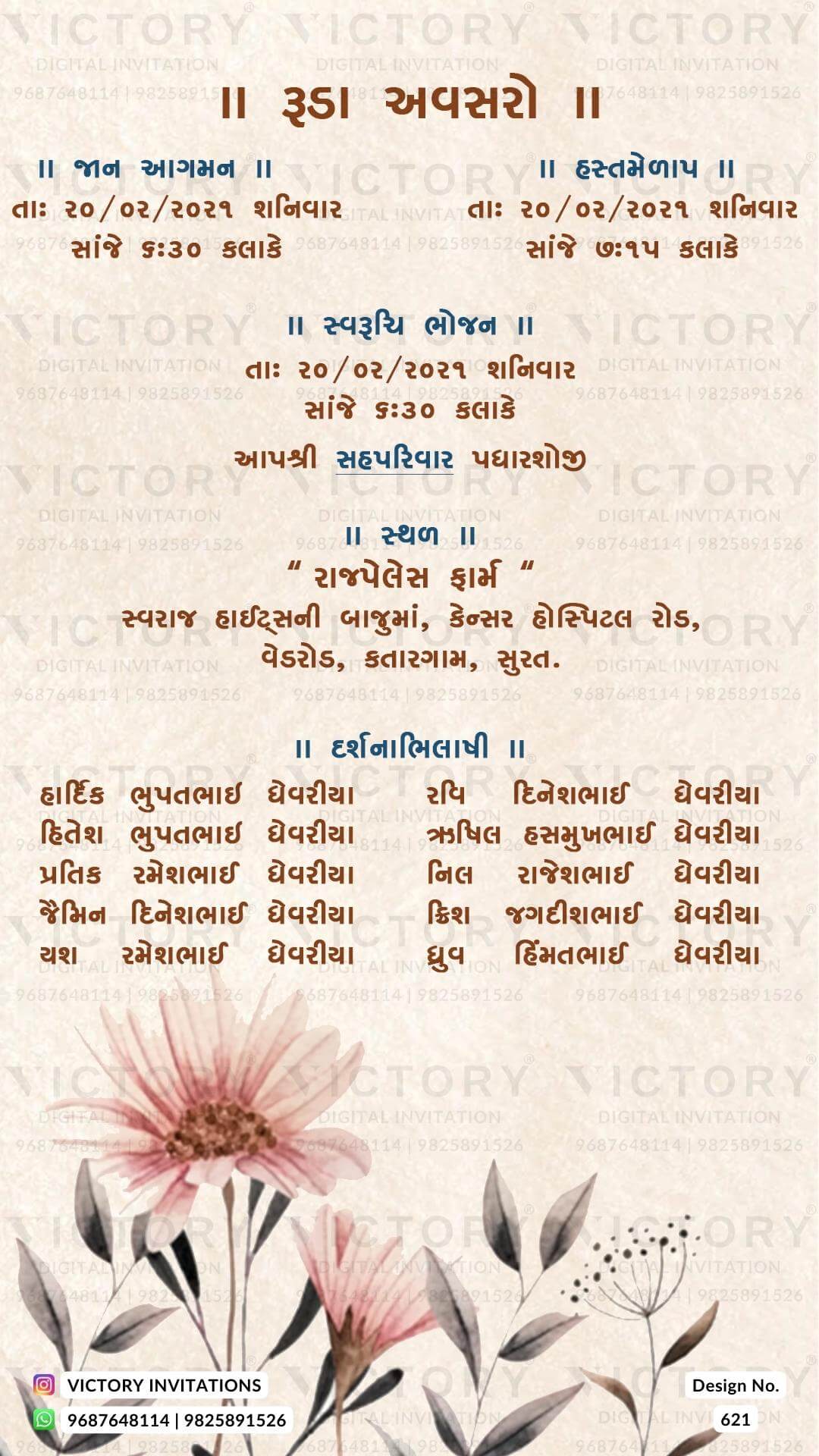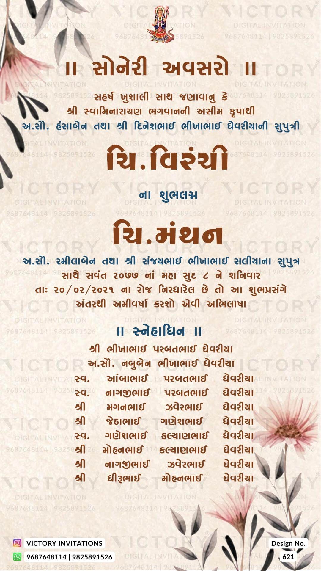 Wedding ceremony invitation card of hindu gujarati patel family in Gujarati language with floral theme design 621