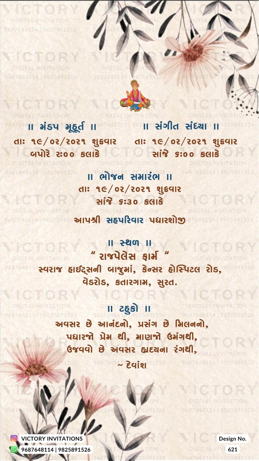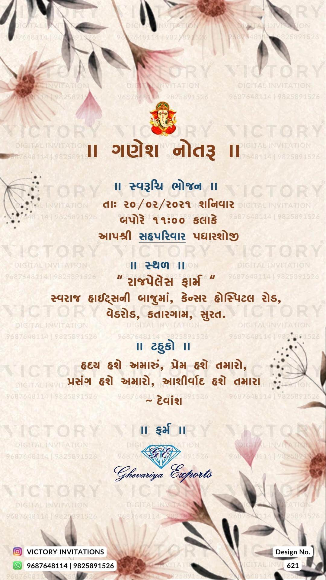 The floral Theme of the Hindu Gujarati digital invitation card for a wedding ceremony in light yellow background color. This e-invite card is perfectly suitable for the patel family and it's available in Gujarati language. It includes elements such as the Ganesha logo, pink flowers, and green leaves.