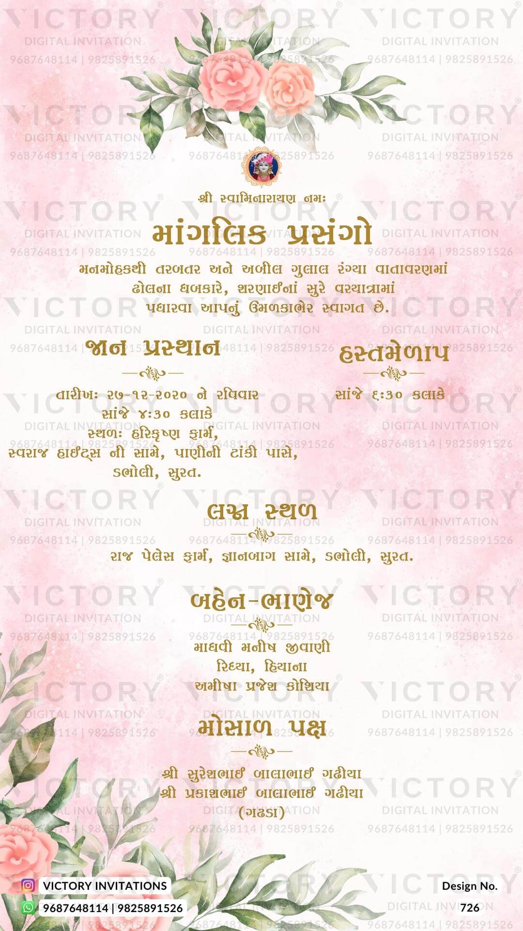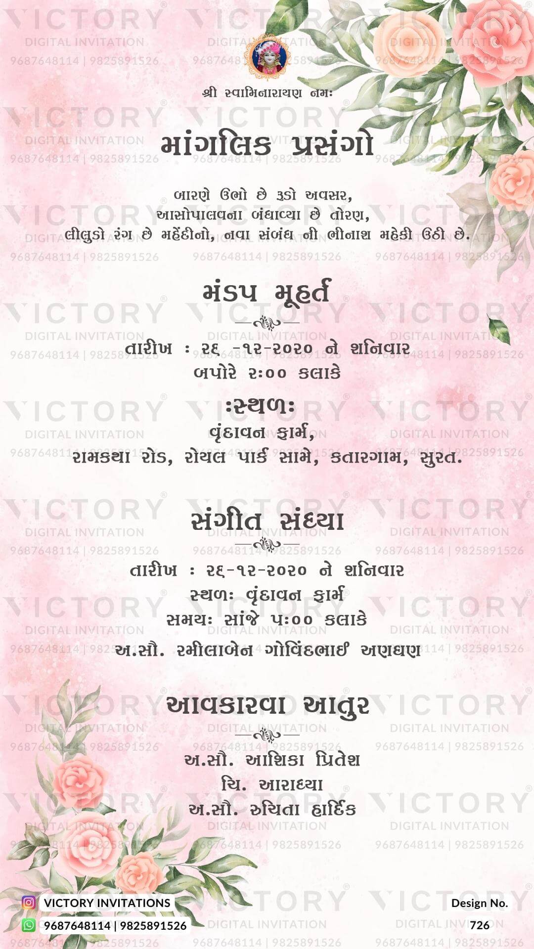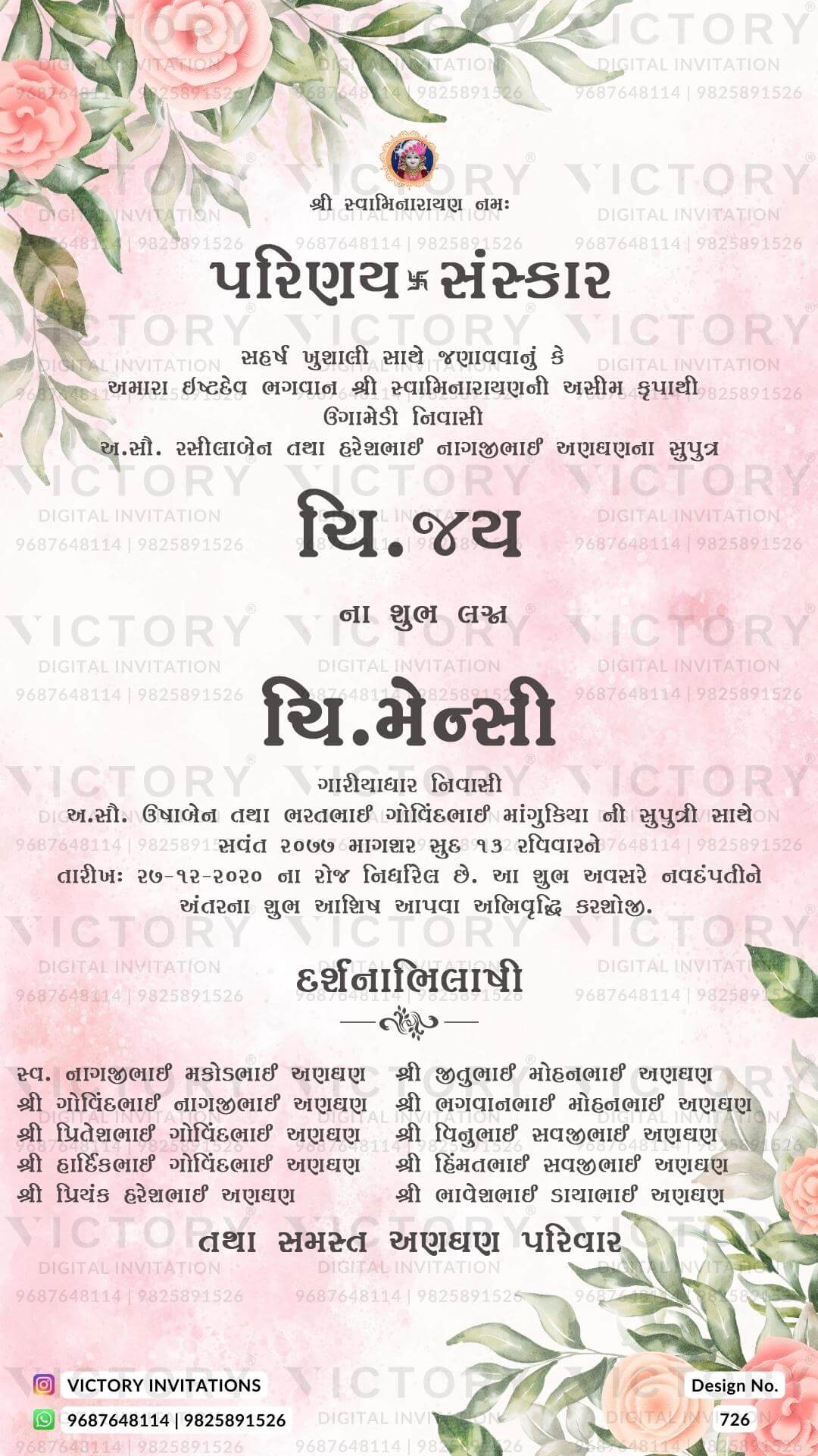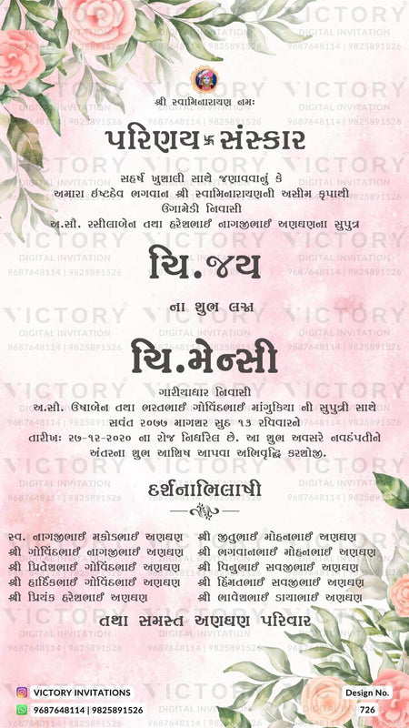 The floral Theme of the Hindu Gujarati digital invitation card for a wedding ceremony in pink background color. This e-invite card is perfectly suitable for the Patel family and it's available in Gujarati language. It includes elements such as pink flowers, orange flowers, green leaves, Ganesha logo.