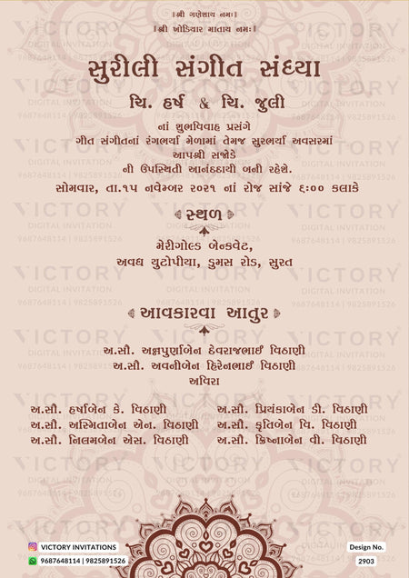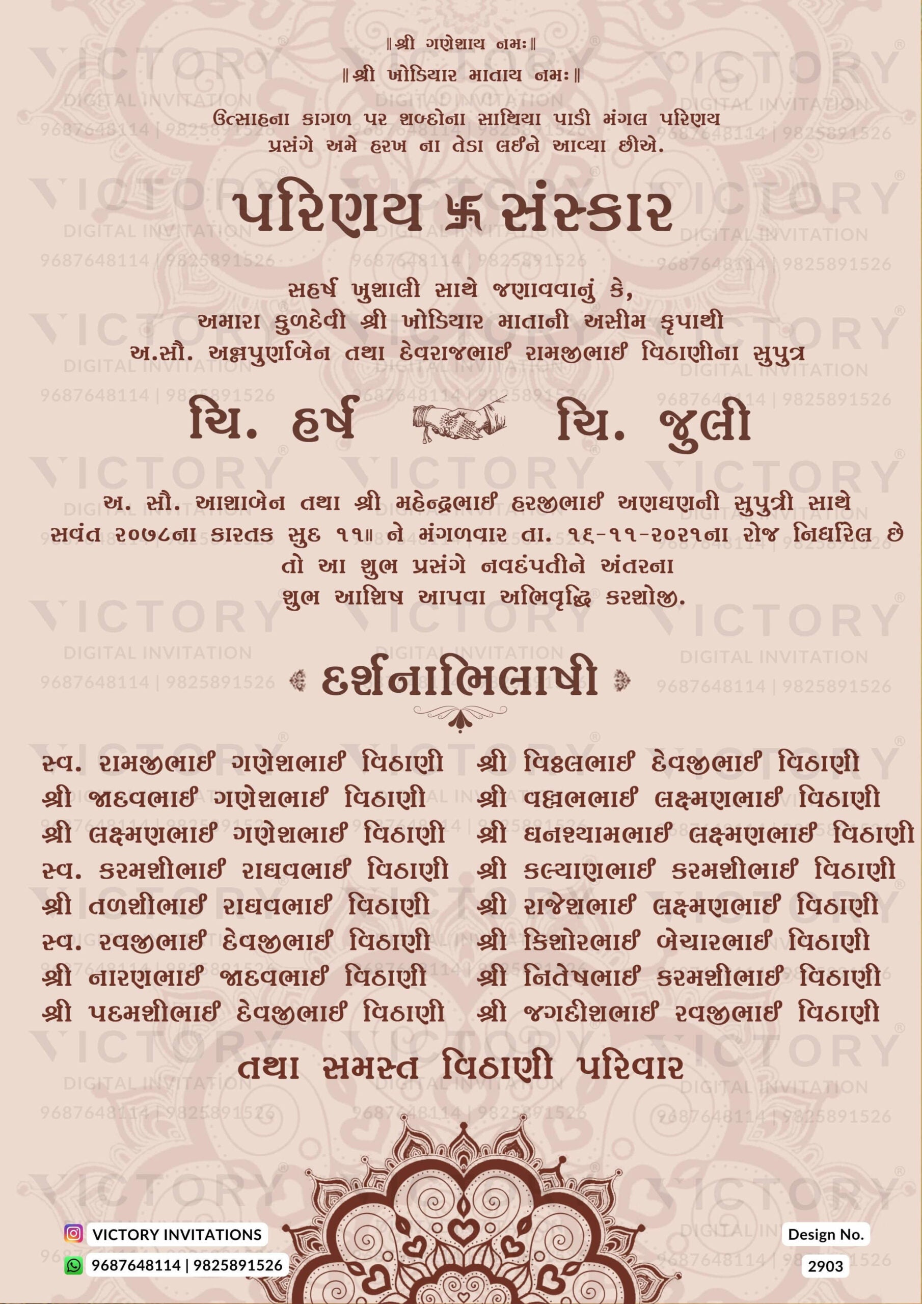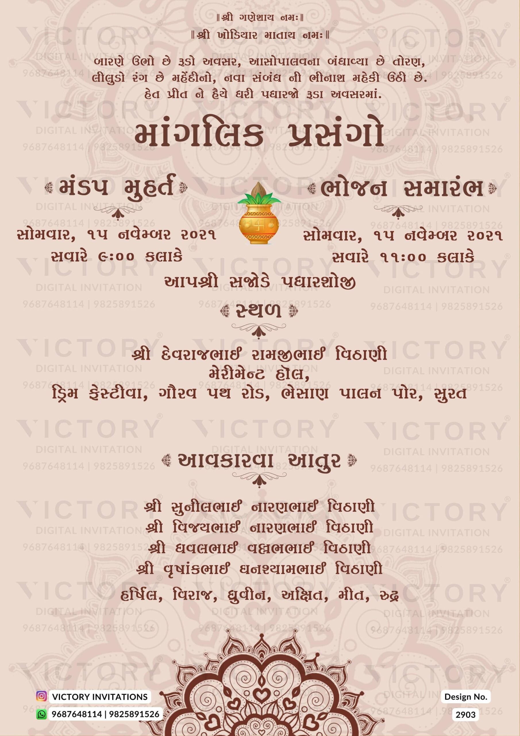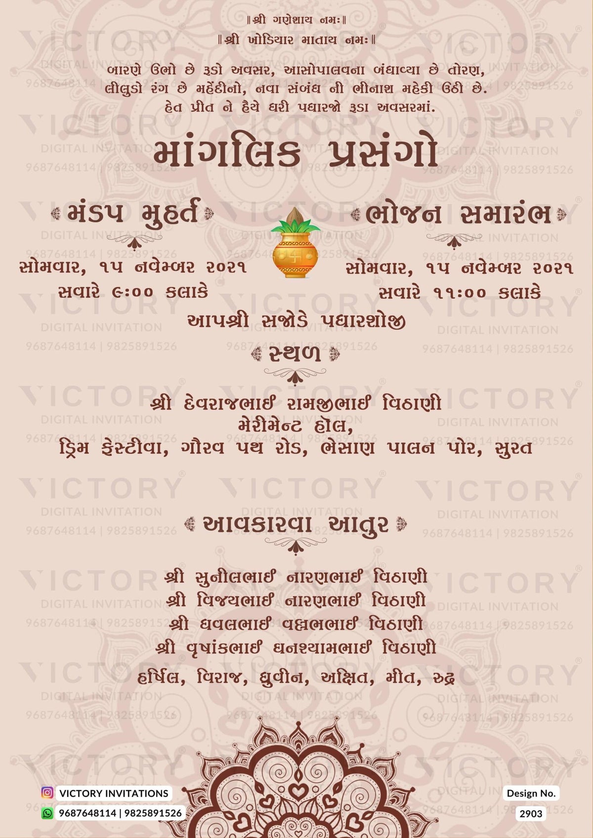 Wedding ceremony invitation card of hindu gujarati patel family in Gujarati language with mandala theme design 2903