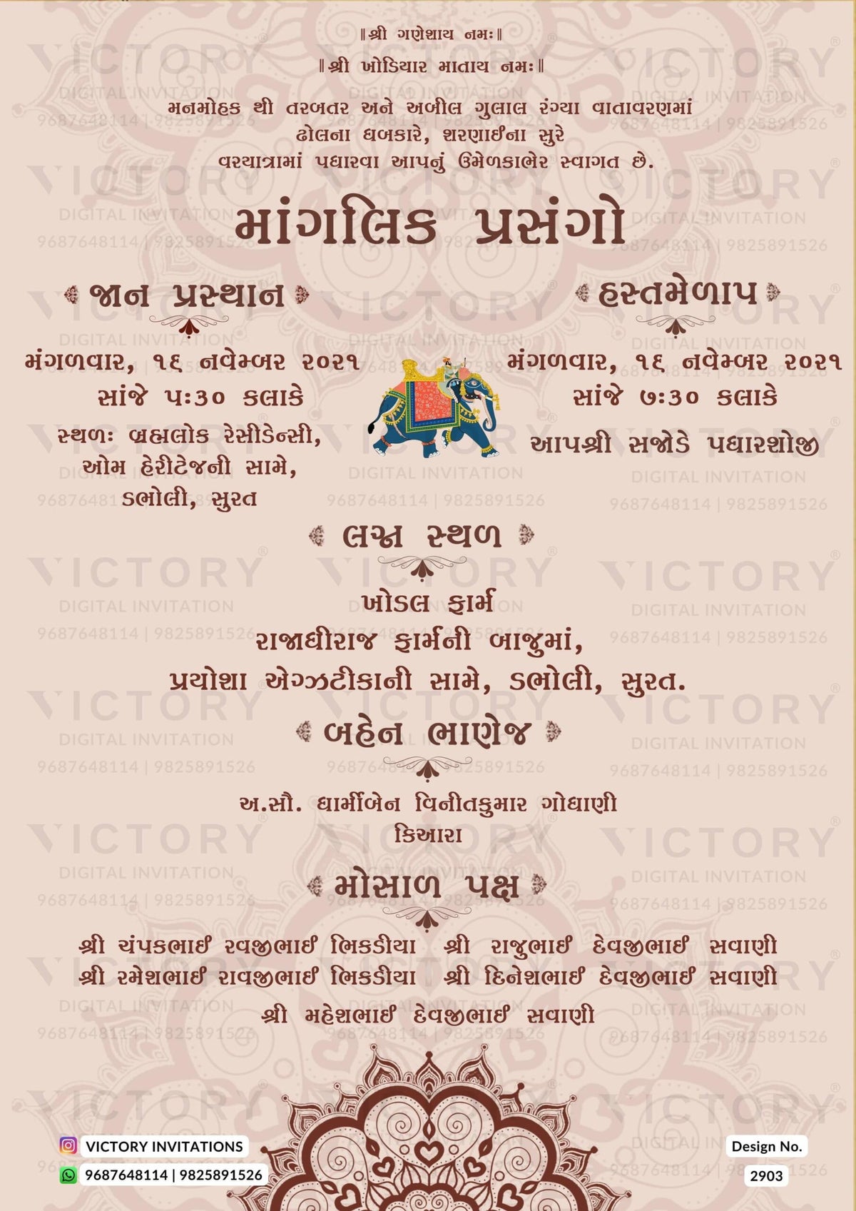 The mandala Theme of the Hindu Gujarati digital invitation card for a wedding ceremony is in light brown background color. This e-invite card is perfectly suitable for the patel family and it's available in Gujarati language. It includes elements such as the Ganesha logo, mandala, Swastik, Kalash, and elephant.