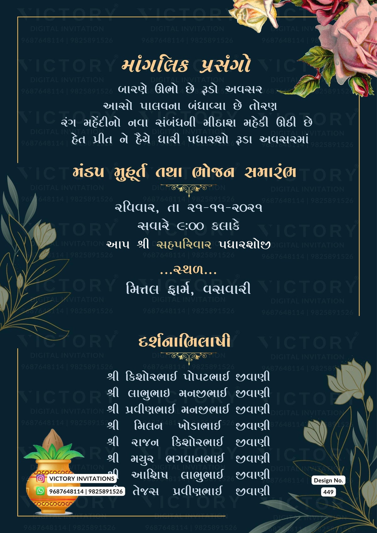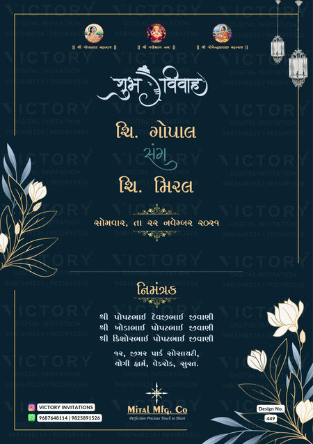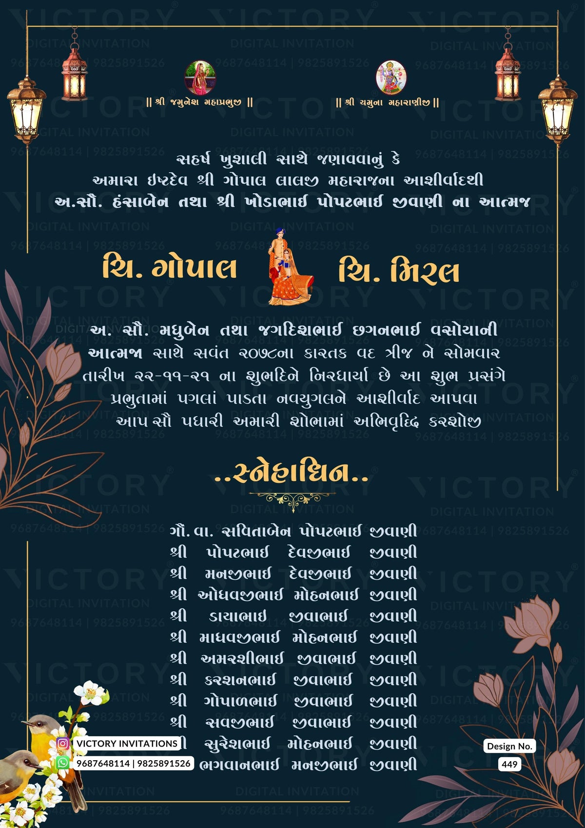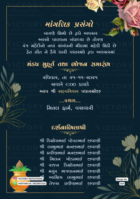 Wedding ceremony invitation card of hindu gujarati patel family in Gujarati language with minimalistic theme design 449