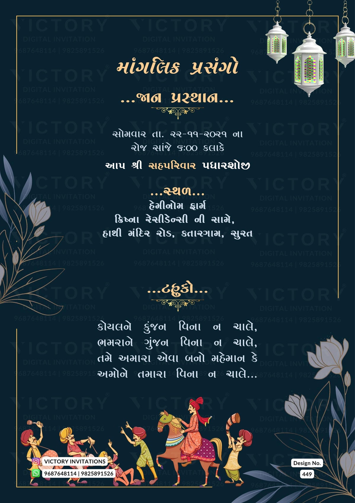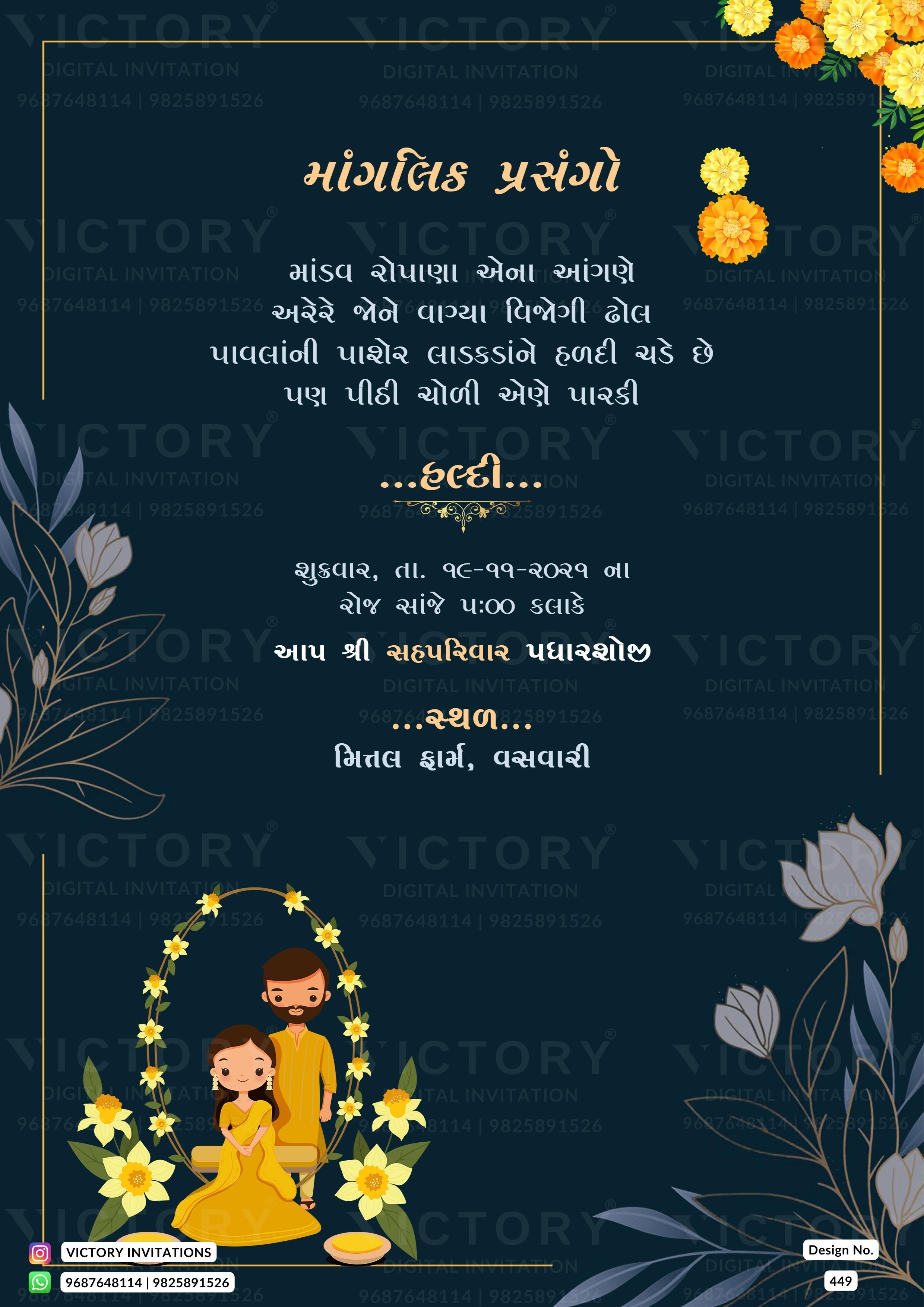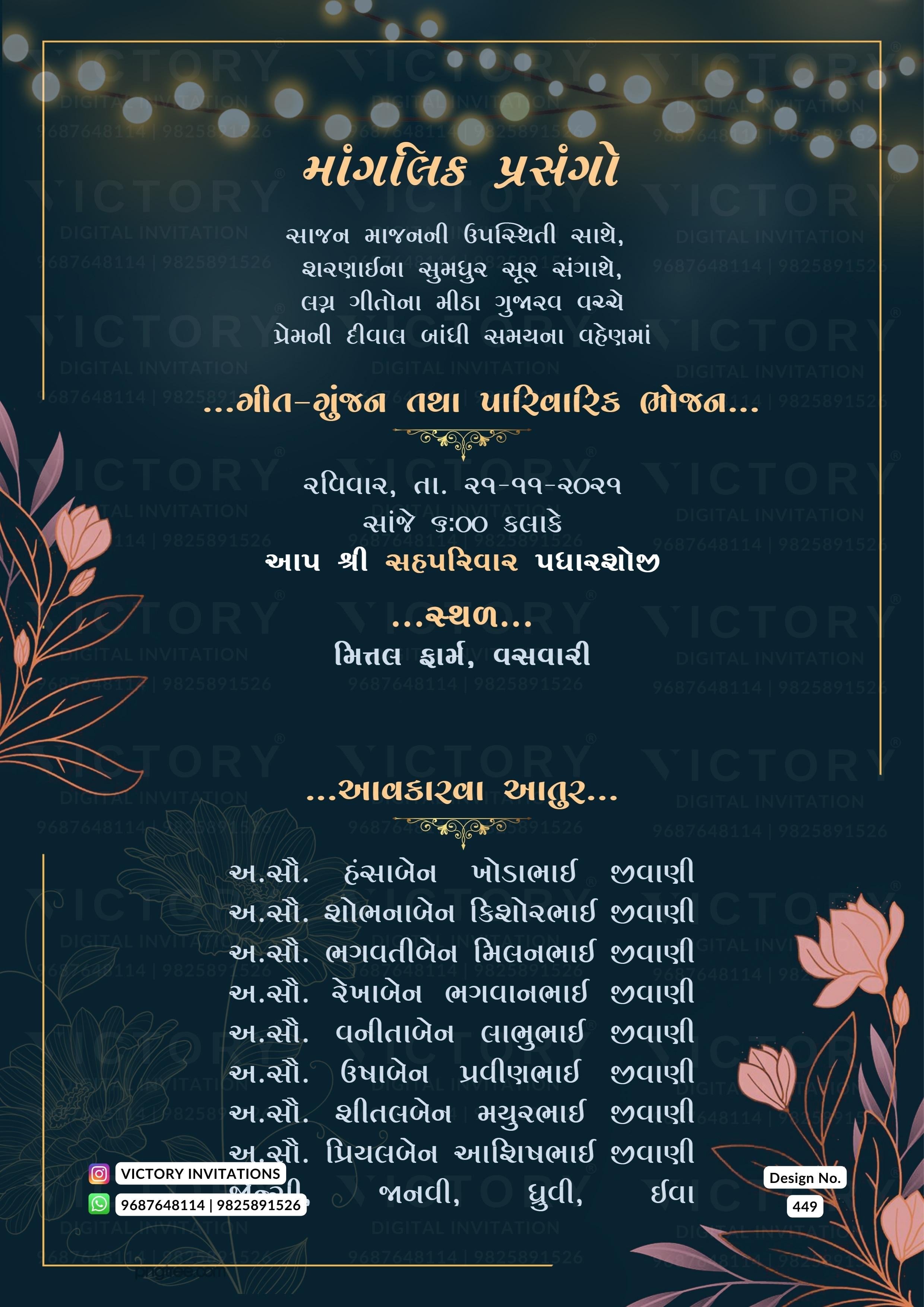 Wedding ceremony invitation card of hindu gujarati patel family in Gujarati language with minimalistic theme design 449