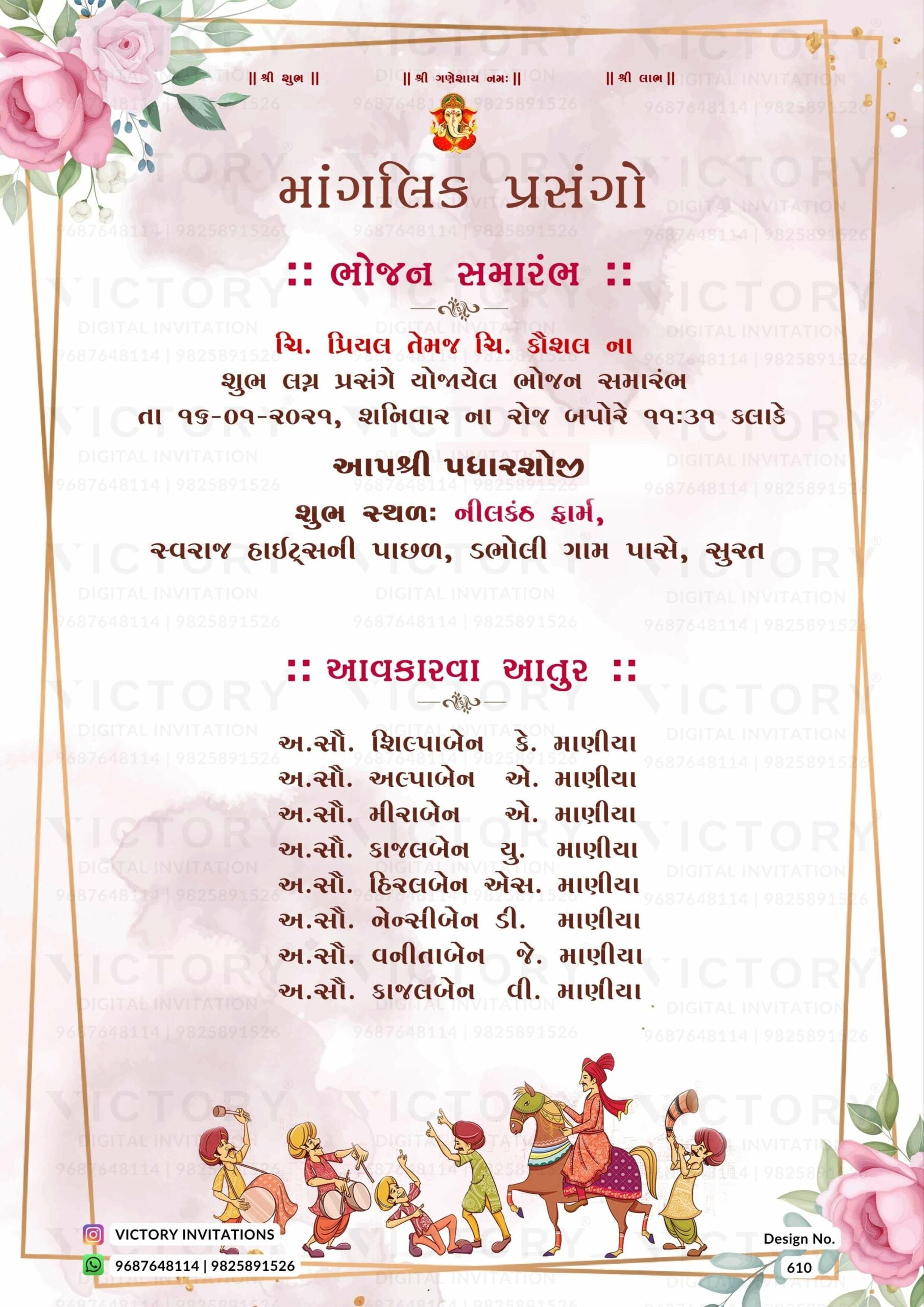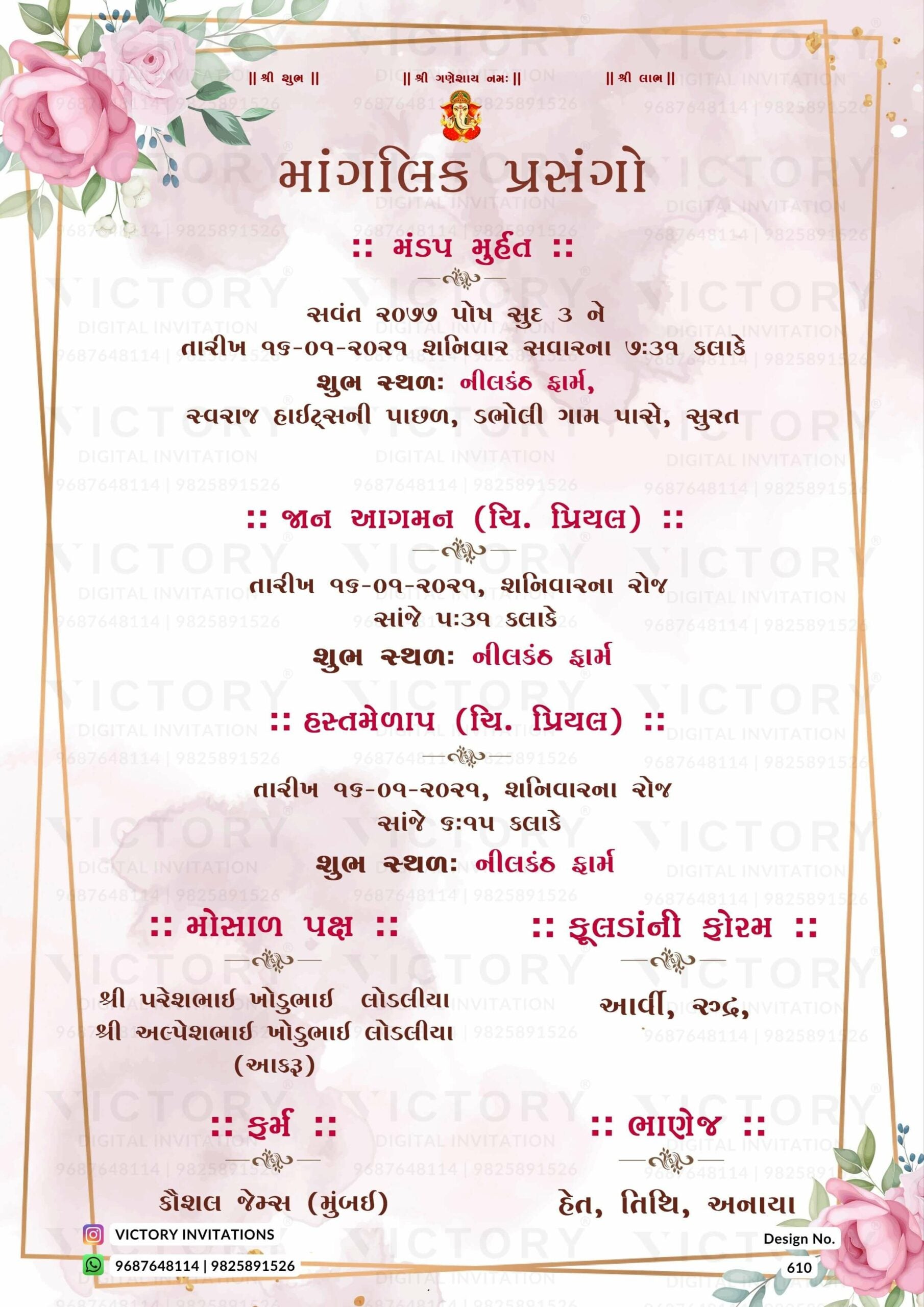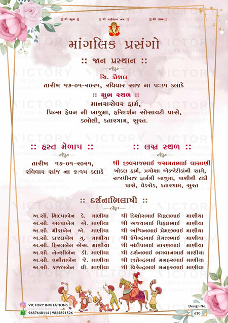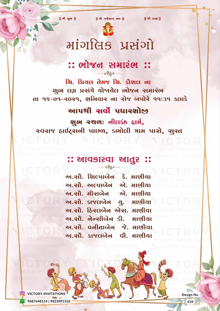 The minimalistic Theme of the Hindu Gujarati digital invitation card for a wedding ceremony in pink background color. This e-invite card is perfectly suitable for the Patel family and it's available in Gujarati language. It includes elements such as a god logo, frame, green leaves, pink flowers, glitter, wedding couple doodle, and baraat doodle.