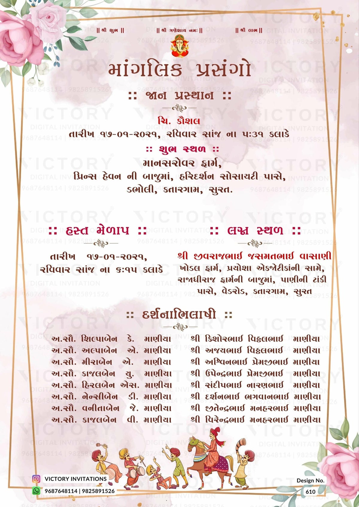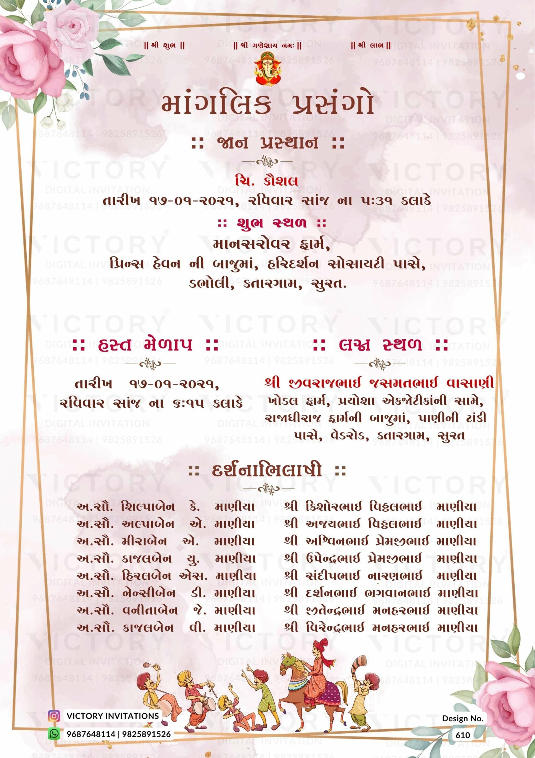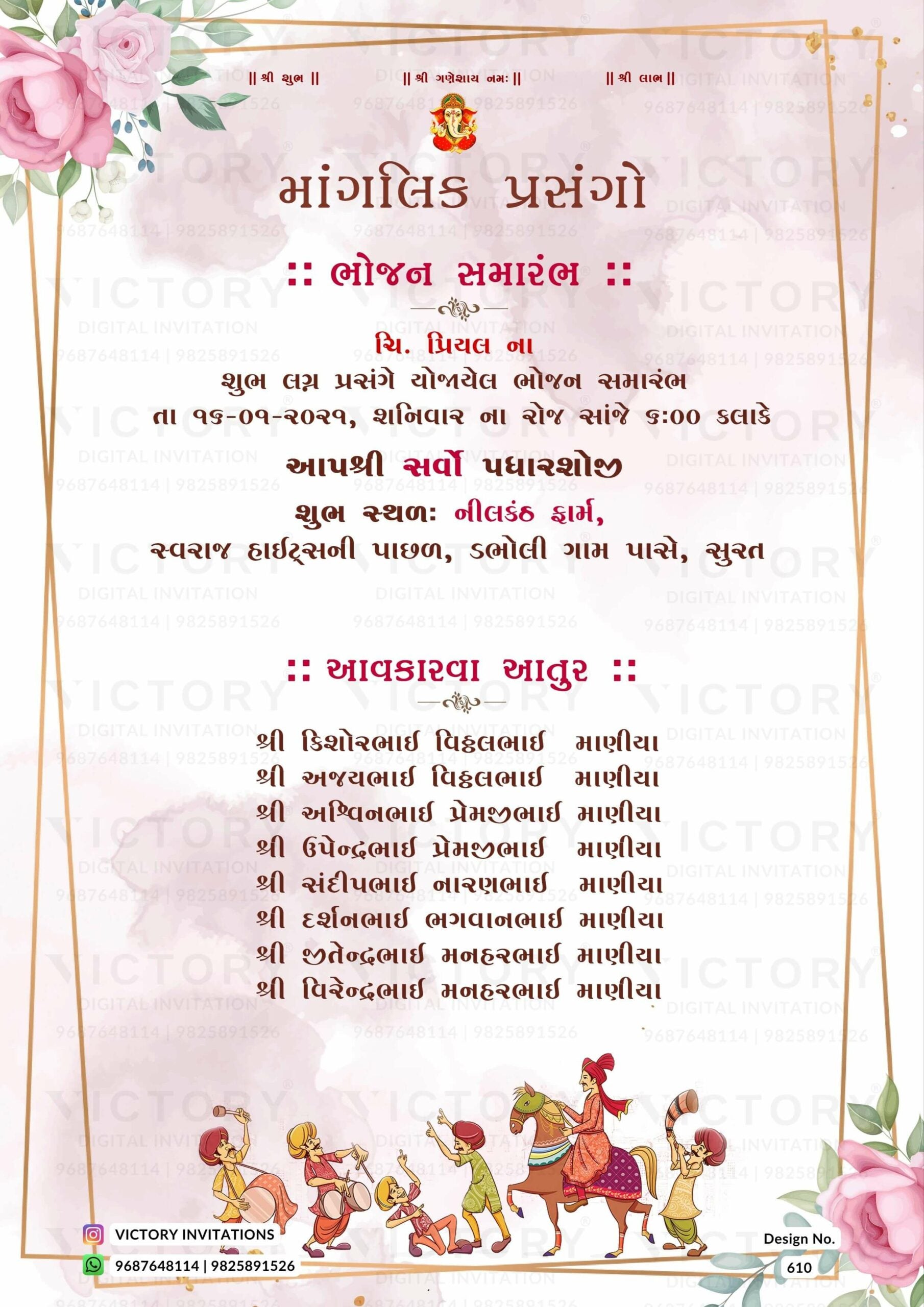 The minimalistic Theme of the Hindu Gujarati digital invitation card for a wedding ceremony in pink background color. This e-invite card is perfectly suitable for the Patel family and it's available in Gujarati language. It includes elements such as a god logo, frame, green leaves, pink flowers, glitter, wedding couple doodle, and baraat doodle.