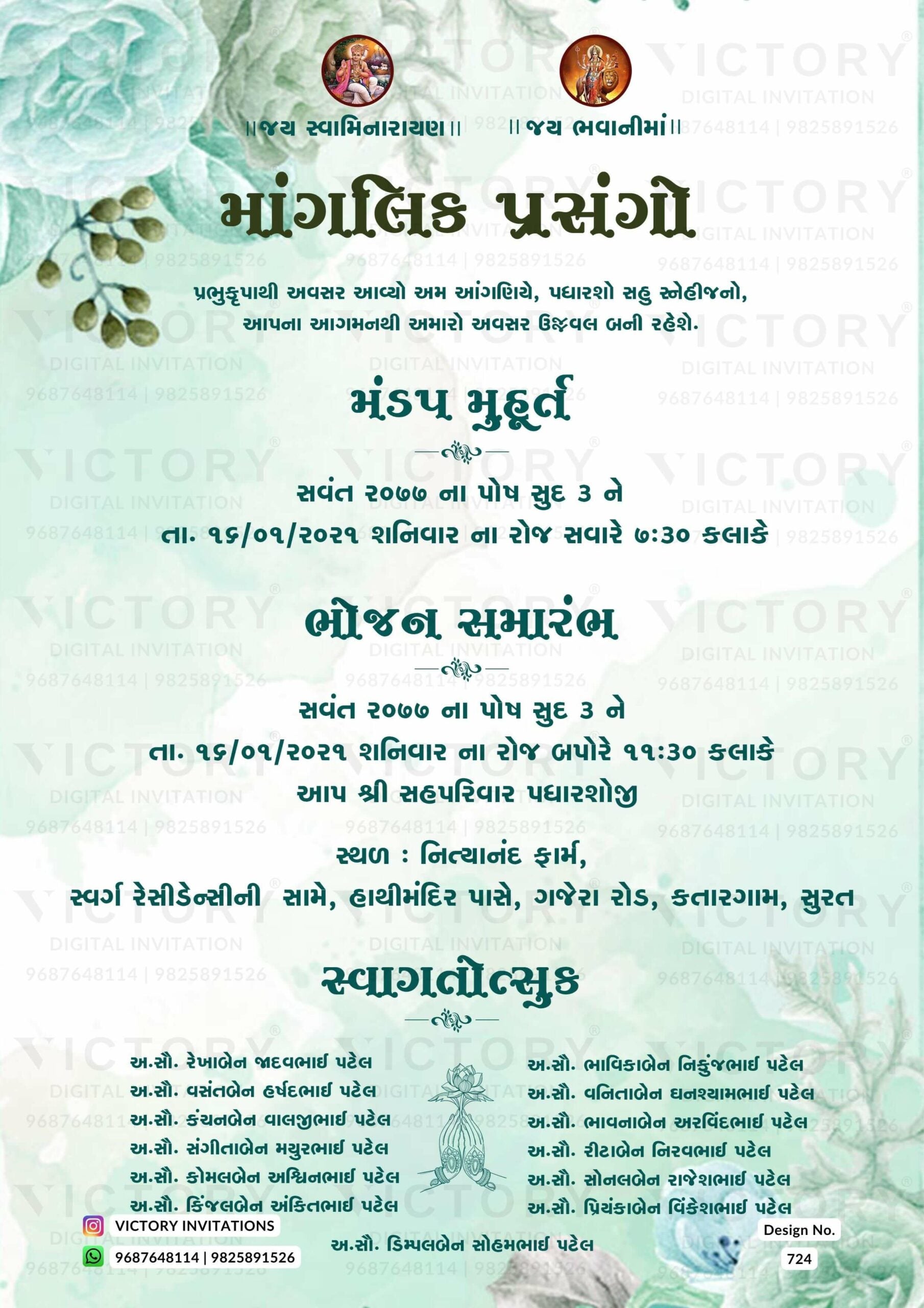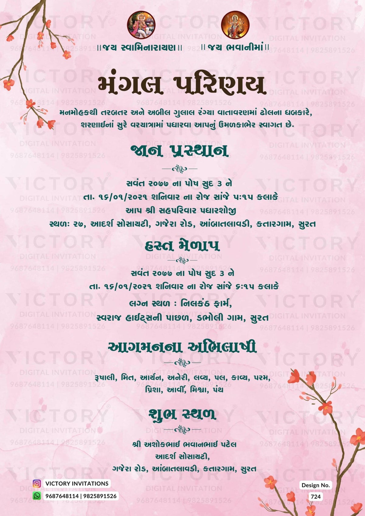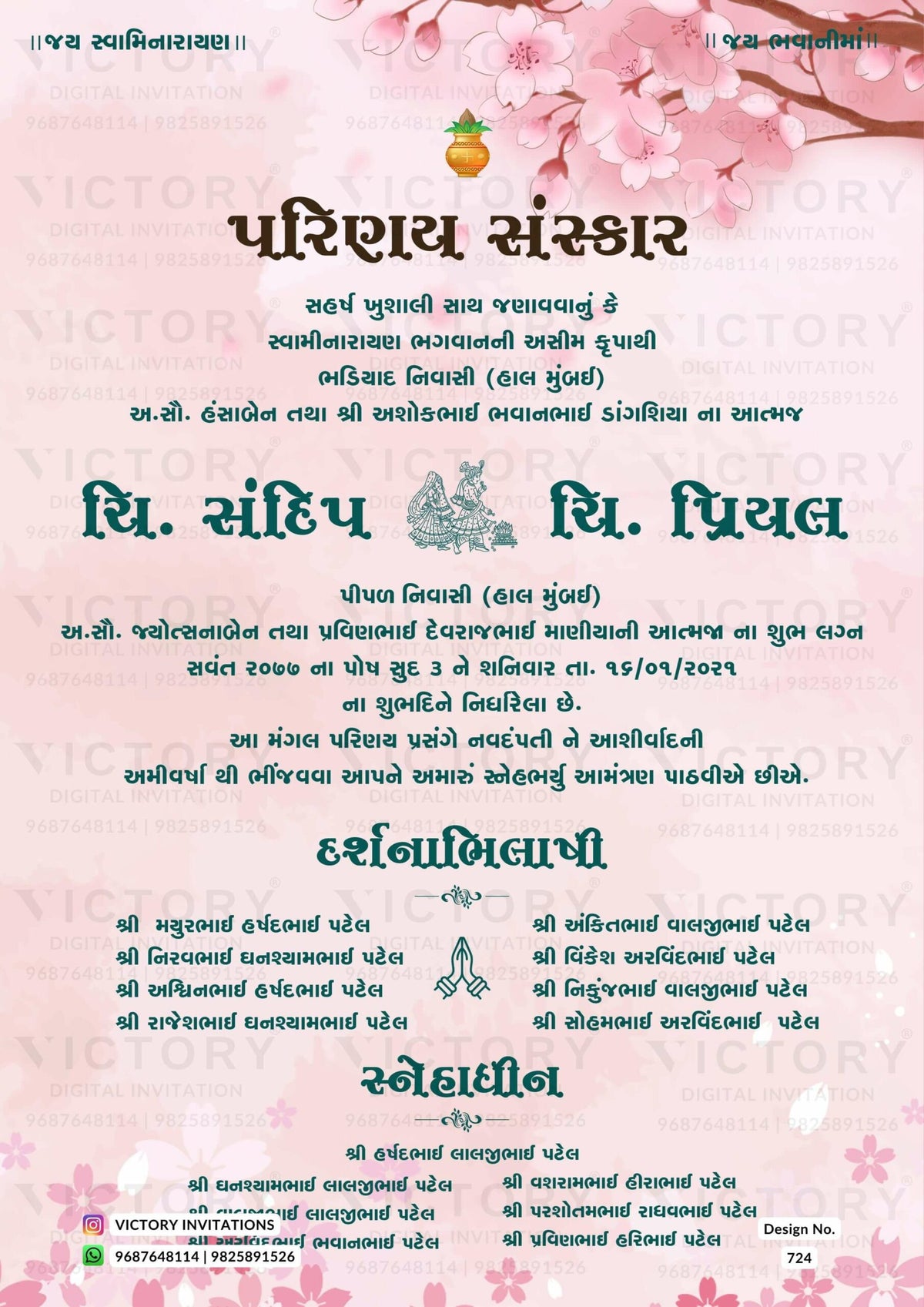 Wedding ceremony invitation card of hindu gujarati patel family in Gujarati language with minimalistic theme design 724