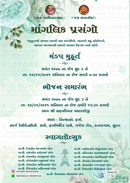 The minimalistic Theme of the Hindu Gujarati digital invitation card for a wedding ceremony in cyan, pink, green background color. This e-invite card is perfectly suitable for the patel family and it's available in Gujarati language. It includes elements such as cyan flowers, white flowers, pink flowers, kalash, and god logo.