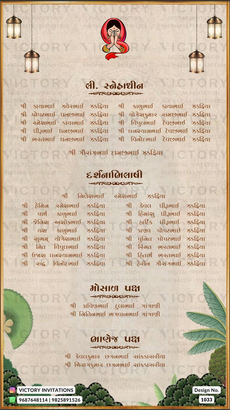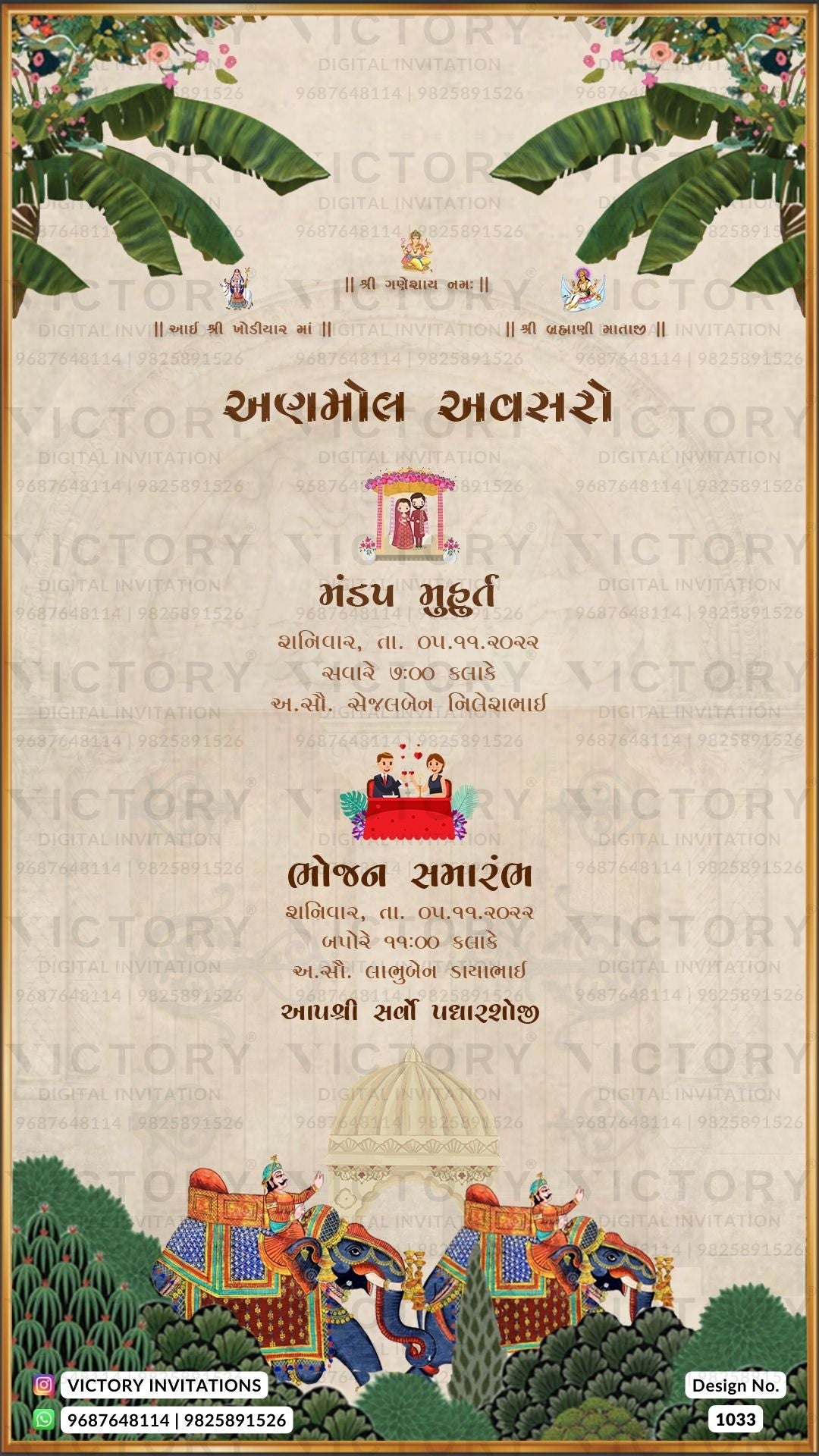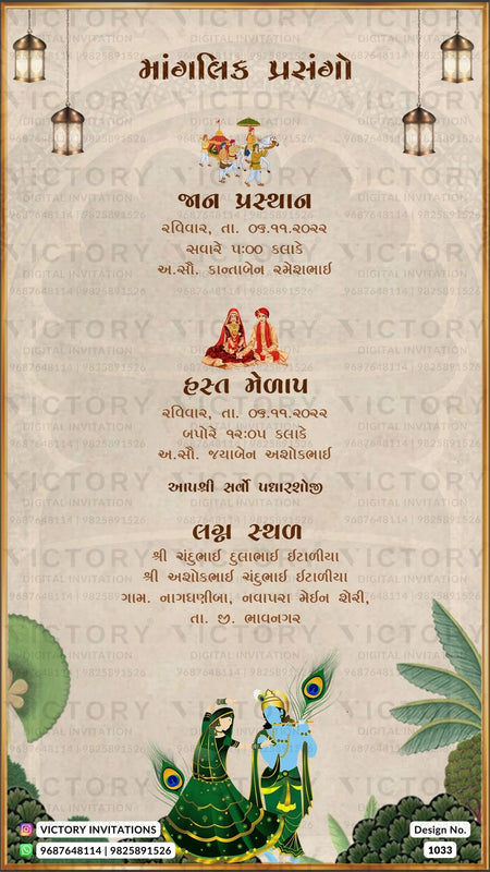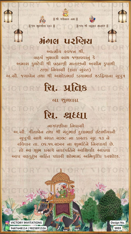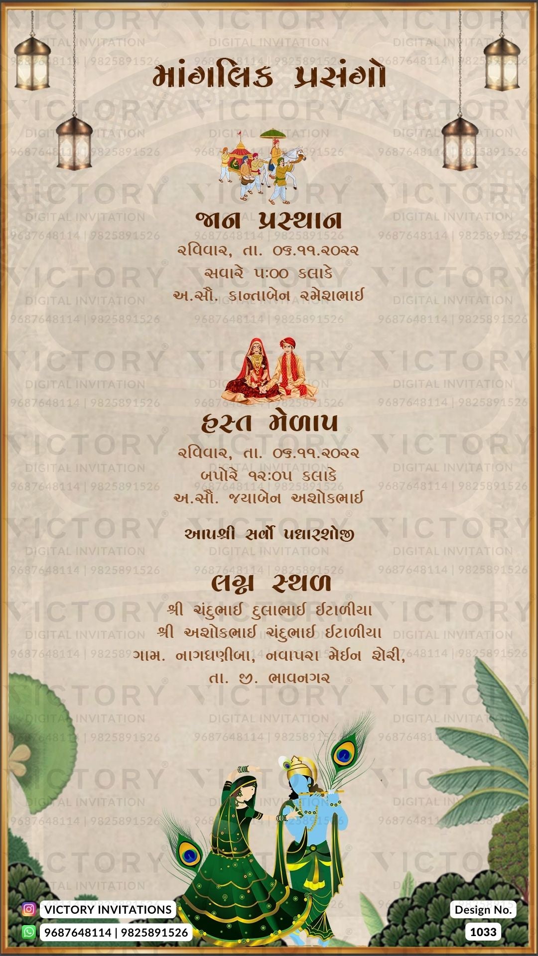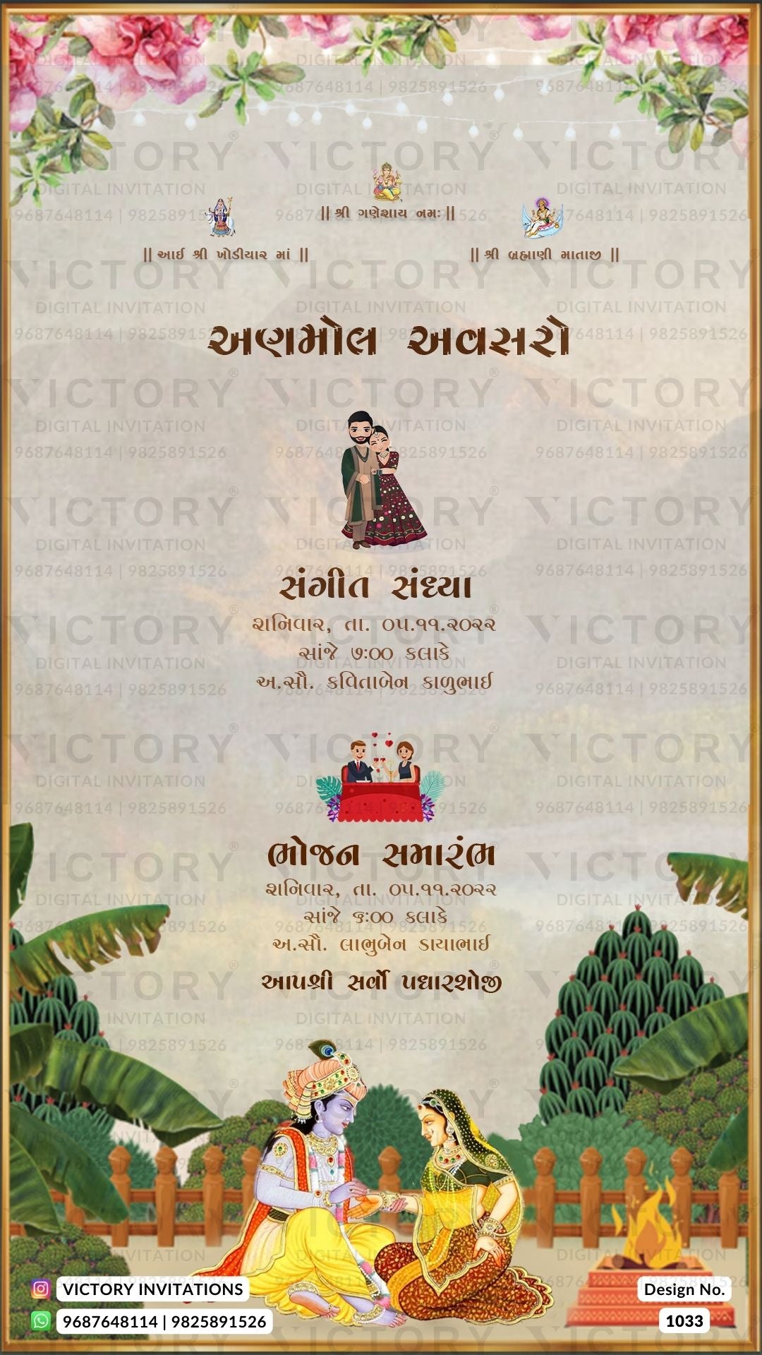 The traditional Theme of the Hindu Gujarati digital invitation card for a wedding ceremony in brown background color. This e-invite card is perfectly suitable for the patel family and it's available in Gujarati language. It includes elements such as a couple logo, lantern, golden border, elephants, god logo, tree, pink flowers, banana leaves, couple doodle, Mayra, temple arch, couple doodle, Radha Krishna image, fence, string lights, namaste icon.