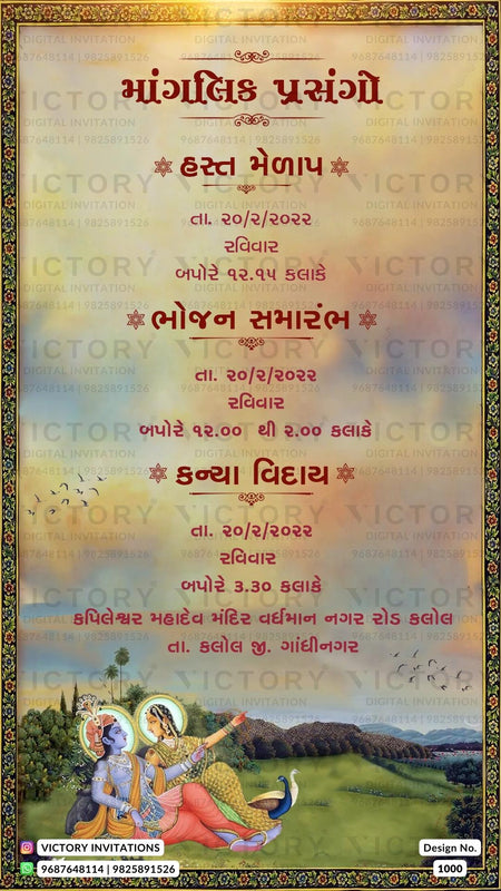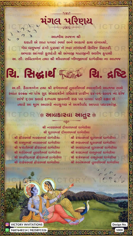 The Vintage Theme of the Hindu Gujarati digital invitation card for a wedding ceremony in the yellow, blue, and orange background color. This e-invite card is perfectly suitable for the patel family and it's available in Gujarati language. It includes elements such as the Ganesha logo, vintage border, birds, Radha Krishna, peacock, and swastik.
