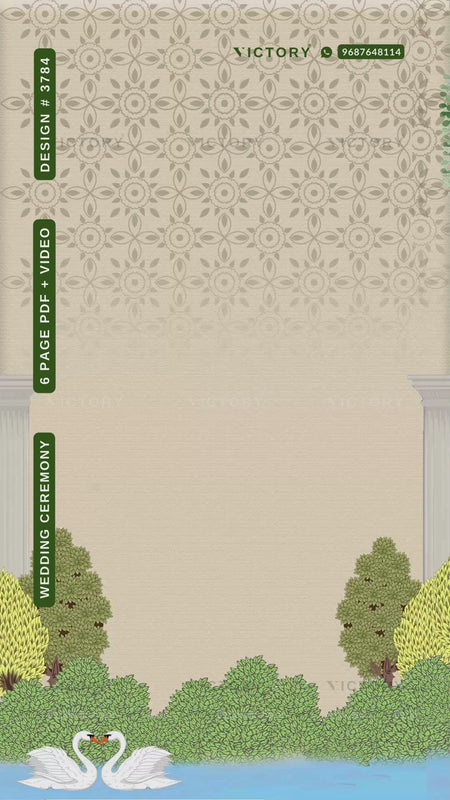 The garden Theme of the Hindu Gujarati digital invitation card for a wedding ceremony in cream background color. This e-invite card is perfectly suitable for Jain family and it's available in the English language. It includes elements such as green leaves, pillar, a peacock, duck, fountain, god image, haldi couple doodle, a tree, namaste icon.