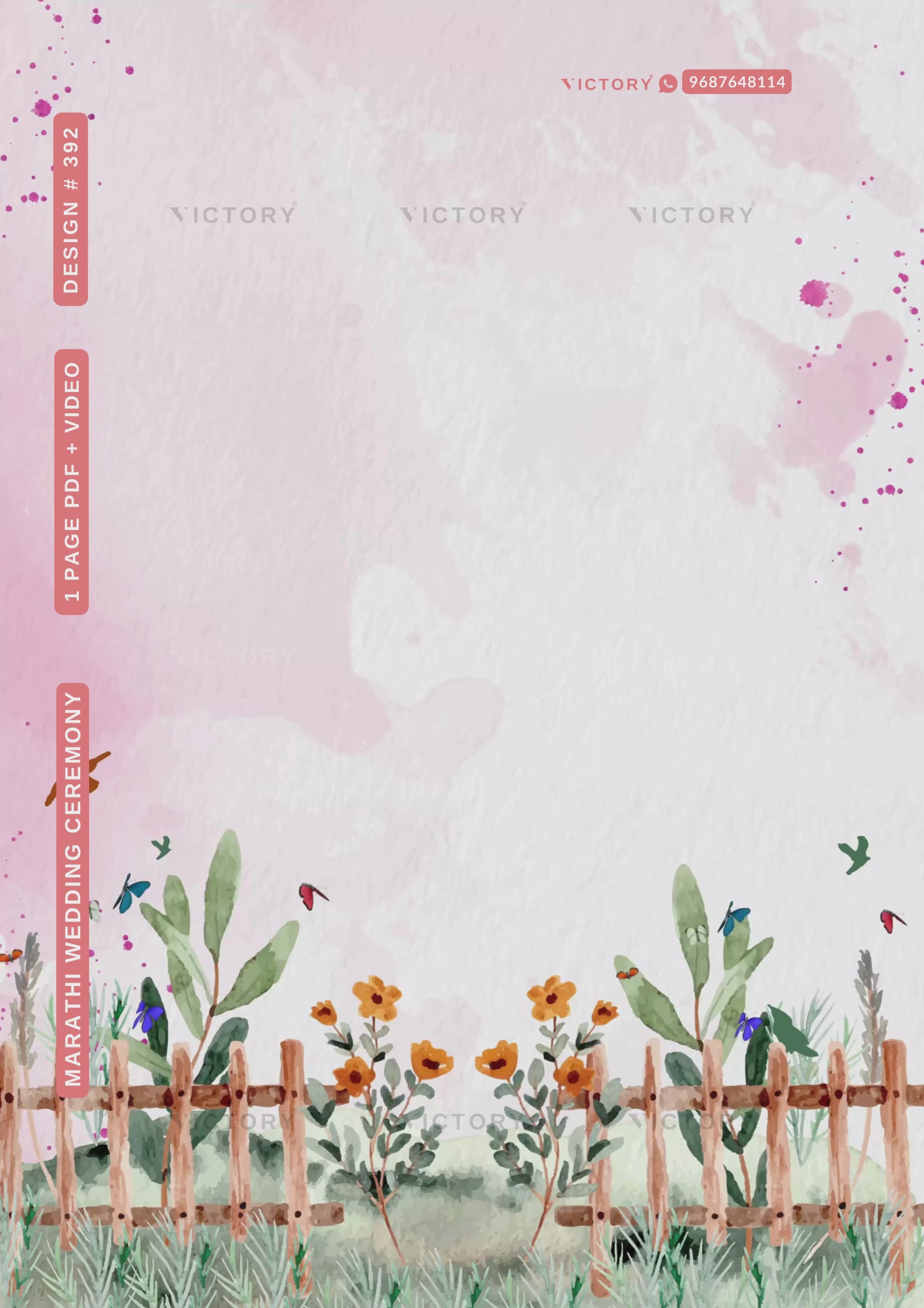 The Garden Theme of the Hindu Maharashtrian digital invitation card for a wedding ceremony in pink background color. This e-invite card is perfectly suitable for the marathi family and it's available in the marathi language. It includes elements such as orange flowers, green leaves, grass, fences, birds, butterflies, sparkles, Ganesh icon.