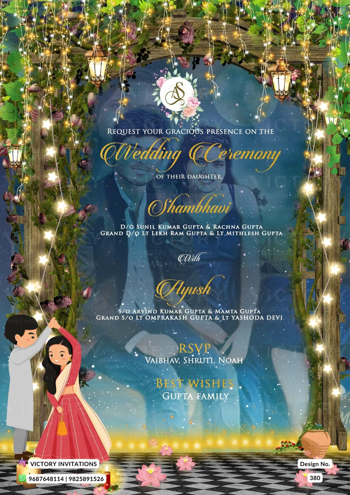 The couple photo glittery Theme of the Hindu north indian digital invitation card for a wedding ceremony in the navy blue background color. This e-invite card is perfectly suitable for the bhojpuri family and it's available in English language. It includes elements such as a couple photo, lantern, string lights, couple logo, green leaves, wooden gate, lotus, candle, flower pot, couple doodle, and white sparkle.