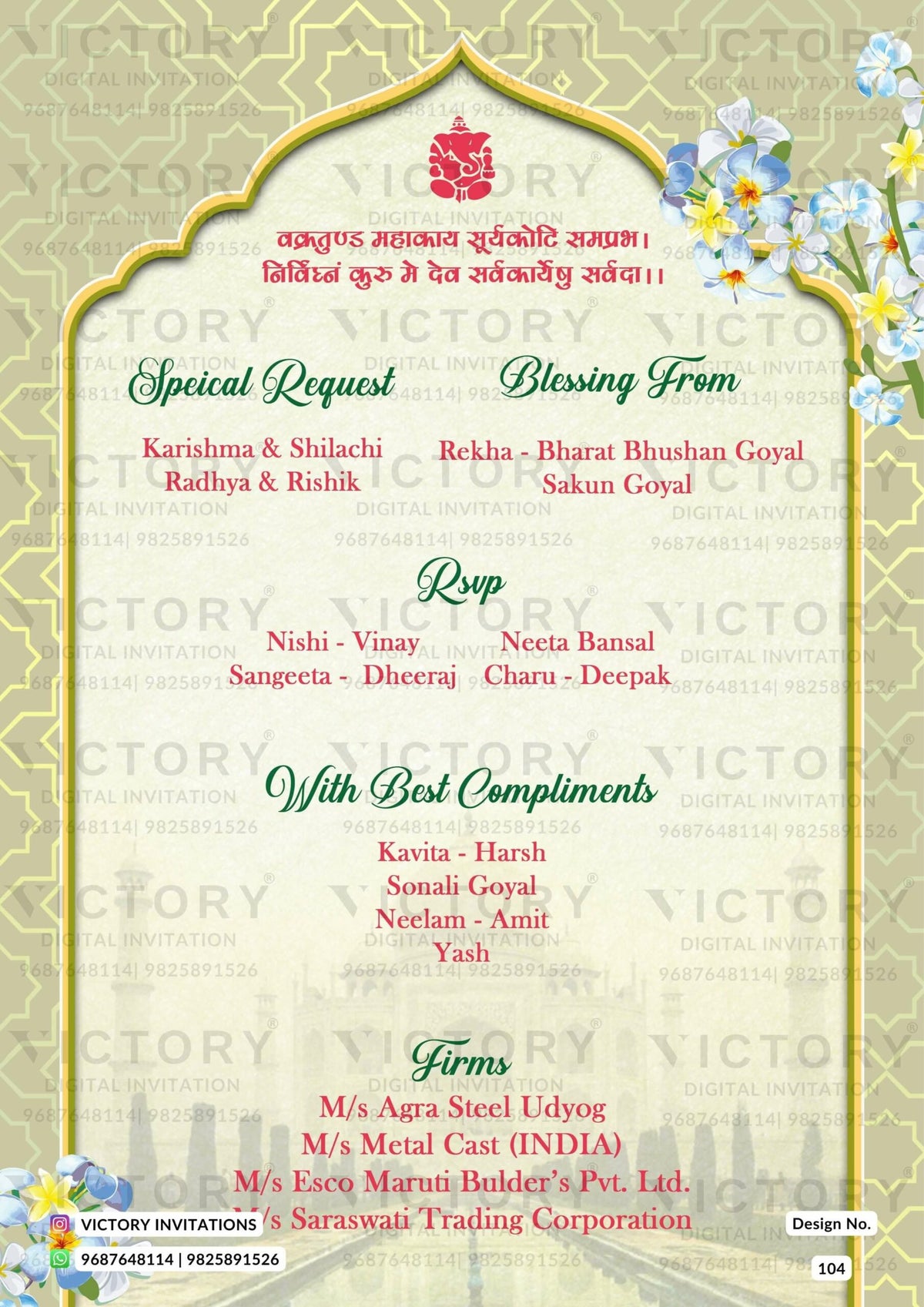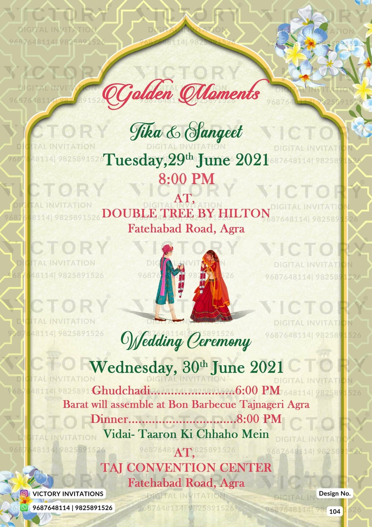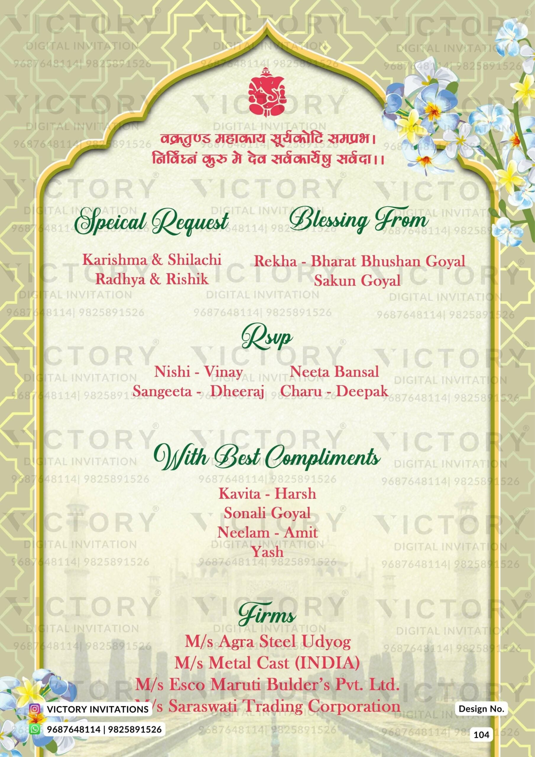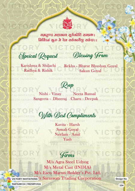 The traditional arch Theme of the Hindu north indian digital invitation card for a wedding ceremony in the green background color. This e-invite card is perfectly suitable for the Bhojpuri family and it's available in English language. It includes elements such as the Ganesha logo, blue flowers, yellow flowers, a wedding couple doodle, and the Taj Mahal image.
