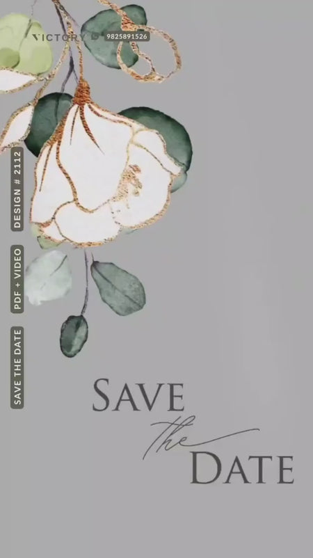 The artistic flowers Theme of the Hindu north indian digital invitation card for a wedding ceremony is in the grey background color. This e-invite card is perfectly suitable and it's available in the English language. It includes elements such as white flowers, green leaves, and golden glitter.