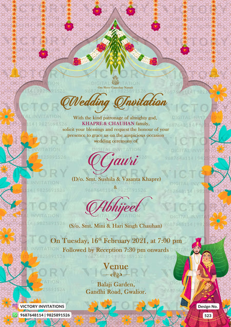 The traditional Theme of the Hindu north indian digital invitation card for a wedding ceremony in pink, light yellow, and green background color. This e-invite card is perfectly suitable and it's available in the English language. It includes elements such as a marigold garland, red flowers, a couple doodle, a haldi doodle, elephants, yellow flowers, Ganesha logo.