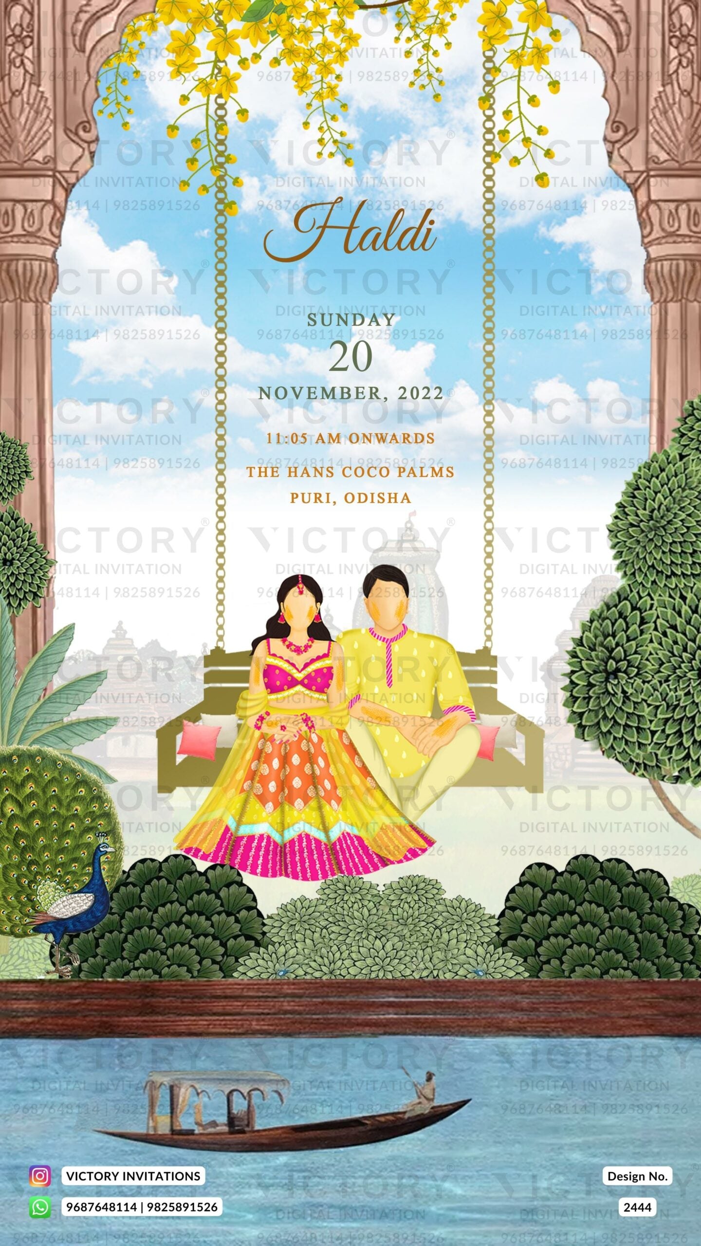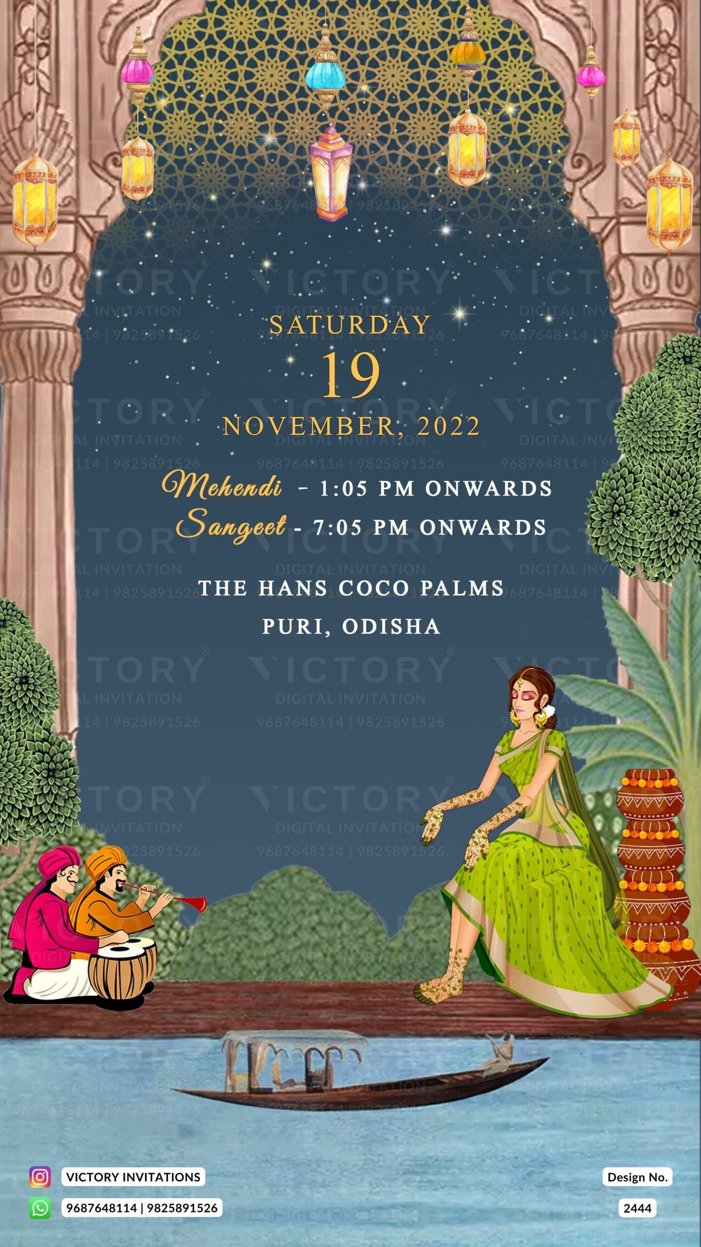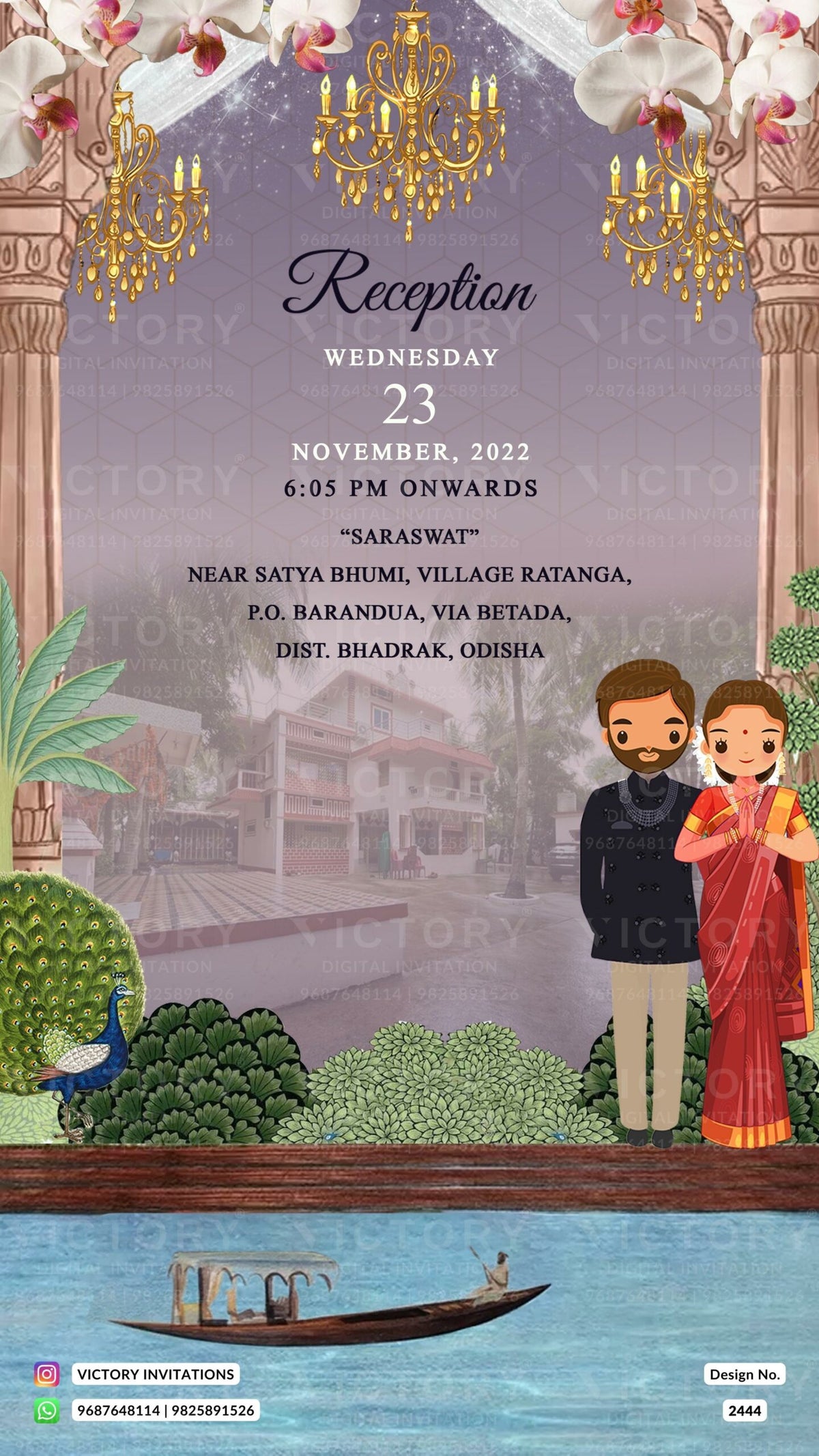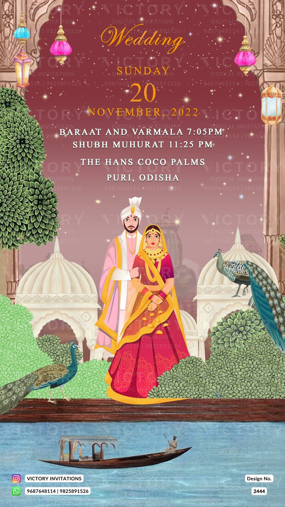 The traditional Theme of the Hindu digital invitation card for a wedding ceremony is in a sky blue, red, and purple background color. This e-invite card is perfectly suitable for the Odiya family and it's available in English language. It includes elements such as a couple logo, peacock, temple, grass, boat, water, lantern, gate, sparkle, mehendi doodle, swing, yellow tulips, temple arch, Chandelier, namaste couple doodle, pink flowers.