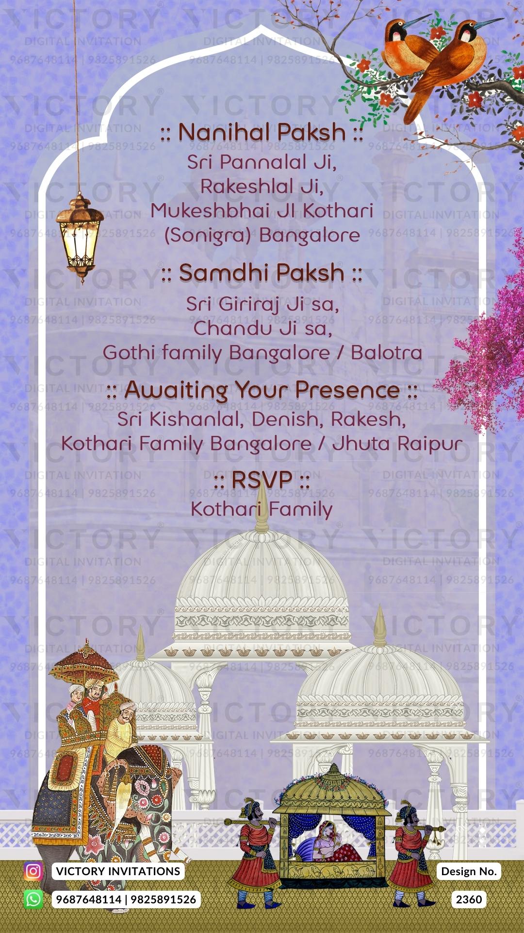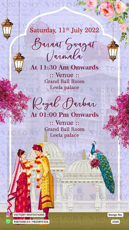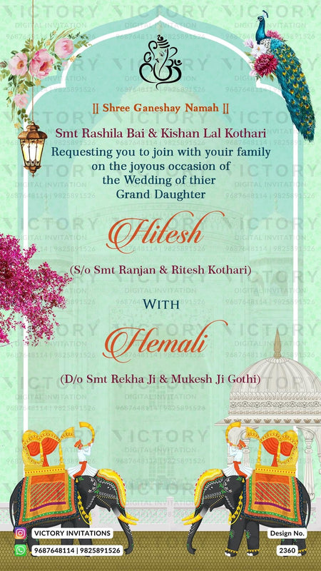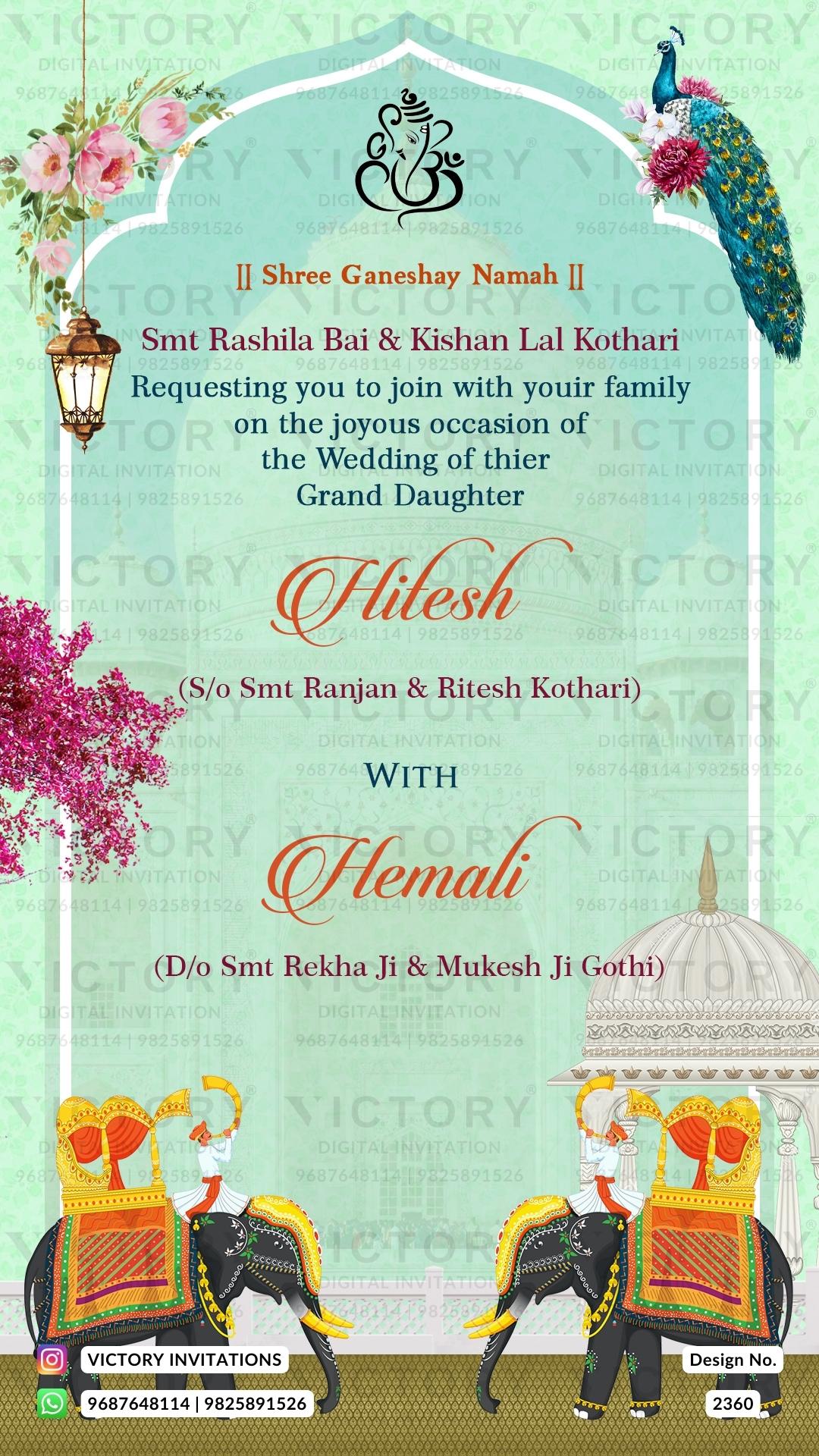 The Arch Theme of the Hindu Rajasthani digital invitation card for a wedding ceremony in pink, yellow, green, and purple background color. This e-invite card is perfectly suitable for the rajput family and it's available in English language. It includes elements such as the Ganesha logo, couple logo, pink flowers, lantern, temple arch, fence, elephants, peacock, duck, and wedding couple doodle.