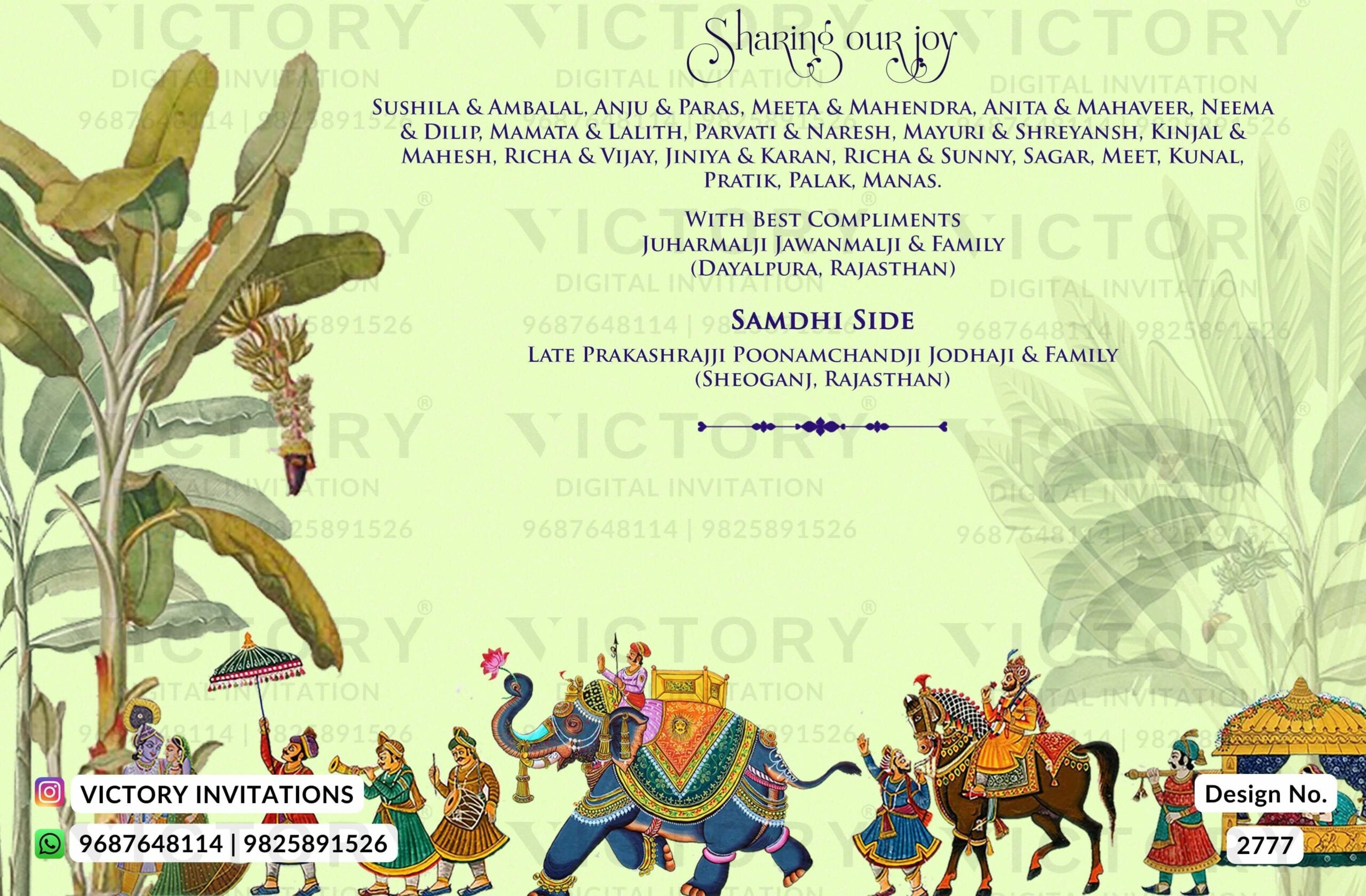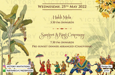 The artistic leaves Theme of the Hindu Rajasthani digital invitation card for a wedding ceremony in brown, yellow, orange, and green background color. This e-invite card is perfectly suitable for the rajput family and it's available in English language. It includes elements such as banana trees, elephants, umbrellas, yellow flowers, marigold garlands, and horses.